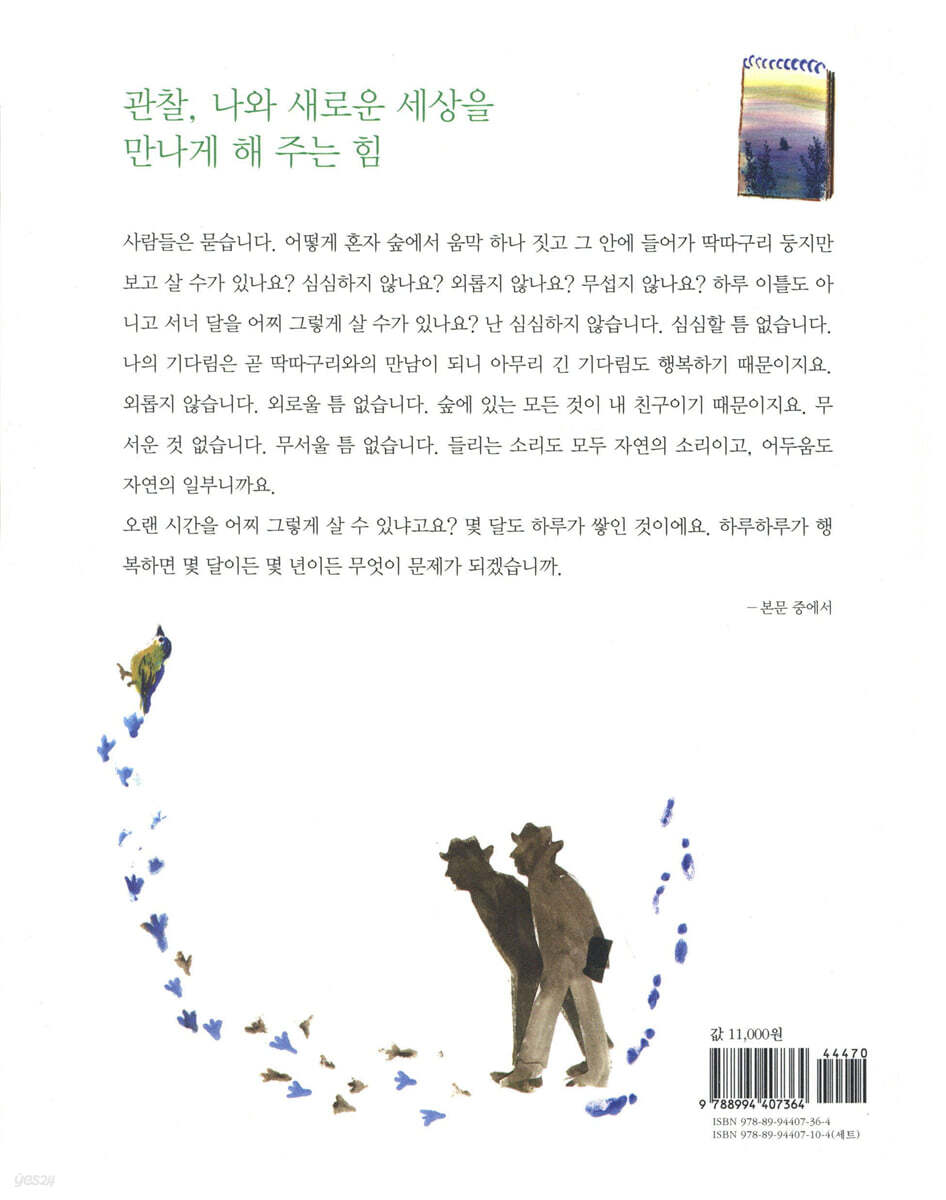 ‘관찰’을 가슴에 품고 사는 사람은 그냥 지나치지 않습니다. 지켜보지요. 그것도 오래도록 말이에요. 그러다 아무런 쓰임새도 없어 보이는 썩은 그루터기조차 귀한 생명을 품어 내는 보금자리가 된다는 것을 알게 됩니다. 또한 이러한 관찰의 삶을 이어 가다 보면 자연에는 그 무엇도 허투루 버려지는 것이 없다는 사실을, 결국 자연에는 그 무엇도 의미 없는 것은 없다는 사실을 깨닫게 되지요.