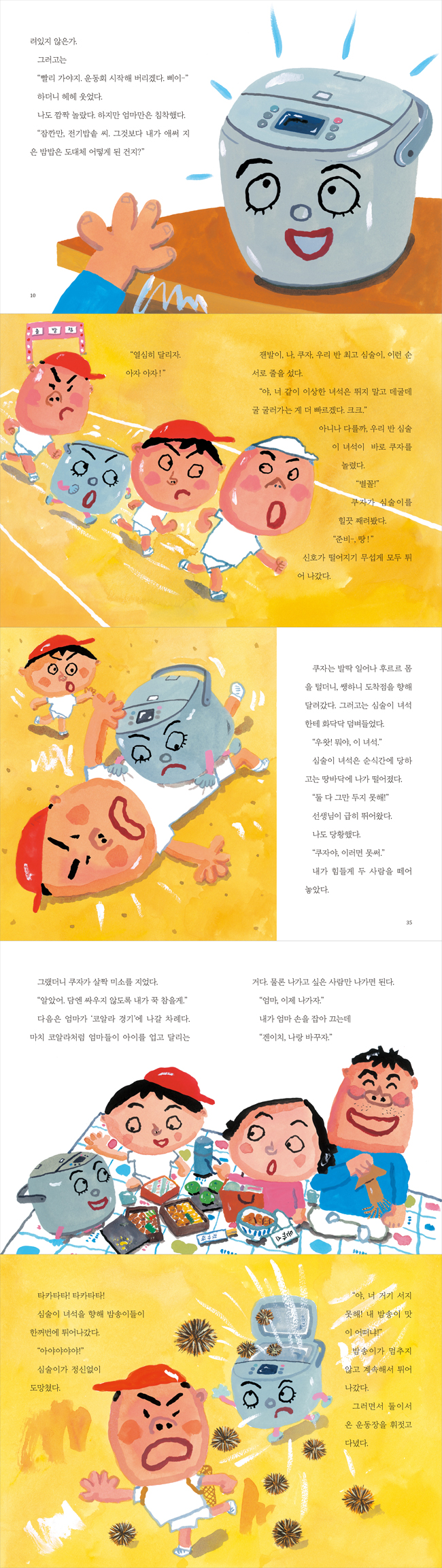 “제가 다 먹었죠.” “뭐? 밥을 다 먹어?” 엄마가 화가 나서 빽 소리를 질렀다. 하지만 전기밥솥은 엄마 말을 못 들은 것처럼 “자, 이제 운동회에 갑시다.” 능청스럽게 말했다. 그러곤 몸통에서 스륵 쭉, 스륵 쭉, 팔과 다리를 내더니, 전기밥솥은 바닥으로 폴짝 뛰어내려 맨손체조를 시작했다. --- p.12-13 운동회가 시작됐다. 내가 나가는 건 ‘달리기’와 ‘바구니에 공 넣기’ 그리고 ‘줄다리기’다. 아빠는 ‘쪽지에 적힌 물건 찾아오기’에, 엄마는 ‘코알라 경기’에 나간다. “그건 그렇고. 이봐요, 전기밥솥 양. 네가 잘하는 건 뭔지?” 엄마가 그렇게 묻자 전기밥솥이 말했다. “전기밥솥 양이라뇨, 그냥 편하게 쿠자라고 불러주세요. 유명한 전기밥솥 쿠쿠나 쿠첸이 다 쿠로 시작하잖아요. 게다가 겐이치 어머니와는 오래 알고 지낸 사이인데요, 뭘.“ 그러자 엄마가 배시시 웃었다. “흐음, 그나저나 우리 쿠자가 나갈 만한 경기가 있으려나 모르겠네.” 쿠자도 싱긋 웃었다. 하기야 엄마와는 서로 마음이 잘 통할지도 모르겠다. 우리 집에 온 지 꽤나 오래됐으니까. --- p.22-23 “아니, 이게 대체 뭐니?” “얘 이름은 이게가 아니고요, 선생님. 쿠자예요. 저랑 사촌 남매 같은 사이라고나 할까요.” 내가 쿠자를 돌아보았다. “네, 선생님. 처음 뵙겠습니다. 저는 겐이치 동생 쿠자라고 해요.” 쿠자가 한 발짝 앞으로 나섰다. “이름은 그렇다 치고, 네가 달릴 수 있겠니?” 선생님이 그렇게 말한 순간, 쿠자 정수리에서 ‘삐이-’ 하는 소리가 났다. 그러고는 또박또박 이렇게 말했다. “두 말 하면 잔소리죠. 아무리 학교 선생님이시지만, 겉만 보고 그렇게 섣불리 판단하시는 건 아니죠.” 쿠자가 조리 있게 할 말을 다 하니까 선생님이 쩔쩔맸다. --- p.28-29 쿠자가 냉큼 나서는 게 아닌가. “있잖아, 나 지금까지 누가 업어준 적이 한 번도 없었거든. 겐이치, 내가 내신 나가도 괜찮지?” “엄마, 어떡해?” 나는 엄마를 쳐다봤다. 나도 요즘엔 엄마한테 업혀본 적이 없다. 그런데 엄마가 금세 허락했다. “어떡하긴. 겐이치 대신 쿠자랑 나가면 되지.” 좀 아쉽지만 그러기로 했다. “잘 하고 와.” 내 말이 끝나기도 전에 쿠자는 엄마 등에 찰싹 달라붙더니, 신이 나서 꺅꺅 소리를 질러댔다. “호호, 아직이야. 저기에 먼저 줄을 서고, 그 다음에 업혀야지.” 엄마도 즐거운 목소리다. “준비-, 땅!” 출발 신호와 함께 달리기 시작했다. --- p.40-41 내가 대드니까 심술이 녀석은 오히려 재밌다는 듯 킬킬 웃는다. “멍청하게 있는 쟤가 잘못이지, 내가 뭘! 같은 편에게 공 던지지 말란 법이라도 있냐!” 그러자 쿠자 머리에서 ‘삐이-’ 소리가 났다. “진짜 무슨 짓을 하든 상관없다 이거지. 좋았어. 내 이걸 그냥!” 쿠자가 끈을 풀고는 내 등에서 뛰어내렸다. “뭐야, 나한테 할 말이라도 있냐?” 심술이 녀석과 쿠자가 서로 째려보았다. “그래, 할 말 있다, 왜!” 쿠자 표정이 싹 바뀌었다. “야, 안 돼. 또 싸우면‥‥‥” 내가 그렇게 말했지만 쿠자는 들은 척도 안 했다. 순식간에 ‘탁’ 하고 머리 뚜껑이 닫혔다. --- p.56-57 아침에 일어나니 쿠자는 이불 속에 없었다. “엄마, 쿠자 어디 있어?” “여기 있지.” 나는 부엌으로 달려갔다. 쿠자는 늘 있던 제자리로 이미 돌아가 있었다. 그런데 밥솥 손잡이 부분에 귀여운 리본이 달려 있다. “아, 리본.” “겐이치, 이것 좀 봐. 엄마가 쿠자 머리띠에 리본을 달아 줬어. 어때, 어울리지?” “응, 쿠자가 되게 좋아하겠다.” “이것 봐, 밥도 오늘따라 얼마나 잘 잘 지어졌나 몰라.” --- p.76-77 |