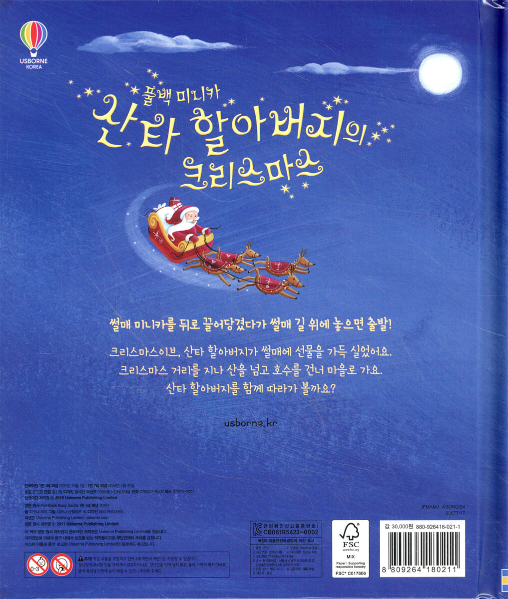 산타 할아버지를 태운 빨간 썰매를 뒤로 여러 번 끌어당긴 후 길 위에 올려놓아요. 썰매는 파인 길을 따라 저절로 신나게 달려 갈 거예요. 씽씽 달리는 썰매는 아이들의 시선을 한 번에 사로잡지요. 산타 할아버지는 썰매를 타고 크리스마스 선물을 전해 주려 해요. 산타 할아버지와 함께 반짝반짝 크리스마스의 거리를 달려볼까요? 썰매 장난감은 견고하게 만들어져 내구성이 높고, KC 자율 안전 확인 검사를 마쳐 아이들이 안전하게 가지고 놀 수 있어요.