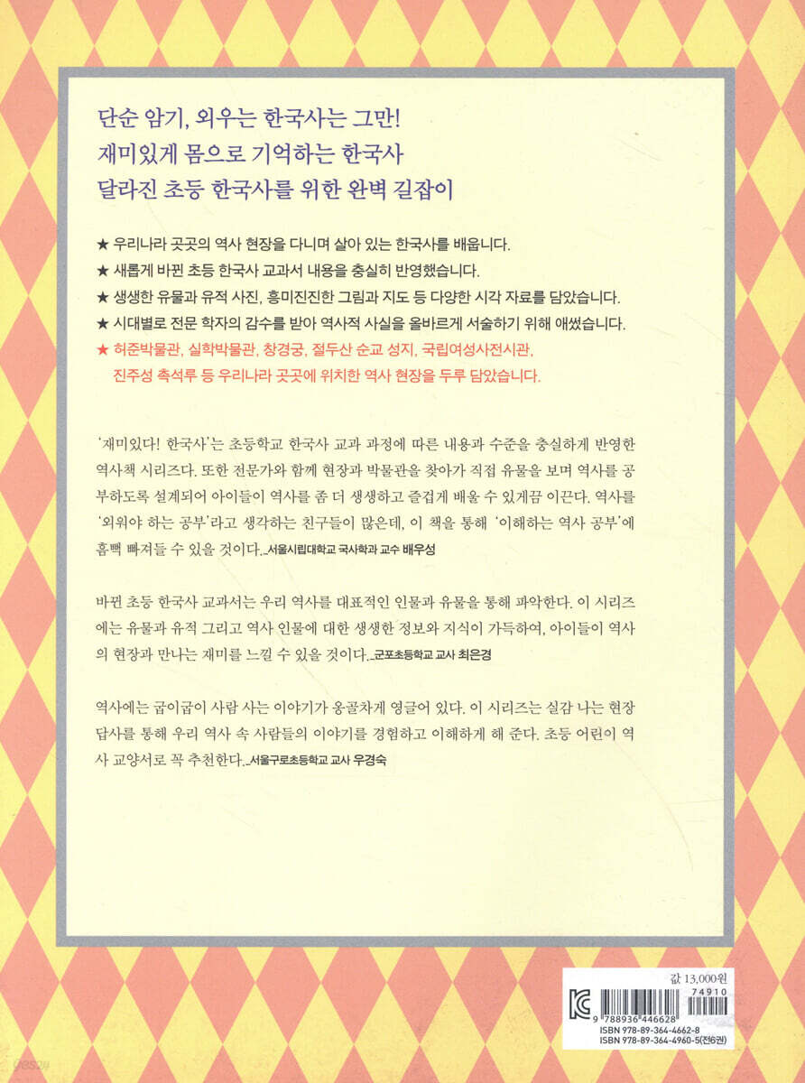 재미있게 몸으로 기억하는 한국사 “역사를 잊은 민족에게 미래는 없다.”라는 말이 있습니다. 역사는 오늘을 있게 한 의미 있는 일들이 쌓여 이루어진 것으로, 역사를 배운다는 것은 과거의 흔적을 좇아 이를 확인하고 이해하는 과정이라 할 것입니다. 과거에 일어난 일이 지금도 온전히 살아 영향을 끼치는 ‘역사’를 제대로 알고 이해해야 우리는 더 나은 미래를 꿈꿀 수 있습니다. 그런데 우리의 역사 교육은 많은 내용의 역사적 지식과 정보를 전달하는 데 급급해 아이들이 한국사를 ‘나의 역사’ ‘우리의 역사’로 체감하고 받아들이도록 하는 데는 미흡했습니다. 백 번 듣는 것보다 한 번 보는 것이 낫다는 말처럼 『재미있다! 한국사』는 박물관, 유적지 등 우리나라 곳곳에 위치한 역사 현장을 찾아다니며 우리 역사를 좀 더 생생하고 직접적으로 이해하도록 도와주는 역사책 시리즈입니다. 새롭게 바뀐 초등 사회과 교육 과정(역사 영역)은 “선사 시대에서 오늘날 대한민국까지의 역사와 문화 및 생활상의 변화를 대표적인 인물과 유물을 통해 파악”하는 것을 주요 목표로 삼고 있습니다. 『재미있다! 한국사』는 암기하는 한국사가 아닌 한국사의 통사적 흐름 속에서 몸으로 기억하는 한국사를 지향합니다. 초등학교 아이들에게 연도나 사건, 어려운 역사 용어와 개념들은 역사를 이해하는 과정에서 부딪히는 커다란 장벽입니다. 그것에 앞서 눈에 보이는 유물이나 유적 등을 통해 역사 인물을 만나고 역사적 사건들을 유추하고 상상하게 한다면 우리 역사의 전체 흐름을 이해하는 데 큰 도움을 얻을 것입니다. 『재미있다! 한국사』는 각 권별로 내용과 관련한 박물관이나 유적지를 선정, 각 시대별?주제별로 역사 현장을 찾아가 한국사 현장 수업을 진행합니다. 그야말로 먼 시대라 실감하기에는 더더욱 어려운 구석기 시대와 신석기 시대는 전곡선사박물관과 서울 암사동 유적에서 옛사람들이 남긴 흔적들을 보며 역사적 상상력을 더합니다(1권). 고려 시대 대몽 항쟁의 역사에서 사건의 주 무대였던 강화 고려궁지(2권)나 조선 역사에서 경복궁(3권)과 창덕궁(4권)은 빠질 수 없는 역사 현장 수업 장소입니다. 독립기념관과 서대문형무소역사관은 일제 강점기 때 우리의 뼈아픈 과거를 되새기며 당시의 상황을 실감하게 합니다(5권). 또한 부산 40계단 문화관광테마거리나 국립 4?19 민주 묘지는 그 자체가 오늘 우리의 역사입니다(6권). 이 밖에도 다양한 역사 현장은 아이들이 훨씬 더 생생하게 역사를 이해하고 경험하도록 돕는 훌륭한 매개가 되어 줄 것입니다. 아울러 답사 현장 자체에 대한 기본적인 정보도 놓치지 않았습니다. 별면으로 다룬 ‘역사 현장 답사’에서는 해당 장소에 대한 소개와 꼭 봐야 할 것, 추천 코스 등 답사 현장에 관한 정보를 꼼꼼히 실어 그 자체가 훌륭한 여행지 정보가 되도록 꾸몄습니다. “달라진 초등 한국사를 위한 완벽 길잡이” 기본에 충실한 어린이 역사 교양서 나무만 보지 말고 숲을 보라는 말이 있습니다. 한국사를 배우는 데 가장 중요한 것은 역사의 큰 줄기를 잡고 그 흐름을 이해하는 것입니다. 이것이 제대로 되어야 전체적인 맥락 가운데 개별 사건을 이해하며 역사 지식을 차곡차곡 쌓을 수 있습니다. 그런데 한국사는 무조건 암기해야 해결할 수 있다는 생각을 가진 어린이들이 적지 않습니다. 이것은 중학교, 고등학교에 가서도 이어져 결국 역사는 지루하고 어려운 암기 과목으로 전락해 버리기 일쑤입니다. 하지만 인물, 사건, 연도 등을 무작정 암기해서는 한국사에 대한 흥미만 잃을 뿐 진정으로 한국사를 이해할 수 없습니다. 새로운 교과 과정과 교과서 핵심 내용 반영 『재미있다! 한국사』는 새롭게 바뀐 초등학교 한국사 교과서 구성에 맞춰 아이들이 전체 흐름을 이해하는 데 중점을 두고 만들었습니다. 새 교과서의 구성에 따라 시대별로 분류해 ‘선사 시대부터 통일 신라?발해까지’ ‘고려’ ‘조선 전기’ ‘조선 후기’ ‘대한 제국과 일제 강점기’ ‘대한민국’ 이렇게 전체 6권으로 구성하였으며, 각 권의 첫 번째 장(교시)은 「가볍게 떼자, 한국사 첫걸음」(1권), 「미리 보는 고려, 고려 사람들」(2권), 「한눈에 보는 조선, 조선 사람들」(3권), 「위기를 기회로, 새로운 조선 만들기」(4권), 「근대의 시작, 새로운 문물의 수용과 자주독립」(5권), 「한눈에 보는 해방 이후 우리 역사」(6권)처럼 해당 시대를 전체적으로 개관해 한국사를 처음 접하는 아이들이 앞으로 배우게 될 시대에 관해 호기심을 갖고 조망해 보도록 했습니다. 또한 교과서의 주요 내용을 정리해 본문과 함께 실음으로써 교과서 내용과 비교하면서 읽고 이해하도록 꾸민 것은 이 시리즈만이 가지는 특장점입니다. 어려운 역사 용어와 어휘 자제 역사를 처음 배우는 아이들이 연도만큼 어려워하는 것이 바로 역사 용어와 개념 어휘입니다. ‘구석기’ ‘신석기’ ‘혁명’ ‘정변’ 등 역사를 이야기할 때 한자로 된 역사 용어와 추상적인 개념 들은 피할 수 없는 관문과도 같습니다. 그러나 역사책을 보면서도 뜻을 전혀 이해하지 못한 채 그야말로 글만 읽는 경우가 허