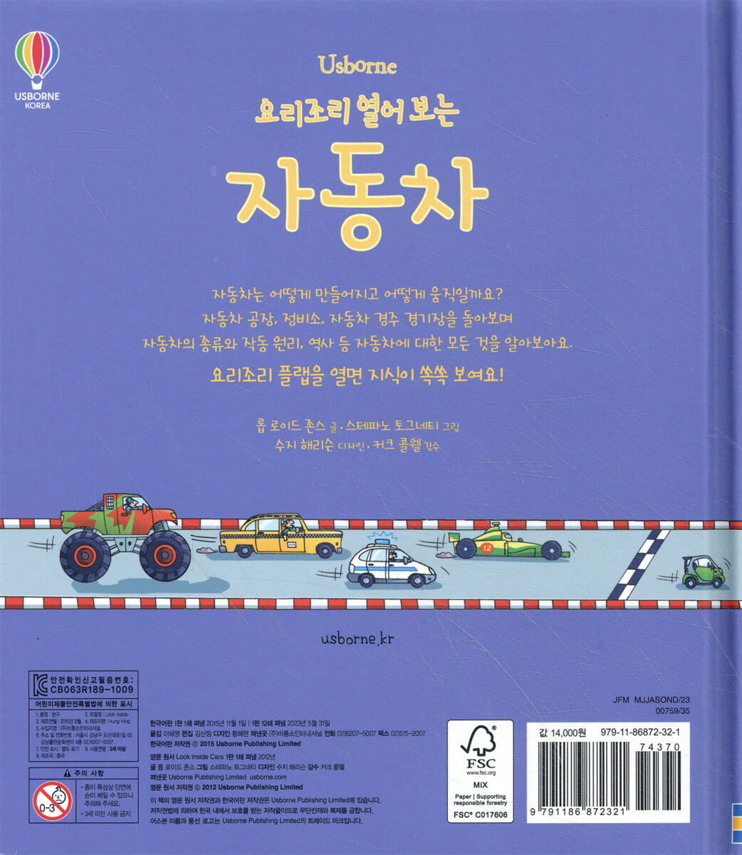 어렵고 딱딱한 과학의 세계, 하지만 조금만 달리 접근하면 엄청나게 흥미롭고 신비한 세계라는 걸 알고 있나요? 놀이와 학습을 접목한 플랩북 「요리조리 열어 보는」시리즈는 아이들을 흥미진진한 과학의 세계로 안내합니다. 책 속 플랩 60여 개를 하나씩 들추면 지식들이 쏙쏙 튀어나와 아이들의 호기심을 돋우어요. 또한 열면 또 열리는 플랩 속 플랩이 점점 더 깊은 탐구심으로 이어지게 도와주지요. 아이들이 경험하는 일상의 현상부터 접근해 나가기 때문에 기초적인 개념이 없어도 이해하기 쉽고, 자연스럽게 풀어나가 초등 교과 과정을 아우르는 지식을 담고 있어요. 아이들의 눈높이에 맞춘 상세한 설명과 섬세한 그림 아이들의 눈높이에 맞춘 간결하고도 깊이 있는 설명은 자동차에 대해 쉽고 재미있게 배우도록 해 줘요. 자동차 공장에서 작업 순서를 따라가며 자동차가 만들어지는 과정을 보여 주고, 자동차의 시동을 걸고, 핸들을 돌리고, 연료를 넣을 때 어떤 변화가 있어나는지, 왜 그러한 현상이 나타나는지를 적절한 비유와 구체적인 예시를 넣어 이해를 도와요. 또한 섬세한 그림으로 자동차의 각 기관과 역사 속 자동차의 특징을 효과적으로 전해 주고, 구석구석 살피도록 도와주지요. 플랩 겉과 속에 자리한 풍부한 양의 그림은 아이들의 충분한 이해를 돕고, 집중력을 높여 준답니다. |