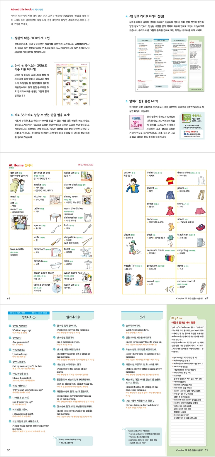 Unit 1 인사 처음 만났을 때 ① 처음 만났을 때 ② 때에 따른 인사 오랜만에 만났을 때 ① 오랜만에 만났을 때 ② 안부를 묻는 인사 안부 인사에 대한 대답 헤어질 때 인사 ① 헤어질 때 인사 ② 환영할 때 사람 부르기 말을 걸 때 화제를 바꿀 때 Unit 2 소개 상대의 정보 묻기 자기 이름에 대해 말하기 신상정보에 대해 말하기 자기 소개하기 Unit 3 감사 감사하다 ① 감사하다 ② 감사하다 ③ 감사 인사에 응답할 때 Unit 4 사과 사과하다 ① 사과하다 ② 잘못&실수했을 때 ① 잘못&실수했을 때 ② 사과 인사에 응답할 때 Unit 5 대답 잘 알아듣지 못할 때 실례&양해를 구할 때 긍정적으로 대답할 때 ① 긍정적으로 대답할 때 ② 부정적으로 대답할 때 완곡히 거절할 때 기타 대답 ① 기타 대답 ② 맞장구 칠 때 ① 맞장구 칠 때 ② 맞장구 치지 않을 때 반대할 때 Unit 6 주의&충고 주의를 줄 때 ① 주의를 줄 때 ② 주의를 줄 때 ③ 충고할 때 ① 충고할 때 ② 충고할 때 ③ 충고할 때 ④ Unit 7 기타 존경하다 칭찬하다 격려하다 부탁하다 재촉하다 긍정적 추측 부정적 추측 동정하다 비난하다 ① 비난하다 ② Unit 8 전화 전화를 걸 때(일반 상황) 전화를 걸 때(회사에서) 전화를 받을 때 ① 전화를 받을 때 ② 전화를 받을 때 ③(회사에서) 전화를 바꿔줄 때 ① 전화를 바꿔줄 때 ② 다시 전화한다고 할 때 전화를 받을 수 없을 때 통화 상태가 안 좋을 때 전화 메시지 잘못 걸려온 전화 전화를 끊을 때 전화 기타 Chapter 02 무슨 말을 꺼낼까? Unit 1 하루 생활 일어나기 ① 일어나기 ② 씻기 식사 옷 입기&화장하기 TV 보기 잠자리 들기 잠버릇 숙면 꿈 Unit 2 집 화장실 사용 화장실 에티켓 소변&대변 욕실 사용 거실 생활 홈시어터 부엌용품 냉장고 전자&가스레인지 요리 준비 요리 하기 식사 예절 설거지 위생 청소 걸레질 분리수거(쓰레기) 세탁 집 꾸미기 Unit 3 운전&교통 운전 ① 운전 ② 주차 교통 체증 교통 위반 ① 교통 위반 ② Unit 4 이사 부동산 집 구하기 부동산 조건 보기 부동산 계약하기 이사 계획 짐 싸기 이사 비용 정리 Chapter 03 나랑 친구할래요? Unit 1 날씨&계절 날씨 묻기 일기예보 맑은 날 흐린 날 비 오는 날 천둥&번개 봄 날씨 ① 봄 날씨 ② 황사 여름 날씨 ① 여름 날씨 ② 장마 태풍 가뭄 홍수 가을 날씨 ① 가을 날씨 ② 단풍 겨울 날씨 ① 겨울 날씨 ② 눈 계절 Unit 2 명절&기념일 설날 새해 결심 추석 크리스마스 ① 크리스마스 ② 부활절&추수감사절 핼러윈데이&밸런타인데이 생일 ① 생일 ② 축하 Unit 3 음주 주량 ① 주량 ② 과음 술버릇 술에 취함 ① 술에 취함 ② 술에 대한 충고 술에 대한 기호 금주 술 기타 ① 술 기타 ② Unit 4 흡연 흡연 담배 ① 담배 ② 금연 ① 금연 ② Unit 5 취미 취미 묻기 취미 대답하기 사진 스포츠 스포츠 종목 계절 스포츠 구기 스포츠 ① 구기 스포츠 ② 음악 감상 악기 연주 영화 감상 ① 영화 감상 ② 영화관 가기 독서 ① 독서 ② 독서 ③ 십자수 수집 Unit 6 애완동물 애완동물 ① 애완동물 ② 애완동물-개 ① 애완동물-개 ② 애완동물-개 ③ 애완동물-개 ④ 애완동물-개 ⑤ 애완동물-고양이 애완동물 기타 Unit 7 식물 가꾸기 식물 가꾸기 ① 식물 가꾸기 ② Chapter 04 외모지상주의? Unit 1 신체 신체 특징 키 체중 ① 체중 ② 체격&기타 Unit 2 얼굴&피부 모습&얼굴 얼굴형 피부 피부 상태 피부 트러블 Unit 3 이목구비 눈 ① 눈 ② 시력 코의 생김새 코 관련 증상 귀 입&입술 입 관련 동작 구강 치아 관련 Unit 4 헤어스타일&수염 헤어스타일 헤어스타일&수염 Unit 5 스타일 스타일 ① 스타일 ② 닮았다고 말할 때 못생긴 외모 Unit 6 옷 옷 취향 옷차림 ① 옷차림 ② 옷차림 ③ Unit 7 화장&성형 화장 ① 화장 ② 화장 ③ 성형 Chapter 05 어디에서든 문제없어! Unit 1 음식점 음식점 추천 식당 예약 예약 없이 갔을 때 메뉴 보기 주문 전 주문 결정 주문하기-메인 요리 주문하기-선택 사항 주문하기-음료&디저트 주문하기-요청 사항 웨이터와 대화 서비스 불만 음식 맛 평가 계산 카페 패스트푸드 배달 Unit 2 쇼핑 쇼핑 쇼핑몰 옷 가게 옷 구입 조건 옷 구입 결정 대형 마트&슈퍼마켓 ① 대형 마트&슈퍼마켓 ② 할인 기간 ① 할인 기간 ② 할인 품목&비율 할인 구입 조건 할부 구매 ① 할부 구매 ② 계산하기 ① 계산하기 ② 배송 환불&반품 Unit 3 병원&약국 병원 예약&수속 진찰실 외과 내과-감기 내과-열 내과-소화기 ① 내과-소화기 ② 치과-치통 치과-발치 치과-충치 치과-기타 진료 기타 ① 진료 기타 ② 입원&퇴원 수술 병원비&보험 문병 처방전 약국-복용 방법 약국-약 구입 Unit 4 은행&우체국 은행 계좌 입출금 송금 ATM 사용 ATM 현금카드 신용카드 환전 환율 대출 상담 대출 이자율 대출 보증 은행 기타 편지 발송 소포 발송 우체국 기타 Unit 5 미용실 미용실 상담 커트 ① 커트 ② 퍼머 염색 네일 미용실 기타 Unit 6 세탁소 세탁물 맡기기 세탁물 찾기 세탁물 확인 얼룩 제거 수선 Unit 7 렌터카&주유소 렌터카-대여&차종 렌터카-요금&반납 주유소 ① 주유소 ② 세차&정비 Unit 8 서점 서점&헌책방 책 찾기 ① 책 찾기 ② 책 찾기 ③ 책 호응 수준 도서 구입 Unit 9 도서관&미술관&박물관 도서관 ① 도서관 ② 도서 대출 도서 반납 도서 연체&대출 연장 미술관&박물관 Un