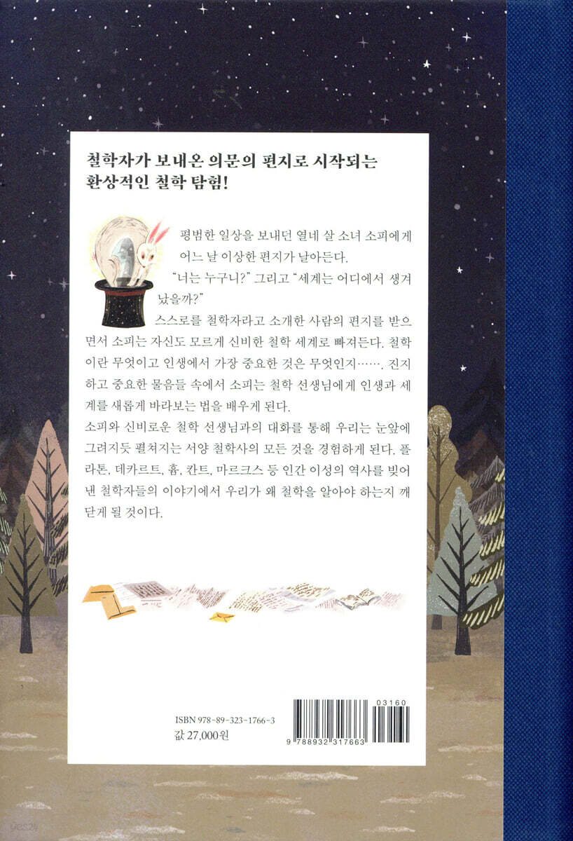 한국의 독자들에게 『소피의 세계』 출간 20주년을 맞으며 에덴동산 마술사의 모자 신화 자연철학자들 데모크리토스 운명 소크라테스 아테네 플라톤 소령의 오두막 아리스토텔레스 헬레니즘 우편엽서 두 문화권 2부 중세 르네상스 바로크 데카르트 스피노자 로크 흄 버클리 비에르켈리 계몽주의 3부 칸트 낭만주의 헤겔 키르케고르 마르크스 다윈 프로이트 우리들의 시대 가든파티 대위법 빅뱅 옮긴이의 말 감수자의 말 찾아보기 |