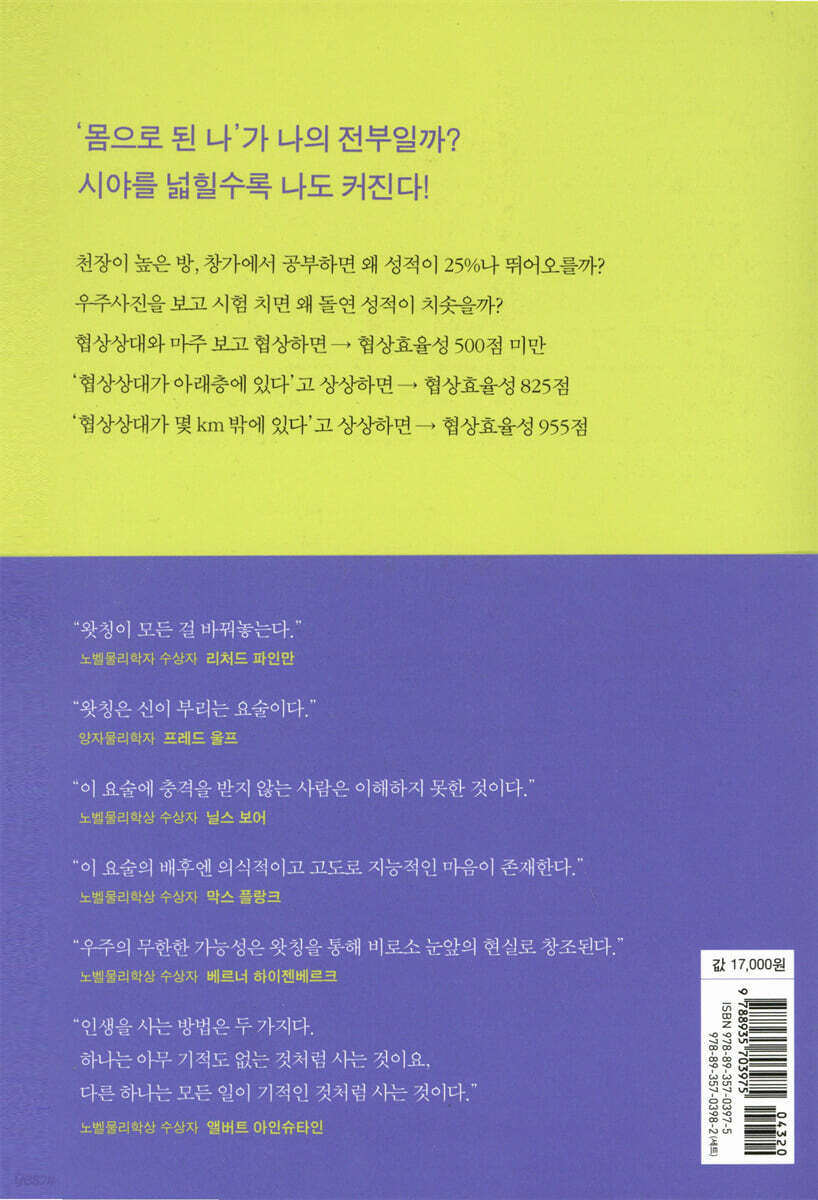 30년 경력의 MBC 베테랑 기자가 보여주는 내면 취재의 정수! 무지무지하게 화가 치솟을 때 당신은 어떻게 하는가? 화장실에 들어가 커다란 벽거울에 비친 자신의 모습을 가만히 들여다보라. 화가 저절로 가라앉기 시작한다. 왜? 자신을 거리를 두고 객관적으로 바라보기 때문이다. 그럼 거리를 더 넓히면 어떻게 될까? 예컨대 100미터 상공에서 자신을 내려다보면? 화는 더 빨리 가라앉는다. 그럼 1,000미터 상공에서 내려다보면? 화는 더욱더 빨리 가라앉는다. 그럼 이번엔 시간상의 거리를 넓혀보면 어떨까? 예컨대 화에 휩싸인 자신을 5년 후의 시점에서 되돌아본다고 상상하면? 화는 많이 가라앉는다. 그럼 10년 후의 시점에서 되돌아본다고 상상하면? 화는 더욱 더 많이 가라앉는다. 이처럼 시공간상의 거리를 늘려가며 자신을 바라볼수록 점점 더 큰 눈으로 바라보게 된다. 왜? ‘보이지 않는 나’의 크기가 커지기 때문이다. 그렇다면 공간의 크기를 늘리면 늘릴수록 나의 다른 능력들도 점점 더 많이 쏟아져 나올까? -천장이 높은 방에서 공부하면 성적이 오를까? 즉각 25%나 뛰어오른다. -창밖이 내다보이는 방에서 공부해도 성적이 오를까? 즉각 20% 뛰어오른다. -두 방을 오가며 암기하면 암기성적이 오를까? 즉각 20% 뛰어오른다. -우주사진을 보고 시험을 쳐도 성적이 오를까? 역시 즉각 치솟는다. (실험결과들은 본문에 자세히 소개돼 있음) 텍사스대의 심리학자 헨더슨(Marlone Henderson)은 이런 이치가 협상성공률에도 적용되는지 실험해보았다. 결과는 이렇다. -협상상대와 마주 보고 협상하면 → 협상효율성 500점 미만 -‘협상상대가 아래층에 있다’고 상상하면 → 협상효율성 825점 -‘협상상대가 몇 km 밖에 있다’고 상상하면 → 협상효율성 955점 -‘협상상대가 수천 km 밖에 있다’고 상상하면 → 협상효율성 1000점 어김없이 똑같은 결과가 나온다. 상상하는 공간의 크기를 늘리면 늘릴수록 협상성공률도 점점 높아지는 것이다. 건강도 그렇다. 창밖이 내다보이는 병실에서 생활하는 환자가 창밖이 안 보이는 병실의 환자보다 회복속도가 훨씬 더 빠르다. 자신이 사는 곳 주변에 녹지 공간이 보이면 수명도 늘어난다. 내가 바라보는 공간(시야)을 넓힐수록 모든 분야에서 똑같은 현상이 일어난다. 시야를 넓힐수록 성적, 지능, 창의성, 지혜, 생명력, 수명, 건강, 운 등이 높아지거나 좋아진다. 공간의 크기가 나의 크기이다. 그렇다면 ‘진정한 나’는 텅 빈 공간이란 말인가? 두뇌는 ‘나’를 물질로 된 육신으로 인식한다. 하지만 전자현미경으로 최대한 확대해보면 내 몸은 텅 빈 공간이다. 논리적으로 살펴봐도 그렇다. -내 몸의 70%는 물이다. 내 몸에서 물을 몽땅 빼낸다면? 내 몸의 70%는 사라진다. -내 몸의 살과 근육은 내가 먹는 음식으로 만들어진다. 내 몸에서 음식으로 만들어진 것을 몽땅 빼낸다면? 살과 근육은 사라진다. -뼈는 어떨까? 비타민 A와 D가 없으면 뼈가 만들어지지 않는다. 비타민 A와 D는 햇빛이 있어야만 생성된다. 내 몸에서 햇빛으로 만들어진 것을 몽땅 빼낸다면? 뼈도 사라진다. 즉, 내 몸에서 물, 음식, 햇빛 등 내 것이 아닌 것을 몽땅 빼내면 내 것은 아무것도 없다. 텅 빈 공간일 뿐이다. 이처럼 우리는 두뇌의 생각이 만들어낸 착각 속에 살고 있다. 그래서 아인슈타인도 “현실은 시각적 착각(optical illusion)”이라고 했다. 그렇다면 텅 빈 공간의 실체는? 전자현미경으로 자세히 들여다보면 텅 빈 공간은 빛 알갱이(미립자)들로 가득하다. ‘나’는 빛 알갱이들로 가득한 빛의 공간인 것이다. 단지 육안이 인식하지 못할 따름이다. 초고성능 에너지장 카메라로 촬영해보면 시야를 넓히면 넓힐수록 사람의 몸에서 빛이 넓고 멀리 퍼져나간다는 사실이 확인된다(본문에 사진 수록). 즉, 내가 시야를 넓히면 넓힐수록 ‘빛으로 된 나’가 넓고 멀리 퍼져나가는 것이다. 이렇게 퍼져나가면서 지능, 지혜, 창의성, 에너지, 생명력 등 나의 모든 것도 점점 더 많이 쏟아져 나온다. 이런 사실들은 정교한 실험들로 완벽하게 증명된다(1장과 2장). 내가 얼마나 시야를 넓혀 바라보느냐에 따라 나의 현실 창조력도 함께 커지는 것이다. 이것이 양자물리학의 ‘관찰자 효과(observer effect)’이다. 내면세계에 관한 이야기는 자칫 추상적이거나 신비주의에 빠지기 쉽다. 하지만 이 책은 철저한 과학적 증거로 뒷받침된다. 저자 김상운은 현역 방송기자이다. 5년 전에도 30만 독자가 읽은 베스트셀러 《왓칭 ― 신이 부리는 요술》을 쓴 바 있다. 이번에는 근원의 빛과 만나는 등 한 차원 높아진 저자의 체험이 곁들여졌고, 보통 사람들에게는 난해하게 다가올 수 있는 창조의 원리나 ‘나’의 정체 등도 양자물리학 실험 등을 통해 마치 TV 뉴스처럼 쏙쏙 들어오도록 쉽게 소개돼 있다. 바깥세상의 진실을 취재, 보도하는 기자가 내면세계의 진실도 파헤쳐 알기 쉽게 세상에 전해줄 수 있다는 사실이 놀랍고도 신선한 충격으로 다가온다. |
