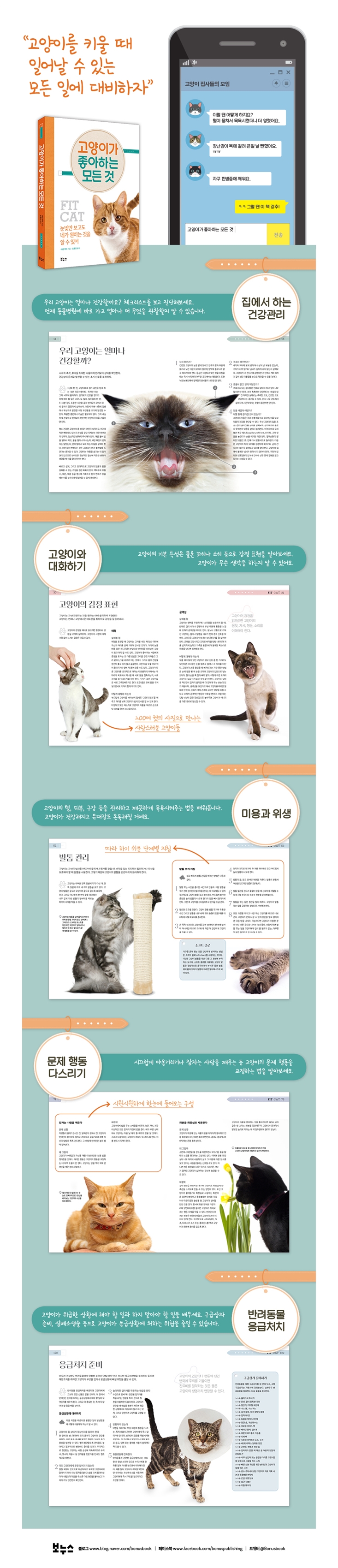 책을 시작하며 10 1장 집에서 하는 건강관리 2장 고양이와 대화하기 3장 미용과 위생 4장 식사와 영양 5장 문제 행동 다스리기 6장 즐거운 놀이훈련 7장 실내 생활 8장 화장실 교육 9장 여행 함께하기 10장 반려동물 응급처치 11장 다양한 친구 맺기 12장 생활비 절약하기 13장 어린 고양이 돌보기 14장 나이 든 고양이와 생활하기 더 읽을거리 찾아보기 사진 출처 |