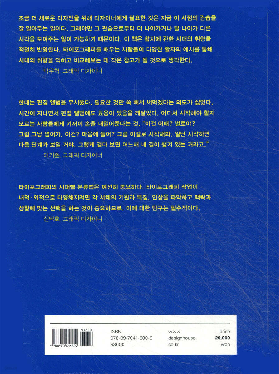 환상의 하모니를 이루는 서체 조합과 그 이유 활판 인쇄술을 뜻하는 타이포그래피(Typography)는 오늘날 문자를 활용한 디자인의 한 분야를 이르는 말로 넓게 쓰이고 있다. 타이포그래피 관련 서적은 활판 인쇄술을 역사적으로 접근해 원리와 용어 위주로 설명하는 개론서가 많은 편이지만, 이 책은 더욱 실용적인 관점으로 타이포그래피를 다룬다. 서체를 타입별로 분류하고 무엇과 무엇을 섞어 쓸 때 어떤 느낌인지 직접 보여준다. 이를 통해 ‘서체에도 어울리는 짝이 있다’는 것을 한눈에 파악할 수 있고, 직관적으로 타이포그래피란 무엇인지 깨달을 수 있다. 타이포그래피를 공부하려는 사람이라면 다양한 스타일을 참고해 영감을 얻을 수 있고, 실무자라면 진행 중인 디자인 프로젝트에 활용해볼 만한 서체를 발견할 수 있을 것이다. 테마에 따라 제안하는 149가지 서체 조합 저자 토니 세던은 20여 년 이상 그래픽 디자이너이자 출판사의 아트디렉터, 타이포그래퍼 등으로 활동해온 베테랑 디자이너이다. 그는 축적된 경험을 살려 함께 썼을 때 더 좋은 149가지 서체 조합을 제안한다. 폰트뷰로사, 폰트스미스사, 개라지폰트사, 포지타입사 등 대표적인 서체 회사들의 200여 가지 폰트 패밀리를 수록하고 있으며, 중세, 20세기 초, 상업, 산업, 테크놀로지 등 32가지 테마에 맞춰 프로젝트별로 함께 쓸 만한 서체를 2~4개씩 묶어 보여준다. 예를 들어, ‘산업’ 테마에서 ‘건축미’를 드러내는 ‘MVB 솔라노 고딕(Solano Gothic)’과 ‘아르마다(Armada)’를 함께 소개하는 식이다. 본문용 혹은 제목용 서체에 어울린다거나, 행정기관의 문서 디자인에 사용하라는 등 시니어 디자이너로서의 노하우가 담긴 팁도 놓치지 않는다. 또한 해당 서체를 이용한 포스터 등 디자인 도판을 덧붙여 풍성하게 구성했다. 초보에서 프로까지, 디자이너의 서체 안목을 키우는 타이포그래피 실용서 《타이포그래피 X 타입》은 타이포그래피를 이해하는 데 필요한 기초 지식까지 담고 있다. 대표적인 영문 서체 분류법인 ‘복스 서체 분류법’을 훑고, 글리프, 레그와 테일 등 서체를 이루는 10가지 원리를 설명하며, ‘세리프와 산세리프를 함께 쓴다’ 등 타이포그래피 디자인의 요령까지 담았다. 특히 서체 개발에 얽힌 흥미로운 설명은 서체에 관한 호기심을 부추긴다. 패션지 『하퍼스 바자』에 사용하기 위해 개발됐다는 ‘HTF 디도(HTF Didot)’는 서체에서 스타일리시함이 묻어나고, 독일의 도로 표지판이나 행정 기관의 문서 작성에 사용한 ‘딘 1451(DIN 1451)’에게선 견고함이 느껴진다. 서체의 맥락을 파악한 순간, 타이포그래피 디자인이 한결 쉽게 이해되는 것이다. 《타이포그래피 X 타입》은 서체에 관해 흥미를 갖고 있는 사람, 서체를 선별할 수 있는 안목을 키우려는 디자이너와 디자이너 지망생을 위한 책이다. 책에서 제안하는 149가지 서체 조합은 지금 당장 적용해볼 수 있는 훌륭한 예시지만 말 그대로 ‘제안’일 뿐이다. 더 좋은 조합, 더 많은 제안은 책을 읽은 당신에게서 탄생한다. |