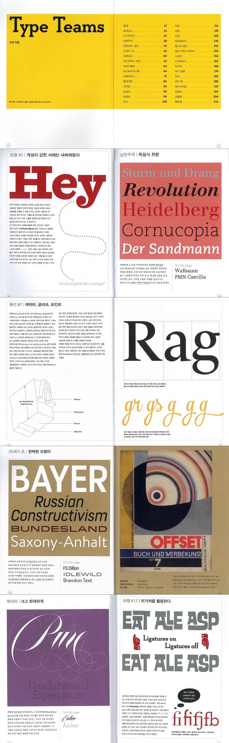 분류 서체 조합 용어 정리 서체 회사 찾아보기 감사의 말 원리 The Principles 스트레스 캐릭터, 글리프, 포인트 대비 애퍼처와 카운터 레그와 테일 어센더와 디센더 단층 또는 복층 세리프 모양과 브래킷 스크립트 글리픽 요령 The Tricks 서체에 대한 편견을 버린다 개성이 강한 서체는 내버려둔다 위계를 세운다 몇 개의 폰트(서체)가 필요할까? 세리프와 산세리프를 함께 쓴다 다양성을 인정한다 패밀리가 풍부한가? 시각적 크기를 맞춘다 일관된 분위기를 유지한다 조화를 생각한다 컬러를 부여한다 리거처를 활용한다 티틀을 조절한다 분수 표기에 유의한다 |