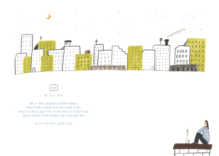 나는 떠나지 못하는 사람 D-100 아, 떠나고 싶다! D-99 가서 맛있는 거 사먹어 D-98 그럼 여행 가겠네? D-97 여행이라는 이름 D-96 보상심리 버리기 D-95 교토의 여름, 파리의 카페 D-94 운전 못하는 여자, 수영 못하는 여자 D-93 부러운 눈동자 D-92 여행 계획이란 좋은 것 D-91 어른의 조건 D-90 365일 여름 D-89 떠나지 않아도 괜찮아 D-88 카메라 들고 다니기 D-87 엄마의 유럽 여행 D-86 믿을 만할 말 D-85 가이드북 읽는 시간 D-84 내 스타일의 여행책 D-83 불행과 행복 사이 D-82 불문율 D-81 당분간의 미래 D-80 남의 휴가 응원하기 D-79 인천공항 작은 여행의 기분 D-77 오늘의 이벤트 D-76 예쁘게 보이고 싶을 때 D-75 모 아니면 도 D-74 이상해서 좋은 점 D-73 고집 D-72 삼시 세끼 D-71 일상적이지 않은 일상 D-70 달라서 재밌어 D-69 다정함의 기준, 친밀함의 기준 D-68 사진 정리 D-67 그런데도 싫지 않은 사람 D-66 미운 사람이 생겼을 때 드는 생각 D-65 If you leave me now D-64 근무 태만 D-63 죽기 전에 꼭 가봐야 할 곳 D-62 서울 안내자 D-61 진부한 사람 D-60 낯선 곳에서 축 생일 D-59 납득의 범위 D-58 원래 이런 사람이야 D-57 왜 나는 자꾸 모든 오늘은 떠나기 전날 D-53 비키니 보디 프로젝트 D-52 여행계 출범 D-51 여행은 독서 D-50 최초의 한입, 마지막 한 끼 D-49 영어의 굴레 D-48 여행, 친구 D-47 여행 세포 D-46 맥주 바보 D-45 사랑해 고수 D-44 그런 숙소 D-43 여행을 갑자기 가야 하는 이유 미지근해질 때 D-38 용기가 없어서 D-37 그냥 집에 있을까 D-36 고독 퍼즐 D-35 아, 외로워 D-34 헤어지는 직업 D-33 늘 서툰 사람이기를 D-32 제주 콤플렉스 D-31 여행이 바꿔놓은 건 하나도 없다 D-30 아이러니 D-29 돌아오는 날 여기 아닌 어딘가 D-25 공항에서 하는 생각 D-24 생애 첫 효도 여행 D-23 성실의 연료 D-22 근데 있잖아 D-21 팁의 공식 D-20 비행기에서 밥 먹기 D-19 이젠 그런 여행 안 해 D-18 여행 취향 D-17 스물다섯 서른다섯 D-16 행복하자, 아프지 말고 D-15 여행 기념품 D-14 대체 뭐에 홀려서 D-13 최고의 여행 친구 D-12 물욕 대신 식욕 D-11 서른일곱 살 여자가 여행할 때 일어나는 일들 D-10 서점 여행 D-9 오감의 공간 D-8 취미는 서핑 D-7 알지만 안 지키는 것들 D-6 그저 버티는 중 D-5 두 번 만나기 D-4 (먹는) 여행 뒤풀이 D-3 어느 날 훌쩍 D-2 우정은 좋은 것 D-1 방청소의 날 epilogue D-? 거꾸로 여행 |