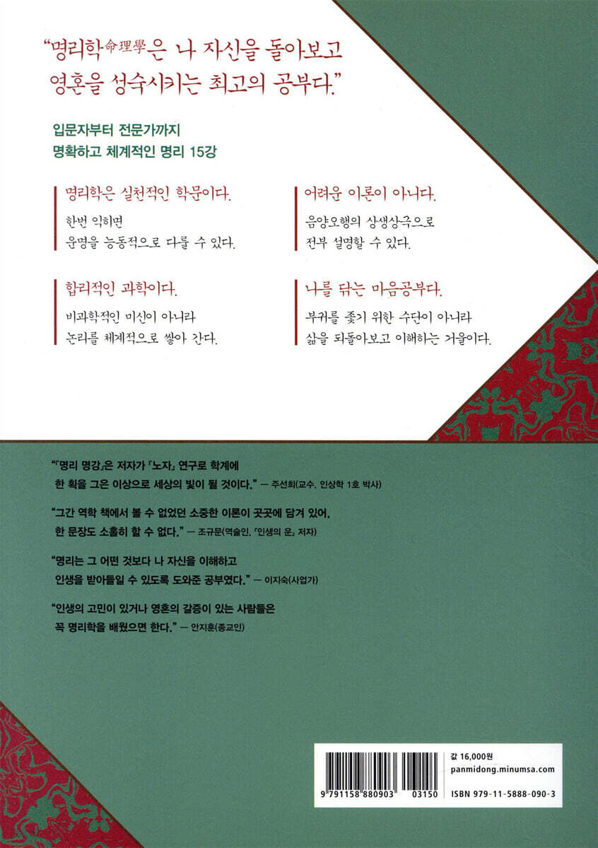 현재의 삶이 뜻대로 풀리지 않고, 미래의 내가 정말로 궁금하다면? 삶을 통찰하는 동양 철학의 정수 원리부터 실전 적용까지 한 권으로 통하는 명리 15강 인간과 우주를 아우르는 체계적인 명리의 정석 원리부터 실전까지 명리학을 체계적으로 익히고 자신의 본성과 운명을 이해하여 삶을 전체적인 시각에서 조망할 수 있게 도와주는 『명리 명강』이 판미동에서 출간되었다. 이 책은 명리학과 노장철학 등 다양한 학문에서 깊은 사유를 이끌어 온 저자가 누구에게나 명확하게 이해되도록 명리학을 설명할 수 있기까지 지난 10년간 준비한 결과물이다. 저자는 명리학이 미신으로 취급받는 데에는 이를 연구하는 사람들이 학문적 구조를 자세히 밝혀내지 못한 책임도 있다며, 음양오행의 상생·상극으로 명리학을 풀어낸다. 그리하여 우주와 자연에 관한 논리를 체계적으로 쌓아 나간 학문으로서의 명리를 알려 주고 더 나아가 다른 것에 의존하지 않고 자신의 삶을 납득할 수 있도록 해 준다. 정확성과 대중성을 겸비한 『명리 명강』은 교수, 역술인, 학생, 주부, 종교인 등 각계각층의 사람들로부터 “명리학의 핵심을 제대로 짚어낸 책”, “집중해서 읽기만 하면 그 원리가 저절로 이해되어 명리학이 어렵지 않게 느껴진다.”는 평을 받았다. 이 책을 통해 독자들은 자신의 운명을 읽고 삶의 혜안을 갖게 되는 것은 물론, 명리학이 하나의 체계적인 학문이자 더 나아가 세계와 개인이 만나는 일임을 알 수 있을 것이다. 명리는 미신이 아니라 과학이다 『명리 명강』은 사람들이 명리학을 미신으로 보거나 어렵다고 느끼는 이유를 그 원리와 개념을 잘 이해하지 못해서라고 보고, ‘원리, 법칙, 적용’으로 나누어 단계적으로 이해를 이끌어 나간다. 1부 원리 편 ‘음양오행, 우주의 흐름을 깨닫다’에서는 음양오행으로 10천간과 12지지의 근본적인 이치를 밝히고, 2부 법칙 편 ‘육친과 합충, 운명의 공식을 세우다’에서는 사주팔자의 간지와 흐르는 운이 안팎에서 만나 서로 어떤 관계를 맺는지 그 작동 방식을 알려 준다. 그리고 3부 적용 편 ‘사주팔자, 인간의 삶을 읽다’에서는 원리와 법칙들이 개별적인 삶에서 어떻게 나타나는지 올바른 해석 방식과 다양한 실전 사례를 살펴본다. 명리학은 세상에 대한 이해와 사람에 대한 이해를 양 방향에서 통하게 하는 가장 실천적인 과학이다. 흔히 사주를 음력으로 본다고 생각하는데, 사실 음력이든 양력이든 관계없이 태어난 때를 간지력의 60갑자로 바꿔 보는 것이다. 간지력은 하늘의 기운을 나타내는 10천간과 땅의 형질을 나타내는 12지지를 짝지어 60갑자로 시간을 표시한 것으로, 다른 역법과의 차이점은 그것이 단순히 시간만을 표시한 것이 아니라 시공간과 그에 따른 에너지장까지 모두 포함한다는 점이다. 때문에 간지력으로 인간의 운명을 읽는 명리학은 천문과 지리를 비롯해 인간과 생명을 이해하는 지혜까지 담겨 있다. 『명리 명강』은 명리 입문자부터 전문 역학인까지 모두 이해할 수 있는 합리적인 명리학의 정수를 소개하고, 인문학을 공부하는 사람들조차 놓치기 쉬운 음양오행의 기본을 탄탄하게 가르쳐주는, 명리 공부의 훌륭한 길잡이가 될 것이다. 명리는 나를 닦는 마음공부다 보통 어려움에 처하거나 방황할 때 ‘내 인생은 왜 이 모양일까? 진정한 나의 길은 무엇일까? 언제쯤 나도 잘살게 될까?’ 하는 것들이 궁금하여 운명에 관심을 가지게 된다. 그러나 명리학은 그러한 궁금증에 맞게 답을 주기도 하지만, 더 나아가 지금 있는 곳에서 더 넓은 시야로 자신의 삶을 바라보고 새로이 나아가기 위한 질문을 하도록 만들어 주기도 한다. 나의 운명을 이해하는 일은 보다 깊은 자기 이해를 필요로 하므로, 이것이 자연히 스스로 삶의 답을 찾아 나가는 과정으로 이어지는 것이다. 마음공부가 되어 있지 않으면 타고난 욕망대로 이끌려 살아가기 쉽지만, 시간에 따라 변하는 기운과 타고난 운명을 조화롭게 꾸려 가는 것은 여전히 각자의 몫이다. 명리학에는 변화하는 운에 맞추어 삶을 이끌어 가는 지혜가 들어 있어, 운이 좋을 때 지나치게 자만하지 않고, 운이 나쁠 때 모든 걸 포기하고 놓아 버리지 않게 해 준다. 때문에 “명리학은 단순한 미신이나 기술이 아니라 삶을 장기적인 안목에서 바라보는 힘이며, 나 자신을 이해하고 인생을 바꿀 수 있는 최고의 공부”라는 것이 저자의 결론이다. 이처럼 마음공부로서 명리학은 다른 무엇보다도 삶을 되돌아보고 자신을 이해하는 좋은 방편이 될 것이다. 추천의 글 "명리학에 대한 사랑이 남다른 저자는 『노자』 연구에 몸 바친 그 이상으로 아주 오랜 시간 명리 연구를 위해 자료를 모으고 분석하며 지내 왔다. 『명리 명강』은 저자가 『노자』 연구로 학계에 한 획을 그은 이상으로 세상의 빛이 될 것이다." - 주선희(교수, 인상학 1호 박사) "이 책에는 그간 역학 책에서 볼 수 없었던 소중한 이론들이 곳곳에 담겨져 있다. 명리학에 조금이라도 관심을 갖고 있는 사람이라면 한 문장도 소홀히 할 수 없고, 명리학의 이론적 약점에 많은 목마름을 느꼈던 사람들은 그 갈증이 상쾌·통쾌하게 해소될 것이