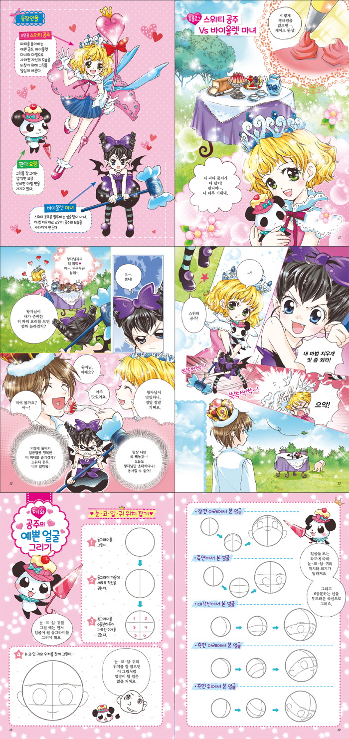 1화. 공주의 예쁜 얼굴 그리기 / 2화. 블링블링 헤어스타일 그리기 3화. 공주의 다양한 포즈 그리기 / 4화. 화려한 드레스 그리기 / 5화. 반짝반짝 액세서리 그리기 6화. 아름다운 꽃 그리기 / 7화. 공주 모자 그리기 / 8화. 달콤한 파티 요리 그리기 9화. 파티 테이블 꾸미기 / 에필로그. 스위티 공주의 행복한 파티 / ★스위티 공주의 파티 DIY |