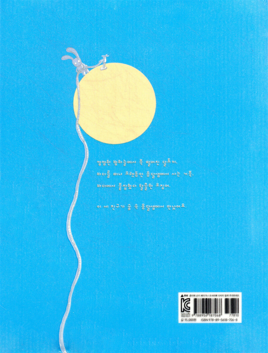 어쨌거나 달토끼는 오징어와 거북의 도움으로 무사히 달나라로 돌아갑니다. 《달토끼, 거북이, 오징어》는 서로 다른 세상에서 살다 만난 친구들이 서로서로 알아가며 일을 헤쳐나가는 이야기입니다. 달토끼는 태어나서 처음으로 거북과 오징어를 만납니다. 그런데도 토끼는 호기심이 가득해서 금세 친구가 됩니다. 오징어가 바다에 가고 싶다고 하자 같이 가자고 합니다. 그런가 하면 거북은 오징어가 집에 가고 싶어 하든 말든 그다지 관심이 없습니다. 거북의 관심은 오로지 달토끼뿐이니까요. 셋은 길을 떠나면서 서로 생김새는 다르지만, 같이 가지 않으면 바다로 갈 수 없다는 생각을 했을지도 모릅니다. 오징어가 죽어가는 마당에 서로 다르다는 것은 아무런 문제가 될 수 없지요. 토끼는 낯선 여행이 즐겁고, 오징어는 바다에 가니까 즐겁고, 거북도 달토끼와 함께하니까 즐겁기만 합니다. 이제는 다르다는 것도, 낯설다는 것도 아무런 문제가 되지 않습니다. 하지만 어떡하지요? 이제 달토끼가 걱정입니다. 오징어는 무사히 바다로 돌아왔는데, 달토끼는 하늘로 오를 수가 없습니다. 오징어가 먹물을 내뿜어 토끼를 올려 보내려고 하지만 그게 어디 쉬운 일인가요? 밤이 되어 집에 가고 싶은 토끼 눈에 왕방울 눈물이 떨어집니다. 그제야 거북도 달토끼가 집에 가고 싶어 하는 마음을 알고 무사히 돌아갈 수 있기를 기도합니다. 이때 어디선가 수많은 오징어가 나타나 수많은 먹물을 쏘아올려 달토끼를 달나라로 돌려보냅니다. 이때 생긴 먹물 자국이 아직도 달에 남아 있다지요. 나와 생김새가 다르고 생각이 달라도 곧바로 차별하거나 외면하지 않고 관심의 눈으로 들여다보면 그곳에서 아름다운 무언가를 발견하기도 하고 좋은 관계를 맺기도 합니다. 그러니까 한마디로 《달토끼, 거북이, 오징어》는 서로 낯선 사람들, 다른 사람들의 마음을 토닥여 주는 이야기입니다. 이 사랑스러운 이야기와 그림에 푹 빠져들면 우리가 알고 있던 이야기를 새롭게 알고 새롭게 생각할 수 있습니다. |
