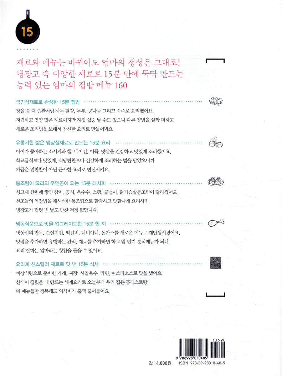15분 요리 업그레이드 식재료 | 15분 요리 육수 레시피 | 15분 요리 스피드 쿠킹 팁 Part 1. 국민식재료로 완성한 15분 집밥 -달걀, 두부, 콩나물, 숙주 * 달걀 달걀버터밥 | 달걀우동 | 달걀잡채부침 | 홍차달걀장조림 | 토마토달걀탕 달걀샌드위치 | 일본식게살달걀부침 | 달걀밥전 | 베이컨스크램블드에그 달걀볶음밥 | 달걀치즈피자 | 교리김밥 | 포차달걀말이 * 두부 두부데리야키덮밥 | 고추장두부찌개 | 두부채소조림 | 두부국수 | 두부두루치기 두부샐러드 | 일본식두부튀김 | 중국식두부볶음 | 매운두부전골 초간단두부보쌈 | 연두부수프 * 콩나물 소고기콩나물비빔밥 | 콩나물부추무침 | 콩나물비빔국수 | 콩나물오징어국밥 콩나물제육볶음 | 콩나물된장국 | 콩나물겨자채 | 대하콩나물찜 * 숙주 차돌박이숙주샐러드 | 김치숙주부침개 | 삼겹살숙주찜 | 해물숙주볶음 | 청포묵숙주무침 Part 2. 유통기한 짧은 냉장실재료로 만든 15분 요리 -소시지, 햄, 베이컨, 어묵, 맛살 * 소시지 소시지스튜 | 밥도그 | 소시지채소볶음 | 카레부대찌개 * 햄 햄마끼 | 오이햄볶음 | 햄오므라이스 | 햄크로켓 * 베이컨 마늘종베이컨말이 | 베이컨버섯웜샐러드 | 김치베이컨부리또 | BLT샌드위치 브런치감자 | 양배추베이컨볶음 | 사과소스베이컨샐러드 * 어묵 매운어묵김밥 | 김치어묵칼국수 | 어묵잡채 | 어묵콩나물조림 | 어묵조개탕 어묵양파덮밥 | 양념치즈핫바 | 어묵냄비우동 | 어묵마요무침 어묵매운탕 | 어묵마늘종볶음 * 맛살 맛살채소전 | 맛살파강회 | 맛살미역냉채 | 칠리크랩샌드위치 맛살채소볶음 | 콩나물맛살무침 Part 3. 통조림이 요리의 주인공이 되는 15분 레시피 -참치, 연어, 꽁치, 고등어, 햄, 골뱅이, 옥수수, 닭가슴살통조림 * 참치통조림 튜나멜트샌드위치 | 참치김치죽 | 참치연근전 | 캠핑찌개 | 참치채소비빔밥 참치김치주먹밥 | 참치마카로니그라탱 | 참치케사디야 | 참치리소토 참치강된장 | 참치카레밥 * 연어통조림 연어토스트 | 연어주먹밥구이 | 연어감자전 | 깨소스연어샐러드 | 구운연어덮밥 * 꽁치통조림 꽁치감자조림 | 꽁치김치찌개 | 꽁치육개장 | 꽁치완자 * 고등어통조림 고등어엿장조림 | 고등어쌈장 | 고등어김치말이찜 * 통조림햄 두부스팸조림 | 김치스팸덮밥 | 스팸코브샐러드 | 스팸감자볶음 스팸월남쌈 | 스팸꼬치전 * 옥수수통조림 콘소스샐러드 | 옥수수참치전 | 콘치즈토스트 * 골뱅이통조림 골뱅이비빔쫄면 | 골뱅이마늘튀김 | 골뱅이묵무침 | 골뱅이채소볶음 골뱅이발사믹샐러드 | 골뱅이콩나물무침 * 닭가슴살통조림 닭고기장조림 | 닭가슴살미소된장국 | 치킨베이크 | 닭가슴살카레샐러드 닭고기양파전 | 크랜베리치킨샌드위치 Part 4. 냉동식품으로 맛을 업그레이드한 15분 한 끼 -냉동만두, 냉동순살치킨, 떡갈비, 너비아니, 냉동돈가스 * 냉동만두 삼선만둣국 | 비빔만두 | 만두떡강정 | 군만두샐러드 | 만두전골 만두그라탱 | 뚝배기만두 * 냉동순살치킨 칠리치킨 | 치킨레몬탕수 | 파닭 | 치킨월도프샐러드 | 치킨토르티야랩 * 떡갈비·너비아니 떡갈비비빔밥 | 떡갈비데리야키덮밥 | 너비아니오니기라즈 | 너비아니부추샐러드 너비아니무쌈 | 너비아니깻잎쌈밥 * 냉동돈가스 카레돈가스덮밥 | 김치돈가스나베 | 돈가스롤 | 돈가스샌드위치 가츠동 | 매운치즈돈가스 Part 5. 요리계 신스틸러 재료로 맛 낸 15분 식사 -카레가루, 짜장(춘장), 사골육수, 라면, 토마토파스타소스, 크림파스타소스 * 카레가루 카레순두부찌개 | 카레부추전 | 마카로니카레샐러드 | 토르티야카레치즈딥 카레불닭 | 카레볶음우동 | 카레피클 * 짜장(춘장) 해물짜장덮밥 | 돼지고기짜장볶음 | 쟁반짜장 * 사골육수 명동칼국수 | 사골떡만둣국 | 나가사키짬뽕 * 라면 봉골레라면 | 라볶이 | 땅콩소스라면샐러드 | 굴짬뽕라면 * 토마토파스타소스 매콤뚝배기파스타 | 토마토소스해물찜 | 포테이토피자 * 크림파스타소스 크림소스홍합찜 | 단호박크림파스타 | 불고기도리아 |
