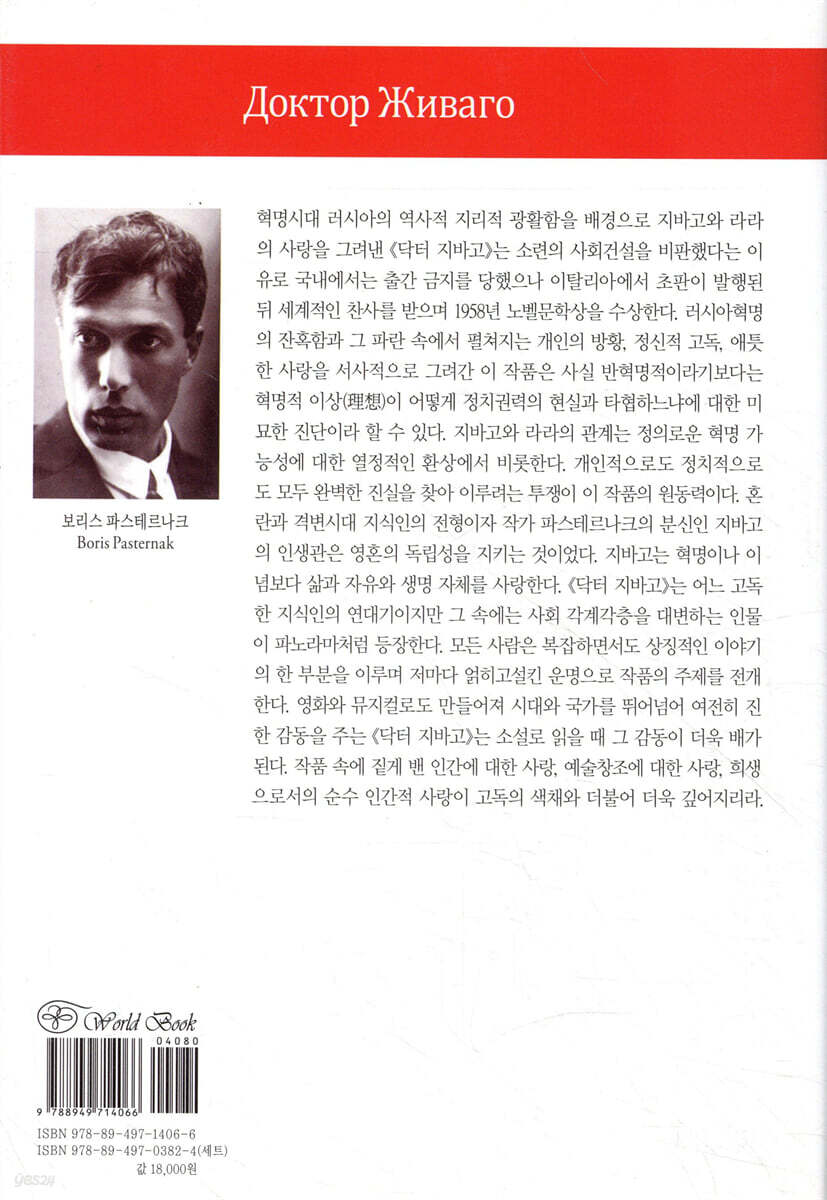 러시아 문학 대표작이자 20세기의 위대한 고전! 이념보다 자유를 외친 영원한 아웃사이더 유리 지바고 혁명 소용돌이에 스러진 지식인의 열정적 삶, 눈 내리는 러시아 대지에 펼쳐지는 장엄한 비극 대서사시! 삶과 사랑, 자유 생명 그 진리의 끝없는 찬가! 시공을 넘어선 위대한 러브스토리 놀랍도록 광활하고 아름다운, 눈 내리는 자작나무숲의 러시아 자연 풍경, 그 안에서 펼쳐지는 유리와 라라의 가슴 절절하고도 애잔한 사랑……. 1955년 완성, 이탈리아에서 먼저 출판된《닥터 지바고》는 러시아혁명의 잔혹함과 그 파란 속에서 펼쳐지는 개인의 방황, 정신적 고독, 애틋한 사랑을 서사적으로 그려 세계적인 베스트셀러가 되었으나 정작 작가의 모국인 소련에서는 1988년까지 출간을 금지 당했다. 러시아혁명과 소련의 사회건설을 비판했다는 이유였다. 비록 조국에서는 침묵을 강요받았지만 서방 세계에서 뜨거운 찬사를 받은 이 작품으로 파스테르나크는, 1958년 노벨 문학상을 수상한다. 그러나 소련 내의 정치적 압력으로 끝내 수상을 거부해 큰 반향을 불러일으키기도 했다. 소련과 서방 세계가 보여준 이 뚜렷하게 다른 반응은 이 작품이 받아들여지는 방식에 중대한 영향을 미쳤다. 파스테르나크는 동서양에서 사회주의 국가 철의 장벽을 넘어, 개인의 자유라는 서구적 낭만을 상징하는 작가가 되었기 때문이다. 삶과 자유, 사랑의 영원한 찬가 영화로 만들어져 대중들에게는 오마 샤리프와 줄리 크리스티의 이미지가 강하게 남아있는《닥터 지바고》는 혁명과 이념에 희생되고 부서지는 개인의 꿈과 순수한 감성을 섬세하게 그려내 20세기 문학사에서 절대 빼놓을 수 없는 고전으로 꼽히고 있다. 문학과 영화를 넘나들며 고전의 반열에 오른 이 기념비적인 작품은 러시아 귀족 사회에서 태어나 부족할 것 없이 자랐지만 1905년 러시아혁명과 1914년 제1차 세계대전, 1917년 2월 혁명과 10월 볼셰비키 혁명을 겪으면서 평생을 떠돌고 방황하며 혼란을 겪어야 했던 시인 의사 유리 지바고의 파란만장한 삶과, 열정적인 사랑의 서사를 노래한다. 전쟁과 혁명 속에서도 여전히 인간에 대한 사랑과 동경, 아름다움을 놓지 않고 끝까지 살아남아 그 시대가 남긴 흔적들을 온몸으로 받아들였던 지식인의 전형인 유리 지바고는 작가 보리스 파스테르나크의 분신으로도 볼 수 있다. 파스테르나크는 자신이 몸소 겪었던 혁명과 내전 무렵 시대 상황, 아내 지나이다와 연인 이빈스카야 사이를 오가며 나눈 사랑, 우랄 지방에서 보낸 경험 등을 바탕으로 한편의 장엄한 서사시이며 시대의 진실한 증언이기도 한 이 작품을 써내려갔다. 《닥터 지바고》에서 드러나는 지바고의 인생관은 자기 영혼의 독립성을 지키는 일이었다. 그는 간접적으로 혁명에 참여하지만, 철저히 아웃사이더로 행동하고 ‘참여’를 거부한다. 지바고는 혁명 또는 이념보다도 삶과 자유, 생명 그 자체를 사랑한 것이다. 《닥터 지바고》는 ‘반혁명적’이라기보다는 혁명적 이상이 어떻게 정치권력의 현실과 타협하느냐에 대한 미묘한 진단이라 할 수 있다. 전후 소설에 등장하는 관계 중에서 가장 강렬하다고 볼 수 있는 라라와 유리의 관계는 정의로운 혁명의 가능성에 대한 열정적 환상에서 비롯한다. 개인적으로도 정치적으로도 모두 완벽한 진실을 찾아 이루려는 투쟁이 이 작품의 원동력이다. 이렇게 앞으로 나아가는 이상(理想)의 실패와 개인적, 정치적, 시적 원칙에 충성이 이어질 수 없는 어려움에서 이 작품의 짙은 애수가 드러난다. 예술 자유 사랑을 노래하는 파스테르나크 보리스 파스테르나크는 러시아(소련) 시인으로 모스크바의 부유한 유대계 가정에서 태어났다. 아버지는 레프 톨스토이와 친구 사이였으며 톨스토이 말고도 작곡가 겸 피아니스트 세르게이 라흐마니노프, 시인 라이너 마리아 릴케, 피아니스트 스크랴빈이 그의 집을 찾아오고는 했다. 이렇게 전형적인 예술가 집안의 분위기 속에서 자라난 그는 자연스레 문학과 예술을 사랑하며 시인의 감수성을 키워나가 시인으로 먼저 이름을 알린다. 그의 시는 예술적 향기가 높고 세련되었을 뿐만 아니라 독특한 시풍으로, 그 무렵 러시아 시단에 새바람을 불러왔다. 그러나 공산주의자들은 그의 시에 상징주의적 영향이 엿보이며, 동시대의 문제에서 벗어나려는 경향과 시적 주제가 고독한 지식인의 기분과 체험의 좁은 울타리를 넘어서지 못한다는 이유로 거세게 비난했다. 그의 시에는 ‘부르주아적, 병적, 염세주의적, 개인주의적’ 이라는 딱지가 덧씌워지기도 했다. 이토록 경직된 체제 아래서 개인의 자유로운 삶을 중요시했던 파스테르나크는 정치를 덧없는 외부적인 현상으로 다루며, 인간의 정신과 감정, 창조력과 같은 영원한 요소들에 집중했다. 그가 창조한 지바고와 라라는 인간다운 본능과 존엄성을 지켜내고자 노력하며, 정치적 폭력에 맞서 그러한 가치들을 끝까지 지켜나간다. 개성의 자유와 내면의 영원한 가치를 좇는 지바고와 라라의 사랑은 이런 모든 것들을 강조한다. 여기에서 사랑은 인간에 대한 사랑, 예술 창조에 대한 사랑, 희생으로서의 사랑, 즉 그리스