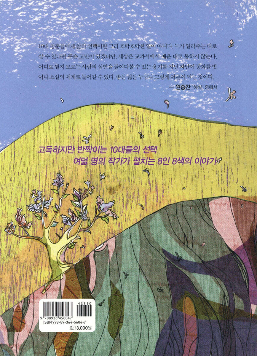 의젓한 척하지만 아직 막내 티를 벗지 못한 고등학생 석진은 건넌방 자취생 윤희를 마음에 두고 있다. 망설이다 간신히 첫 데이트를 신청한 날, 광주는 흉흉한 분위기에 휩싸이고 급기야 총칼로 무장한 군인들이 시내를 점령한다. 다친 사람을 돕기 위해 병원을 오가던 윤희는 총에 맞아 죽고, 석진은 더 이상 철부지로 남을 수 없음을 깨닫고 도청으로 향하는데……. 방미진 「영희가 O형을 선택한 이유」_지루한 중학교 교실에서 벌어진 혈액형 공방! 혈액형별로 짝을 정하자는 한 아이의 제안에 온 교실이 들썩거린다. ‘나’는 누구와 사귈까 기대 반 걱정 반으로 주변의 여자아이들을 혈액형별로 관찰하기 시작하는데, 매사 무난하고 전형적인 O형으로 보이는 영희가 끝내 자신의 혈액형을 밝히지 않자 아이들은 집요한 추리를 시작한다. 영희의 혈액형은 과연 무엇일까? 성석제 「내가 그린 히말라야시다 그림?_유명 화가와 전업주부를 스쳐간 운명의 장난 초등학생 때 사생대회에 나가 자신이 그리지도 않은 그림으로 상을 탄 남자아이. 그는 커서 세계적으로 유명한 화가가 되지만 누군가 자신보다 뛰어난 재능을 가지고 있으리라는 자괴감에 시달린다. 한편 번호를 잘못 써낸 탓에 상을 타지 못한 여자아이는 후일 부잣집 사모님이 되어 유명 화가가 된 그의 작품을 보며 감탄한다. 선택과 인생의 부조리한 관계를 꼬집고, 성공신화의 이면을 풍자하는 작품. 오수연 「너와 함께」_너는 너의 친구가 되렴 학원을 빼먹고 무작정 지방행 버스를 탄 두 소년. 기적의 바닷길을 체험하는 축제에 갔다가 늦어서 보지도 못하고 서울에 돌아온다. 작은 일탈을 저지른 소년들에게 서울은 완전히 낯선 풍경을 보여주고, 소년들은 철제 우리에 갇힌 토끼를 두고 말다툼을 벌인다. 어느 순간 기묘한 판타지가 펼쳐지는데, 사실 애초의 끊임없는 대화도 둘이 아닌 혼자만의 연극이었던 것. 일렁이는 자의식이 만들어낸 그로테스크한 도시 풍경이 흥미롭다. 오진원 「굿바이, 메리 개리스마스」_아빠는 남자, 아빠의 애인도 남자. 과연 진짜 인생이란? 동성 커플 부모를 둔 보린이. 여성의 자아를 지닌 아빠는 네덜란드 남자인 폴과 동거 중이다. 아빠가 아이를 갖고 싶어 술집 여종업원의 몸을 빌려 낳은 자식이 보린이인 것. 아빠는 동성애자 부부도 인정받는다는 네덜란드로 이민 가는 것을 꿈꾸지만, 매번 도피를 선택하는 폴의 배신으로 단란한 가족의 꿈이 깨져버린다. 태어나자마자 친모와 ‘쿨하게’ 이별했던 보린이는 이번에도 쿨하게 폴을 떠나보내고 아빠와 함께 이 불편한 한국에서 살아남기로 한다. 조은이 「헤바(HEBA)」_사촌 누나에게 반해버렸다. 누나도 내 사랑을 받아줄까? 어느 날 성훈의 집에 ‘팜므 파탈’로 소문이 자자한 사촌 누나가 찾아온다. 고등학교도 마치지 않고 세계 곳곳을 다니며 자유롭게 사는 사촌 누나에게 마음을 빼앗기는 성훈. 그러나 누나는 성훈의 사랑을 거절하고, 성훈은 자포자기하는 심정으로 사막에 가서 자살하겠다며 난리를 부리는데……. 평균치의 상식을 벗어나 삶의 가치에 눈뜨는 소년의 이야기. 최인석 「쉰아홉 개의 이빨」_노예가 되느니 쉰아홉 개 이빨을 가진 괴물이 되겠다. 내 아버지의 이빨은 쉰아홉 개였다. 그러나 아버지는 일찍 세상을 떠나고 어머니는 재혼하는데, 새아버지 장 목사는 남의 의사 따위는 아랑곳하지 않는 폭군에 전제군주다. 새아버지와 사사건건 대립하고 무자비한 폭력까지 감수하면서 신념을 지키는 나. 두렵지만 부당함과 맞서기로 결심한 순간, 내 이빨도 아버지처럼 그 숫자가 늘어나기 시작한다. 표명희 「널 위해 준비했어」_컴만 있으면 돼! 정말?? 십 대 폐인의 방구석 탈출기 ‘빔벤더’는 대인공포증 환자들이 모이는 온라인 동호회 회원이다. 한때 우울증에 빠졌던 엄마를 이해하고자 가입했던 것이지만, 지금 엄마는 활발한 보험설계사로 변신했고 자신은 학교를 자퇴한 뒤 집에 틀어박혀 영화만 들입다 파는 처지다. 어느 날 엄마는 뜬금없이 고가의 할리데이비슨 오토바이를 구입해 보란 듯이 주차장에 세워놓는다. 알 속에 웅크리고 있던 청춘들이 드디어 세상에 나올 준비를 한다. |
