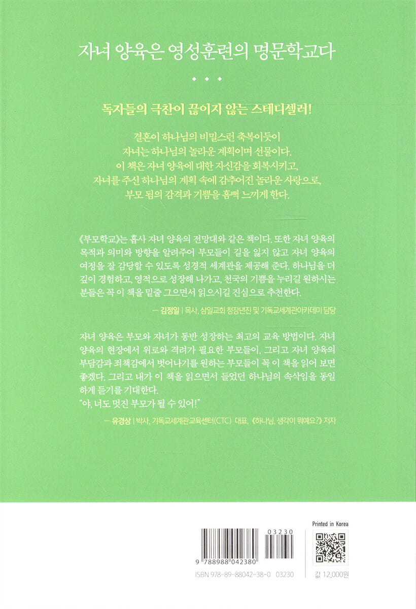 『부모학교』는 흡사 자녀 양육의 전망대와 같은 책이다. 또한 자녀 양육의 목적과 의미와 방향을 알려주어 부모들이 길을 잃지 않고 자녀 양육의 여정을 잘 감당할 수 있도록 성경적 세계관을 제공해 준다. 하나님을 더 깊이 경험하고, 영적으로 성장해 나가고, 천국의 기쁨을 누리길 원하시는 분들은 꼭 이 책을 밑줄 그으면서 읽으시길 진심으로 추천한다. - 김정일 (목사, 삼일교회 청장년진 및 기독교세계관아카데미 담당)