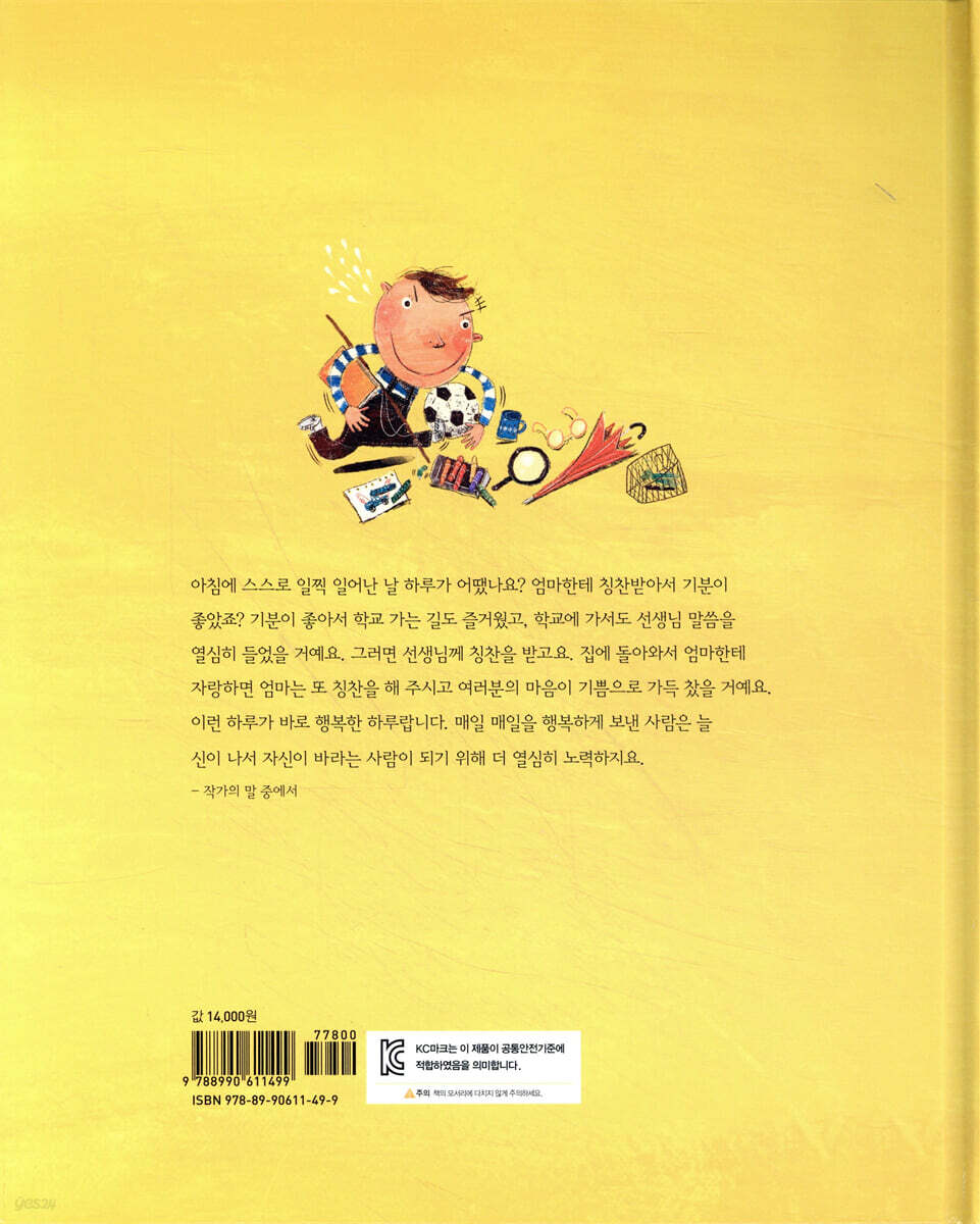 아이가 꿈을 이루도록 도와주려면 어떻게 하는 것이 가장 좋을까요? 그건 바로 행복한 하루를 보내게 도와주는 것입니다. 아이가 아침에 스스로 일찍 일어난 날, 엄마의 칭찬으로 하루가 시작됩니다. 기분이 좋아서 학교 가는 길도 즐겁고, 학교에 가서도 선생님 말씀을 열심히 듣게 됩니다. 그러면 선생님께 칭찬을 받지요. 집에 돌아와서 엄마한테 학교에서 칭찬받은 일을 자랑하면 엄마는 잘했다고 또 칭찬을 해 줍니다. 그러면 아이들의 마음은 기쁨으로 가득 찹니다. 이런 하루가 바로 행복한 하루입니다. 매일 매일을 행복하게 보낸 사람은 늘 신이 나서 자신의 꿈을 이루기 위해 더 열심히 노력하지요. 하루를 행복하게 보내는 12가지 방법 이 책은 어린이들에게 하루를 즐겁고 행복하게 보내는 12가지 방법을 알려 줍니다. '12개의 황금씨앗'이라고 부르는 것들이지요. 어린이 여러분이 이 씨앗들을 하나하나 마음속에 잘 심고 매일 매일 물을 준다면, 머지않은 미래에 분명히 자신이 바라는 사람이 되어 있을 것입니다. 아침을 즐겁게 시작하기, 하루 동안 어떤 일을 할까 생각하기, 학교에 일찍 가서 친구들과 반갑게 인사하기, 어려운 문제를 내 힘으로 풀기, 학교에서 씩씩하게 발표하기, 친구와 사이좋게 지내기, 숙제를 미루지 않고 오늘 끝내기, 커서 무엇이 될까 생각하기, 가족과 즐거운 하루 보내기. 이렇게 하면 행복한 하루를 만들 수 있답니다. 나의 행복한 하루 만들기 책을 다 읽은 후에는 어린이들이 자신의 하루 생활이 어땠는지를 체크해 볼 수 있도록 '나의 행복한 하루 만들기' 스티커 판을 마련했습니다. 예쁜 스티커를 하나둘씩 판에 붙여 나가다보면, 아이들은 저도 모르게 하루 동안 있었던 일들을 머릿속에 되새기면서 자신의 생활을 행복하게 만들어 나갈 것입니다. 또한 자신의 꿈에 한 걸음 더 가까이 갈 것입니다. |