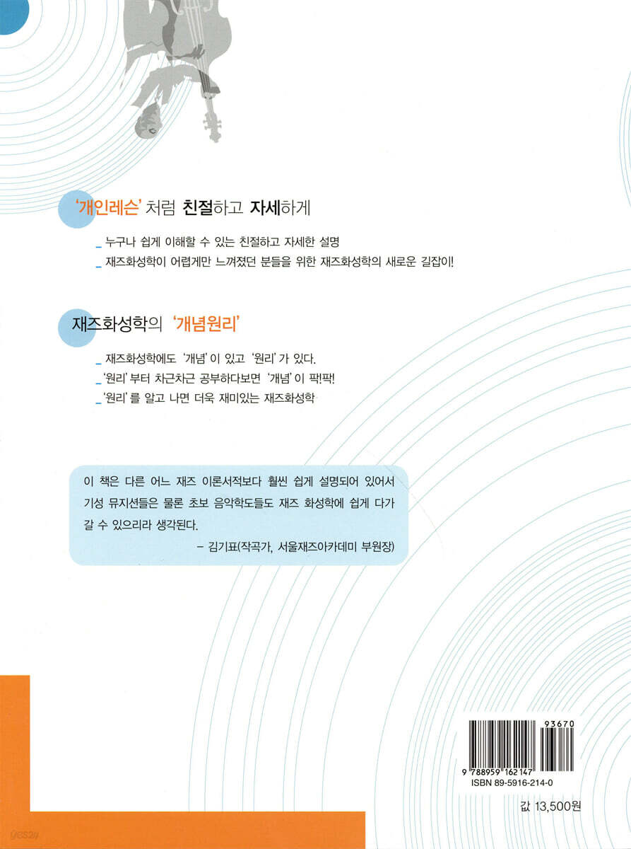 음악이론은 철저하게 경험을 중심으로 한 이론적 체계라고 볼 수 있다. 간단한 예로 함께 울렸을 때 듣기 편안한 소리는 3도, 6도 등의 협화음으로, 불편한 소리는 단2도, 증4도 등의 불협화음으로 정리된 식이다. 그러나 음악이론을 배워나가다 보면 이러한 사실을 잊고 이론의 테두리 안에 갇혀버리는 경우가 종종 있다. 이것은 그 이론이 어떠한 과정을 통해 정리되었는지를 모르고 단순하게 암기해버린 결과이며 이런 경우 음악이론은 수학의 ‘1, 2, 3, 4’ 를 ‘도, 레, 미, 파 ’로만 바꿔놓은 복잡하고 어려운 것으로 인식하기 십상이다. 이런 면에서 <쉽게 배우는 재즈화성학>의 출간은 실용음악을 공부하는 사람들에게 매우 반가운 소식이 아닐 수 없다. 현 서울재즈아카데미의 부원장인 중견 작곡가 김기표 님의 추천사에서 ‘다른 어느 재즈 이론서적보다 훨씬 쉽게 설명되어 있어서 기성 뮤지션들은 물론 초보 음악학도들도 재즈 화성학에 쉽게 다가갈 수 있으리라 생각된다.’ 라고 밝히고 있듯이 이 책은 재즈화성학 이론을 원리부터 차근차근 알아갈 수 있도록 하는데 그 목적을 두고 있다. 개인레슨처럼 친절하고 자세한 설명은 독자들이 재즈화성이론을 더욱 쉽고 편안하게 알아갈 수 있도록 도와줄 것이며 특히 전체 책의 분량 중 상당한 부분을 차지하고 있는 예제악보와 도표들을 통해 제시된 이론들이 어떠한 방법으로 적용될 수 있는지를 효과적으로 파악할 수 있도록 구성하였다. 또한 각 챕터는 Tension, Secondary Dominant, Modal Interchange 등의 주요 개념별로 정리되어있어서 각각의 개념들을 효과적으로 정리할 수 있도록 하였으며 궁금한 부분만 따로 찾아보기도 매우 수월하다. 저자서문에서 밝힌 저자의 바람처럼 이 책은 화성학이 어려워 배우기를 포기하려는 음악후배들과 학생들, 아직 체계적인 재즈화성학을 배우지 못한 음악인들, 그리고 재즈화성학을 궁금해 하는 클래식 음악인들에게 쉽고 즐겁게 재즈화성학을 알아가도록 도와주는 길잡이가 될 것이다. |