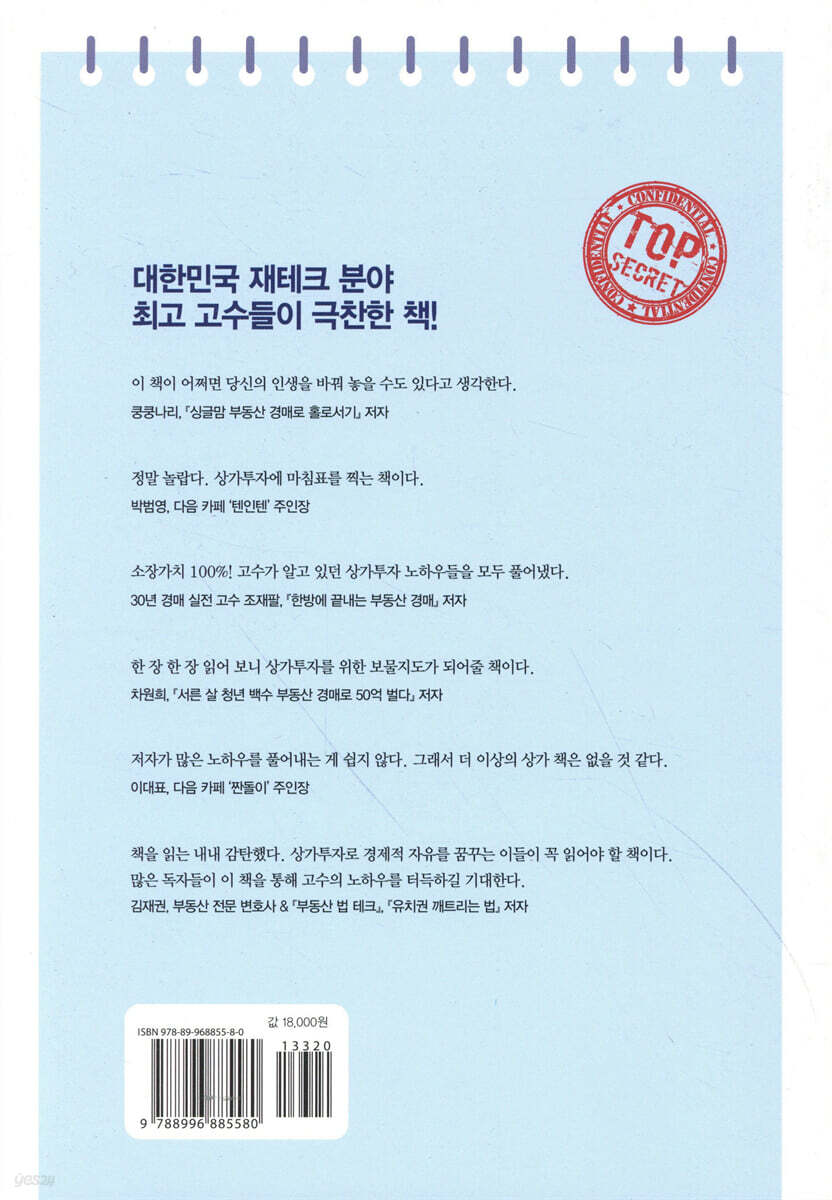 안정된 노후를 위해 절약보다 수입을 늘려야 한다. 오랜 저금리 여파로 인해 직장인은 물론 남녀노소를 가리지 않고 투자를 공부하며 노후를 준비하는 시대다. IMF 이후 기업이 살아남기 위해 구조조정이란 단어가 등장하여, 그 후로 평생직장이란 개념은 사라져버렸고, 아무리 충성한다고 할지라도 직장이 직원을 책임져주지 않는다는 것을 깨닫게 되었다. 즉, 직장에서 자신의 모든 노력을 쏟아 붓더라도 미래는 여전히 불안하다는 것이다. 그래서 이제는 안정된 노후를 위해 본인 스스로 미래를 준비해야 한다. 필자 역시 직장에 다녔을 때 열심히 살아도 늘 부족했던 것 같다. 아무리 아껴 쓰고, 노력해도 삶은 여유롭지 못했다. 어느 순간 소비를 줄이는 것보다 수입을 늘리는 것이 훨씬 현명한 선택이라고 생각했다. 그리고 급여 외 수입을 늘리기로 마음먹었고, 택한 것이 상가투자였다. 지금은 보유한 상가에서 한 달에 직장인 연봉만큼 수익을 거두는 부자가 되었다. 이 책에서 상가의 종류가 무엇이고 어떤 상권이 오래 지속되는지, 어떻게 돈 되는 상가를 매입하고 만족스런 가격에 매도하려면 어떤 요건을 주의해야 하는지, 임대차 과정에서 주의해야 할 것은 무엇이고 어떻게 해야 더 많은 월세와 매도차익을 올릴 수 있는지 등 상가투자의 핵심만을 담았다. 수익형 부동산은 상가투자가 답이다 사상 최저 금리 시대다. 상가투자가 매력적이라는 것은 투자자들 사이에서 오래 전부터 알려져 있었다. 예금 금리는 물가 상승률에도 못 미치고, 주식은 연이은 산업별 구조조정 소식으로 지뢰밭인 것 같다. 빌라나 아파트에 세를 놓자니 본인 소유의 집이 늘어날수록 수리해 달라는 것도 많고 머릿속이 복잡해진다. 반면 상가투자는 매월 현금이 들어오는 구조를 만들 수 있는 훌륭한 재테크 수단이다. 우수한 상권이 갖춰진 상가를 골라 임차인을 잘 맞춰 놓으면 꼬박꼬박 월세가 들어온다. 매달 순이익만 따져도 방 2~3개짜리 빌라 5~10채보다 대개 10평짜리 상가 1채의 수입이 낫다. 또한 상가에 기본적인 시설만 해 놓으면 내 가게를 임차인이 알아서 꾸미고 영업한다. 주택을 임차하는 것보다 관리도 쉽고, 임차인 덕에 부동산의 가치도 커진다. 게다가 임대료가 오르면 수익률이 높아져서 상가의 가치가 올라가므로, 매매가도 상승한다. 일석삼조, 사조의 투자 구조를 지니고 있는 것이 바로 상가다. 이 책을 통해 성공적인 상가투자 방법을 터득하여 여유롭고 행복한 미래를 설계해 보자. 대한민국을 대표하는 재테크 고수들의 추천사 이 책이 어쩌면 당신의 인생을 바꿔 놓을 수도 있다고 생각한다. _쿵쿵나리 이선미, 『싱글맘 부동산 경매로 홀로서기』 저자 정말 놀랍다. 상가투자에 마침표를 찍는 책이다. _박범영, 다음 카페 ‘텐인텐’ 주인장 소장가치 100%! 고수가 알고 있던 상가투자 노하우들을 모두 풀어냈다. _30년 경매 실전 고수 조재팔, 『한방에 끝내는 부동산 경매』 저자 한 장 한 장 읽어 보니 상가투자를 위한 보물지도가 되어줄 책이다. _족장 차원희, 『서른 살 청년백수 부동산 경매로 50억 벌다』 저자 저자가 많은 노하우를 풀어내는 게 쉽지 않다. 그래서 더 이상의 상가 책은 없을 것 같다. _이대표, 다음 카페 ‘짠돌이’ 주인장 책을 읽는 내내 감탄했다. 상가투자로 경제적 자유를 꿈꾸는 이들이 꼭 읽어야 할 책이다. 많은 독자들이 이 책을 통해 고수의 노하우를 터득하길 기대한다. _김재권, 부동산 전문 변호사 & 『부동산 법 테크』 『유치권 깨트리는 법』 저자 |