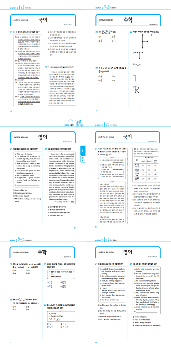 1. 2016년 모의고사(A) (1)국어 (2)수학 (3)영어 2. 2016년 모의고사(B) (1)국어 (2)수학 (3)영어 PART 2 2015학년도 기출문제 1. 2015년 수시적성고사 (1)국어 (2)수학 (3)영어 2. 2015년 모의고사(A) (1)국어 (2)수학 (3)영어 3. 2015년 모의고사(B) (1)국어 (2)수학 (3)영어 PART 3 2014학년도 기출문제 1. 2014년 수시1차(인문) (1)국어 (2)수학 (3)영어 2. 2014년 수시1차(자연) (1)국어 (2)수학 (3)영어 3. 2014년 모의고사(A) (1)국어 (2)수학 (3)영어 4. 2014년 모의고사(B) (1)국어 (2)수학 (3)영어 |