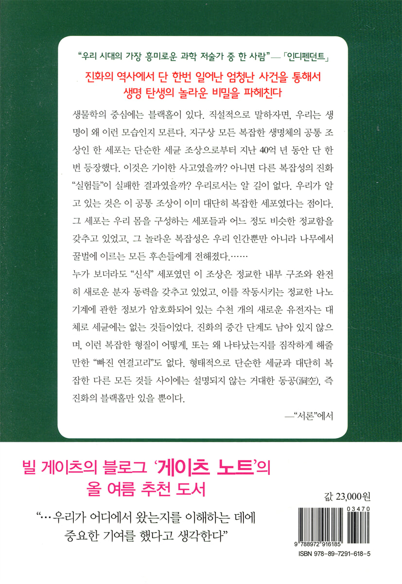 진화와 관련된 수많은 정보와 서적들을 통해서 우리는 생명 진화에 대해서 많은 것을 알게 되었다. 우리와 침팬지가 갈라진 시기와 진화의 경로를 상세히 알고 있으며, 그런 연구를 통해서 생명에 대한 우리의 인식은 엄청난 발전을 해왔다. 그러나 우리는 왜 배우자를 찾아 짝짓기를 하며, 왜 노화로 괴로워하고, 왜 죽음을 맞는지를 모른다. 즉 우리는 생명이 왜 이런 모습인지를 모른다. 혁신적인 생화학자인 닉 레인은 21세기 생물학을 통해서 20세기 생물학이 규명하지 못했던 문제에 정면으로 도전한다. 그는 생명이 어떻게 최초로 탄생하게 되었는지에 대한 해답을 찾고자 한다.