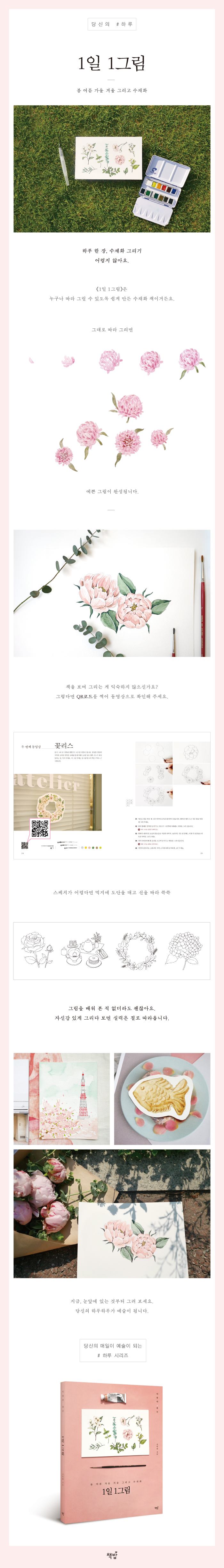 1일 1그림을 위한 준비물 1일 1그림을 시작하기 전에 이 책을 보는 방법 _ 봄날, 1일 1그림 봄, 첫 번째 샌드위치 봄, 두 번째 민들레 봄, 세 번째 마카롱 봄, 네 번째 개나리 봄, 다섯 번째 라일락 봄, 여섯 번째 오늘의 옷차림 봄, 일곱 번째 벚꽃 봄, 여덟 번째 꽃과 나비 봄, 아홉 번째 작약 봄, 열 번째 딸기케이크 _ 여름날, 1일 1그림 여름, 첫 번째 아이스크림 여름, 두 번째 과일 여름, 세 번째 청포도 여름, 네 번째 선인장 여름, 다섯 번째 맥주 여름, 여섯 번째 해바라기 여름, 일곱 번째 아이스라테 여름, 여덟 번째 나뭇잎리스 여름, 아홉 번째 냉면 여름, 열 번째 수국 _ 가을날, 1일 1그림 가을, 첫 번째 감 가을, 두 번째 천일홍 가을, 세 번째 코스모스 가을, 네 번째 보름달 가을, 다섯 번째 단풍잎 가을, 여섯 번째 책 읽는 오후 가을, 일곱 번째 단풍나무와 은행나무 가을, 여덟 번째 장미 가을, 아홉 번째 티타임 가을, 열 번째 파우치 _ 겨울날, 1일 1그림 겨울, 첫 번째 펭귄 겨울, 두 번째 솔방울 겨울, 세 번째 뜨개질 겨울, 네 번째 목화와 유칼립투스 겨울, 다섯 번째 양말 겨울, 여섯 번째 동백꽃 겨울, 일곱 번째 오너먼트 겨울, 여덟 번째 커피와 모카포트 겨울, 아홉 번째 붕어빵 겨울, 열 번째 크리스마스 _ 여행 중, 1일 1그림 첫 번째 여행 에펠탑 두 번째 여행 도쿄타워 세 번째 여행 남산타워 _ 동영상으로 보는, 1일 1그림 첫 번째 동영상 In My Bag 두 번째 동영상 꽃리스 세 번째 동영상 주방 네 번째 동영상 책상 다섯 번째 동영상 꽃다발 _ 1일 1그림, 소품으로 활용하기 첫 번째 소품 명함 두 번째 소품 스티커 세 번째 소품 청첩장 스케치 도안 |