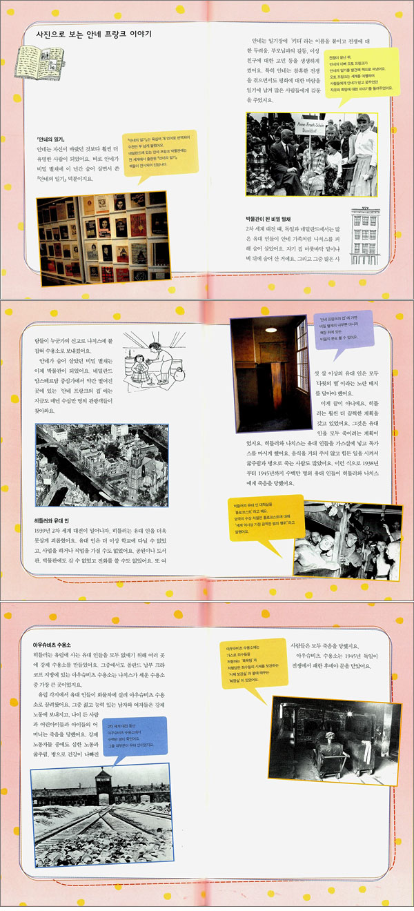 「새싹 인물전」 시리즈 1권 『최무선』은 우리나라 최초의 화약 무기 발명가인 최무선의 이야기로, 황금도깨비상 수상 작가 김종렬이 글을 쓰고 언더그라운드 만화계의 스타인 이경석이 그림을 그렸다. 『최무선』에서는 궁궐에서 하던 불꽃놀이를 보고 화약에 관심을 갖게 된 최무선의 어린 시절부터 화약 만드는 법을 알아내기 위한 악전고투의 과정, 수년간의 노력 끝에 개발한 화약 무기를 이용해 왜구를 몰아내는 통쾌한 진포 대첩 등이 흥미진진하게 펼쳐진다. 또한 한 치 앞을 내다보지 못한 고려의 관리들 때문에 화통도감을 닫게 되었을 때 최무선이 비통해하는 모습이나 그럼에도 절망하지 않고 『화약수련법』, 『화포법』 등의 책을 쓰는 장면은 깊은 감동을 준다. 김종렬의 글은 인물의 업적과 일화를 시간에 따라 나열하거나 성공을 지나치게 미화하는 대신 아이들의 눈높이에서 친근하게 이야기를 건넨다. 짧지만 리듬감 있는 문장, 우리말의 맛을 살린 구성진 대화문 등이 이야기에 속도감을 더한다. 한편 이경석의 그림은 기존의 위인전의 공식을 완전히 깨뜨린다. 이 책에서 이경석은 머리에 화약의 심지가 달린 최무선 캐릭터를 새롭게 선보이는데, 솥단지에 안에 들어가 화약 만드는 법을 고민하는 최무선의 머리에 부지직 불타는 불꽃은 그 자체만으로도 충분히 웃음을 자아낸다. 하루 종일 화약 만들 궁리만 하는 최무선의 일과를 시간대별로 보여 주는 만화 형식의 삽화 등도 아이들의 눈길을 사로잡는다. 2권 안네 프랑크 「새싹 인물전」 시리즈 2권은 ‘안네의 일기’의 주인공, 안네 프랑크 이야기이다. 유대 인 소녀 안네는 히틀러를 피해 ‘비밀 별채’에 숨어 사는 동안 쓴 일기는 전쟁의 잔인함을 알리는 한편, 절망 속에도 사그라지지 않은 희망으로 많은 사람들에게 감동을 주었다. 이 책은 비밀 별채에 나치스가 언제 들이닥칠지 몰라 불안해하는 안네의 모습과 짝사랑하는 소년에 대한 감정과 훌쩍 자란 몸에 맞지 않는 옷 등에 대해 투덜거리는 안네의 모습을 교차하는 방법으로 아이들에게 자연스럽게 전쟁의 부조리함과 참혹함을 보여 준다. 4권 마리 퀴리 「새싹 인물전」 시리즈 4권은 노벨상을 처음으로 받은 여자 과학자, 마리 퀴리 이야기이다. 여자는 과학자가 될 수 없다고 생각하는 사람들이 대부분이던 시절, 마리 퀴리는 세계 최초로 방사능 물질인 폴로늄과 라듐을 찾아내 노벨상을 받았다. 어린 시절에 큰언니와 엄마를 병으로 잃고, 결혼 후에는 남편이 마차 사고로 죽는 등 평생 동안 불행한 사건이 끊이지 않았음에도 마리 퀴리는 과학자가 되고 싶다는 꿈을 포기하지 않는다. 어떠한 역경에도 자신의 꿈을 놓치지 않는 마리 퀴리의 모습은 아이들에게 꿈의 의미를 다시 한 번 생각하게 한다. |