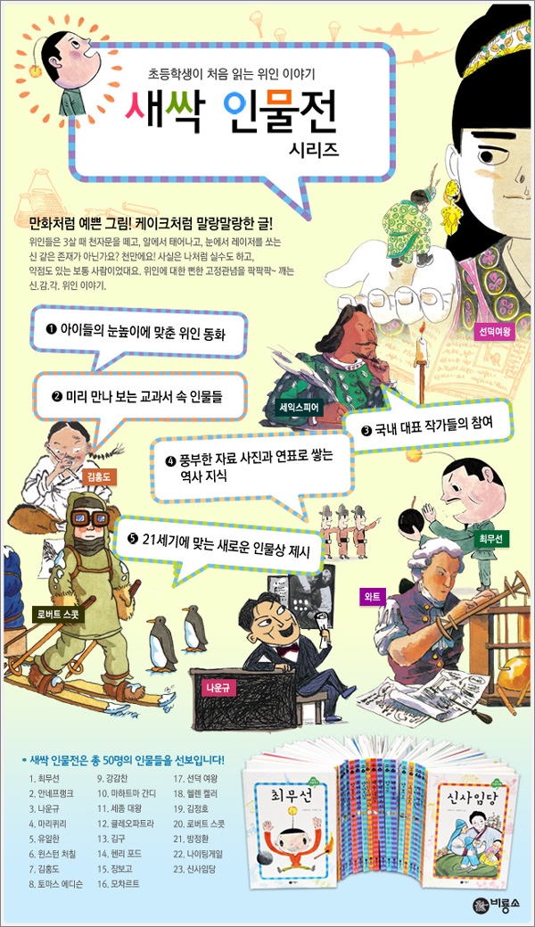 초등학교 저학년 아이들을 위한 위인 동화 「새싹 인물전」 시리즈가 (주)비룡소에서 출간되었다. 박이문(연세대 철학), 장영희(서강대 영문학), 안광복(중동고 철학 교사)이 기획위원으로 참여한 이 시리즈는 공지희 임사라 한정기 이경석 최호철 등 우리나라를 대표하는 동화 작가들과 화가들이 대거 참여한 창작물과 함께, 영국 Franklin Watts 출판사의 저학년용 위인 동화 「Famous People Famous lives」 시리즈를 번역 소개한다. 이번에 출간된 1권 『최무선』, 2권 『안네 프랑크』, 4권 『마리 퀴리』에 이어 매달 두 권씩 총 50권이 출간될 예정이며, 6세에서 9세 아이들을 눈높이에 맞춰 사회 변화에 따른 새로운 위인상을 제시한다. 비룡소의 「새싹 인물전」 시리즈는 사회적으로 큰 성공을 거둔 사람들보다는 한 인간으로서 자신에게 철저하고 진실했던 인물들을 중심으로, 꿈을 키우고 이루어 가는 과정에서 배우고 경험하게 되는 것들의 가치와 소중함을 보여 준다. 우리나라를 대표하는 동화 작가 공지희, 임사라, 한정기 등이 그리는 위인들은 하늘 위에서 빛나는 신과 같은 존재가 아닌, 옆자리 짝꿍처럼 친근한 인물이다. 회화와 만화의 장르 간 경계를 허물었다는 평가를 받은 바 있는 이경석, 유승하, 최호철 등의 그림은 자칫 생소할 수 있는 옛사람들의 이야기를 일상의 사건처럼 친숙하게 만들어 준다. 책 맨 뒤에는 풍부한 사진 자료와 연표로 꾸며진 부록이 실려 있어 인물의 이해를 돕는 한편, 아이들로 하여금 다양한 역사 상식을 쌓을 수 있도록 했다. 그중 ‘사진으로 보는 인물 이야기’는 인물이 살던 시대를 충실히 고증하며, ‘왜 그 인물이 그런 삶을 살게 되었는지’를 입체적으로 추적한다. 또 ‘비교하면 더 재미있는 역사의 순간’은 인물의 생애와 함께 그와 관련된 사회적 이슈의 역사를 비교해 볼 수 있도록 구성하여, 오늘날의 삶과 동떨어진 과거의 인물이 아니라 현재까지도 우리의 삶에 미치는 영향을 살아 있는 인물을 보여 준다. ●시리즈 특징 21세기에 어울리는 새로운 인물상 제시 위인전의 상당수는 인물의 입지전적 성공담에 쏠려 있는 경우가 많다. 하지만 이런 위인전은 아이들에게 깊은 좌절과 열등감을 안겨 주기 쉽다. 「새싹 인물전」 시리즈는 이름이 널리 알려진 사람보다는 자신의 삶에 최선을 다한 인물, 큰 성공을 성취한 사람보다는 한 인간으로서 자신에게 진실하고 철저했던 인물들을 새로운 인물상으로 제시한다. 또한 세상 사람들의 우러름을 받는 위인들도 여느 아이들과 같은 시절을 겪었음을 보여 줌으로써, 아이들에게 열등감을 주지 않고 위인들의 모습을 마음속에 담을 수 있도록 도와준다. 풍부한 자료 사진과 연표로 쌓는 역사 지식 저학년 아이들의 독서력을 고려해 본문을 읽기 쉬운 동화 형식으로 구성한 대신, 부록에는 보다 충실한 내용과 사진 자료들을 담았다. 한 인물의 업적은 그 시대 상황 속에서 볼 때 비로소 올바르게 평가될 수 있기 때문이다. 「새싹 인물전」 시리즈는 ‘사진으로 보는 인물 이야기’, ‘비교하면 더 재미있는 역사의 순간’ 등의 부록을 통해 역사의 큰 흐름 속에서 인물을 이해할 수 있도록 도와줄 뿐 아니라 다양한 역사 상식도 익힐 수 있도록 했다. 미리 만나 보는 교과서 속 인물들 「새싹 인물전」 시리즈에서는 세종 대왕, 김구, 최무선, 신사임당, 토마스 에디슨, 마리 퀴리 등 초등학교 교과서에 나오는 인물들을 한발 앞서, 한층 쉽고 재미있는 내용으로 만날 수 있다. 또한 조선의 여자 상인 김만덕, 우리나라 최초의 영화감독 나운규, 세계적인 비디오 아티스트 백남준, 점자를 발명한 루이 브라유 등 이전의 위인전에서는 잘 다루지 않았던 다양한 인종과 성별, 직업의 인물들, 여성이나 장애우 등 소수자의 삶에도 관심을 기울여 소개한다. 국내 대표 작가들의 참여 「새싹 인물전」 시리즈에는 공지희, 임사라, 한정기 등 우리나라를 대표하는 동화 작가들과 이경석, 유승하, 장차현실, 최호철 등 회화와 만화의 경계를 아우르는 화가들, 정영목, 유시주, 이다희 등 솜씨 좋기로 유명한 번역가들이 대거 참여했다. 이들이 솜씨를 부린 쉽고 유머러스한 글과 익살스럽고 재기 발랄한 그림은 아이들이 인물 속으로 투영되어 그 인물과 일체감을 느낄 수 있도록 도와준다. 특히 예사롭지 않은 태몽이나 어린 시절의 비범한 에피소드로 인물을 지나치게 위대하게 묘사하는 인물전의 오랜 전통에서 벗어나 인물의 인간적인 약점이나 실수, 또 고뇌와 절망을 극복해 가는 모습을 고루 담은 진솔하고 감동적인 이야기는 아이들에게 더없이 훌륭한 읽을거리이다. |