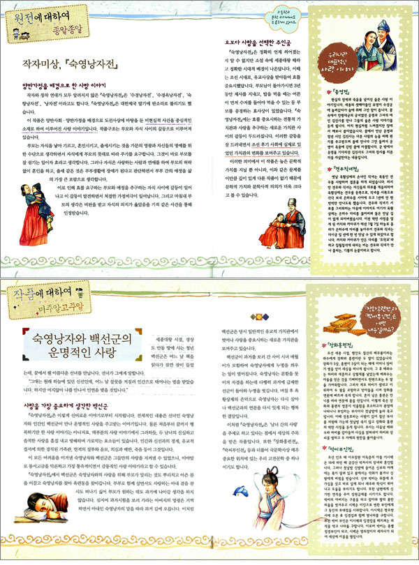 '교과서에서 쏙쏙 뽑은 우리고전' 은 초·중·고 교과서에 나오는 고전 작품들을 총망라한 방대한 시리즈로, 아이들이 재미있게 읽을 수 있도록 한국고전번역원에서 번역한 원전을 바탕으로 검증받은 실력 있는 작가들이 참여해 아이들 눈높이에 맞춰 새롭게 탄생시켰다. 고전에는 앞서 살다간 선조들의 삶의 지혜가 담겨 있다. 과거를 알아야 미래도 내다볼 수 있는 법. 21세기를 살아갈 아이들이 고전을 꼭 읽어야 하는 이유가 여기에 있다. 삶의 지혜와 재미, 과거와 현재의 역사, 상상력과 비판적 사고의 폭, 논술실력과 언어능력을 향상시켜줄 흥미진진한 이야기의 세계가 '교과서에서 쏙쏙 뽑은 우리고전' 속에 있다. 숙영낭자와 백선군의 운명적인 사랑 ‘교과서에서 쏙쏙 뽑은 우리고전’ 시리즈의 네 번째 책으로 『숙영낭자전』이 『하늘도 감동한 사랑』이라는 이름으로 나왔다. 언제, 누가 지었는지 알 수 없지만 많은 이들에게 감동을 준 고전소설이다. 양반가정에서 태어난 주인공이 하늘과 땅을 사이에 두고 선녀와 나누는 사랑 이야기이다. 주인공 백선군이 선녀인 숙영낭자를 꿈속에서 만나 사랑에 빠지고, 현실에서 부부가 되어 운명적인 사랑을 주고받는다. 하지만 전통적 가치관을 중시하는 가족과 행복을 시기하는 주변 인물들에 의해 갈등을 겪게 된다. 그때나 지금이나 자식 걱정을 하는 부모, 현실을 초월한 절대적인 사랑 등이 중심 이야기를 이룬다. 백선군과 숙영낭자의 죽음마저 뛰어넘는 숭고하고 아름다운 사랑은 서정적인 삽화와 함께 감동을 선사한다. 이 작품에서는 효를 요구하는 부모와 사랑을 추구하는 자식 사이의 갈등이 발전하면서 가정비극을 겪게 된다. 효는 유교도덕에 바탕을 둔 전통적 가치관이고 애정의 추구는 인간의 본능적 욕구를 인정하는 새로운 가치관이다. 둘 사이의 갈등은 조선 후기 사회에 있었던 시대적인 가치관의 변화를 잘 보여준다. 이러한 의미에서 문학적 가치와 문학사적 의의가 더욱 크다. 학습과 연계한, 알기 쉽게 설명한 부록 이 책의 앞뒤로 다양한 내용의 부록이 풍성하게 실려 있다. 『하늘도 감동한 사랑』을 읽고 난 후 함께 읽으면 좋은 책으로 『춘향전』, 황순원의 『소나기』, 김시습의 『이생규장전』을 소개한다. 아이들이 비슷한 주제나 소재의 책을 더불어 읽음으로써 비교해서 책을 읽을 수 있는 능력과 폭넓은 독서를 할 수 있게 이끈다. 이야기 속에서 뽑은 고사성어를 재미난 이야기와 함께 소개하고, 책 속에 나오는 신선사상이나 정렬부인에 대해서 알기 쉽게 설명한다. 이 책이 씌어진 조선 후기 사회에 우리나라와 외국에서는 어떤 일들이 벌어졌는지 한눈에 알 수 있게 보여주는 ‘시대가 한눈에 쏙~’이라는 페이지도 있다. 다양한 부록을 통해 아이들이 단순히 옛이야기를 읽는 데서 끝나지 않고 학교 공부와 연계한 내용을 재미나게 배울 수 있도록 한 것이 이 책의 특징이다. '교과서에서 쏙쏙 뽑은 우리고전' 시리즈만의 장점! -한국고전번역원과 함께하는 원작의 세계 한국고전번역원은 어려운 한문으로 쓰인 우리 고전을 오늘의 말로 옮기는 작업을 하는 정부출연기관이다. 고전번역 분야에서 최고의 권위를 인정받는 한국고전번역원에서 제공한 원전을 기초로 하였기 때문에 다른 어떤 책보다 내용에 대해 신뢰할 수 있는 것이 이 시리즈의 미덕이다. 게다가 왕성하게 활동하고 있는 소설가, 시인, 아동문학가 등이 참여해 아이들이 읽기 쉽게 아름답고 정제된 언어로 풀었다. 한국고전번역원과 생각의나무는 ‘교과서에서 쏙쏙 뽑은 우리고전’을 만들어 아이들에게 고전만이 줄 수 있는 삶의 지혜와 재미를 전하려 한다. -초·중·고 교과서, 수능 언어영역 출제 고전소설 총망라 초·중·고 교과서에 수록된 고전소설을 총망라하였고, 최근 10년간 수능시험에 출제된 고전소설의 리스트를 모두 포함시켰기 때문에 미래의 수험생인 어린이들에게 학습 능력을 높이는 길잡이가 될 것이다. 아울러『삼국유사』,『삼국사기』,『고려사』,『조선왕조실록』등을 모두 수록하여 국내 고전 분야에서 유례없는 시리즈다. '교과서에서 쏙쏙 뽑은 우리고전' 시리즈가 가진 특별한 부록 고전 작품으로 만나는 종합교육시스템으로, 단순히 옛이야기를 읽는 데 그치지 않고 시대에 맞게 '역사+논술+한자'공부의 형태로 현대화하여 새롭게 구성했다. ▲시대가 한눈에 쏙(우리나라/세계 연대표) : 작품의 시대적 배경을 우리나라와 서양에서 일어난 중요 사건을 담은 연대표로 보여줌으로써 세상을 보는 눈을 넓혀준다. ▲원전에 대하여 종알종알 : 원전에 대한 구체적인 소개와 원전이 차지하는 의미나 그에 얽힌 이야기를 소개한다. ▲작품에 대하여 미주알고주알 : 작품의 주제나 소재에 대한 분석을 상세히 알려줌으로써 학습 능력을 배가시킨다. ▲생각거리 콕콕 : 본문을 읽다보면 책 모양의 얼굴을 한 캐릭터가 나와서 생각할 거리들을 콕콕 짚어준다. 비판적인 책읽기가 저절로 이뤄진다. ▲이야기 속 고사성어 : 고전소설에 나온 이야기와 관련하여 고사성어를 소개하고 그에 얽힌 이야기를 재미있게 들려준다. ▲알쏭달쏭 궁금증을 풀