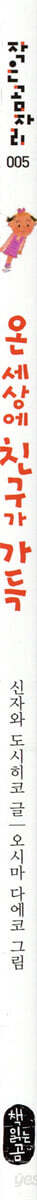 요즘 아이들은 유난히 ‘내-’라는 말을 많이 씁니다. 내 엄마, 내 아빠, 내 집……. 표현이 서툰 서너 살 무렵에나 쓸 법한 말을 초등학생이 되도록 쓰는 아이들을 자주 보게 됩니다. 너나없이 형제자매 없는 외둥이로 자라다 보니 남과 더불어 무언가를 나눌 기회도 적고, 그래야 할 필요도 느끼지 못하는 탓이 아닐까 싶습니다. 하지만 ‘내-’로 규정지을 수 있는 세계란 얼마나 좁은지요. 『온 세상에 친구가 가득』은 이처럼 좁은 세계 안에 머물러 있는 아이들에게 “자, 한 발짝만 걸어 나와 봐.” 하고 손짓합니다. 그리고 이렇게 한 발짝씩 걸어 나온 ‘나’와 ‘네’가 어울려 ‘우리’가 될 때 얼마나 멋진 일이 일어나는지를 유쾌하게 그려 보입니다. 세상 모든 것과 친구가 되는 마법의 주문, “친구의 친구는 친구!” 이야기는 어느 유치원에서나 흔히 볼 수 있는 작은 실랑이에서 시작됩니다. 싱글벙글 유치원에 다니는 미래는 ‘하마 붕붕이’ 그림책을 가장 좋아합니다. 오늘도 하마 붕붕이 그림책을 보고 있는데, 산이가 다가와 “나도 보여 줘.” 하고 졸라 댑니다. “안 돼! 붕붕이는 내 친구란 말이야.” 미래가 쌀쌀맞게 퇴짜를 놓자 산이도 그만 발끈하고 맙니다. “뭐, 괜찮아. 나는, 책꽂이에 있는 책이 다 내 친구니까.” 하고 느물대는 산이와 “흥! 흥! 그럼 나는, 우리 교실에 있는 거 모두 모두 내 친구야.” 하고 맞서는 미래. 두 꼬맹이가 복어처럼 볼을 잔뜩 부풀린 채 제대로 한 판 붙어 보려는 순간, ‘똑똑새’ 도희가 달려옵니다. “친구의 친구는 친구야.” 도희의 마법 같은 한마디에 매료된 꼬맹이들은 조금 전까지 토닥거렸던 것도 까맣게 잊고 ‘친구의 친구 찾기’에 나섭니다. 친구가 늘어날수록 내 세계도 넓어진다! ‘어, 우람이가 원장 선생님이랑 친구였어? 우리도 질 수 없지. 친구의 친구는 친구니까 우리도 원장 선생님이랑 친구!’ 이렇게 친구의 친구를 찾아 ‘우리 친구’로 만들어 가는 사이에 아이들은 서로에 대해 몰랐던 것을 하나하나 알아갑니다. ‘에, 지원이가 개미를 좋아했어? 어, 준이는 노래를 참 잘하네. 아아, 고은이는 혼자 있을 때면 하늘이랑 이야기를 하는구나.’ 하고 말입니다. 아울러 ‘나’라는 좁은 세계 안에 머물러 있었다면 결코 알지 못했을 세계를 내 것으로 품어 안게 됩니다. 아이들을 가장 잘 아는 작가가 아이들의 목소리로 들려주는 ‘친구론’ 작가 신자와 도시히코는 ‘사람과 사람이 만나 친구가 된다는 것은 서로의 삶을 더욱 깊고 넓고 풍부하게 만드는 일이다.’라는 아이들에게는 조금 어려울 수도 있는 이야기를 하나도 어렵지 않게 들려줍니다. 그 모든 이야기가 아이들이 가장 잘 알아들을 수 있는 ‘아이들의 말’로 쓰여 있기 때문이지요. 그것은 작가가 유치원 선생님으로, 동요 작곡가뾔, 그림책 작가뾔 늘 아이들 곁에 머물러 있는 사람이기에 가능한 일일 것입니다. 한편 화가 오시마 다에코는, 크레파스와 색연필로 그린 친근감 넘치는 그림으로 아이들의 마음을 사로잡습니다. 보기만 해도 기분이 좋아지는 그림 속에는 작가가 못 다한 재미난 이야기들이 숨어 있습니다. 작가의 말 개인을 존중하고 개성을 소중히 여겨라. 정말 옳은 말이에요. 저도 이 말에 찬성해요. 하지만 이 말이 제 멋대로 살자는 뜻은 아닐 거예요. 모두 나는 나, 너는 너, 하고 등을 돌린 채 살아간다면 삶이 너무 쓸쓸하지 않겠어요? 사람이 저마다 다르다는 건 그만큼 다양한 가치관과 세계관이 존재한다는 뜻이지요. “넌 그런 걸 좋아하니? 세상을 그런 식으로 볼 수도 있구나!” 하고 생각과 느낌을 나눈다면, 삶은 훨씬 풍성해질 거예요. 다른 사람과 만나는 건 그 사람이 지닌 다른 세계와 만나는 것이기도 해요. 그건 자기 세계를 더 넓고 풍성하게 만들어 가는 일이지요. 저는 어렸을 때 친구 사귀는 게 서툴러서 혼자 책을 읽거나 그림을 그리며 놀았어요. ‘어차피 날 알아주지도 않을 텐데 뭐.’ 하면서 마음을 닫고 지냈지요. ‘그러지 말고 마음을 활짝 열었더라면 좋았을 텐데…….’ 하는 마음으로 이 이야기를 썼어요. -신자와 도시히코 |