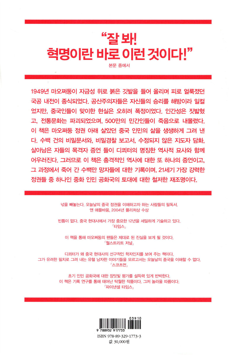 중국 공산당은 1949년에 거둔 그들의 승리를 [해방]이라고 말한다. 해방이라는 단어는 거리로 쏟아져 나와 새로 쟁취한 자유를 자축하며 환호하는 군중을 떠올리게 하기 마련이지만 중국의 해방과 그 뒤를 잇는 혁명의 이야기는 평화나 자유, 정의와 무관하다. 다른 무엇보다, 계산된 공포와 조직적인 폭력의 역사를 보여 준다.