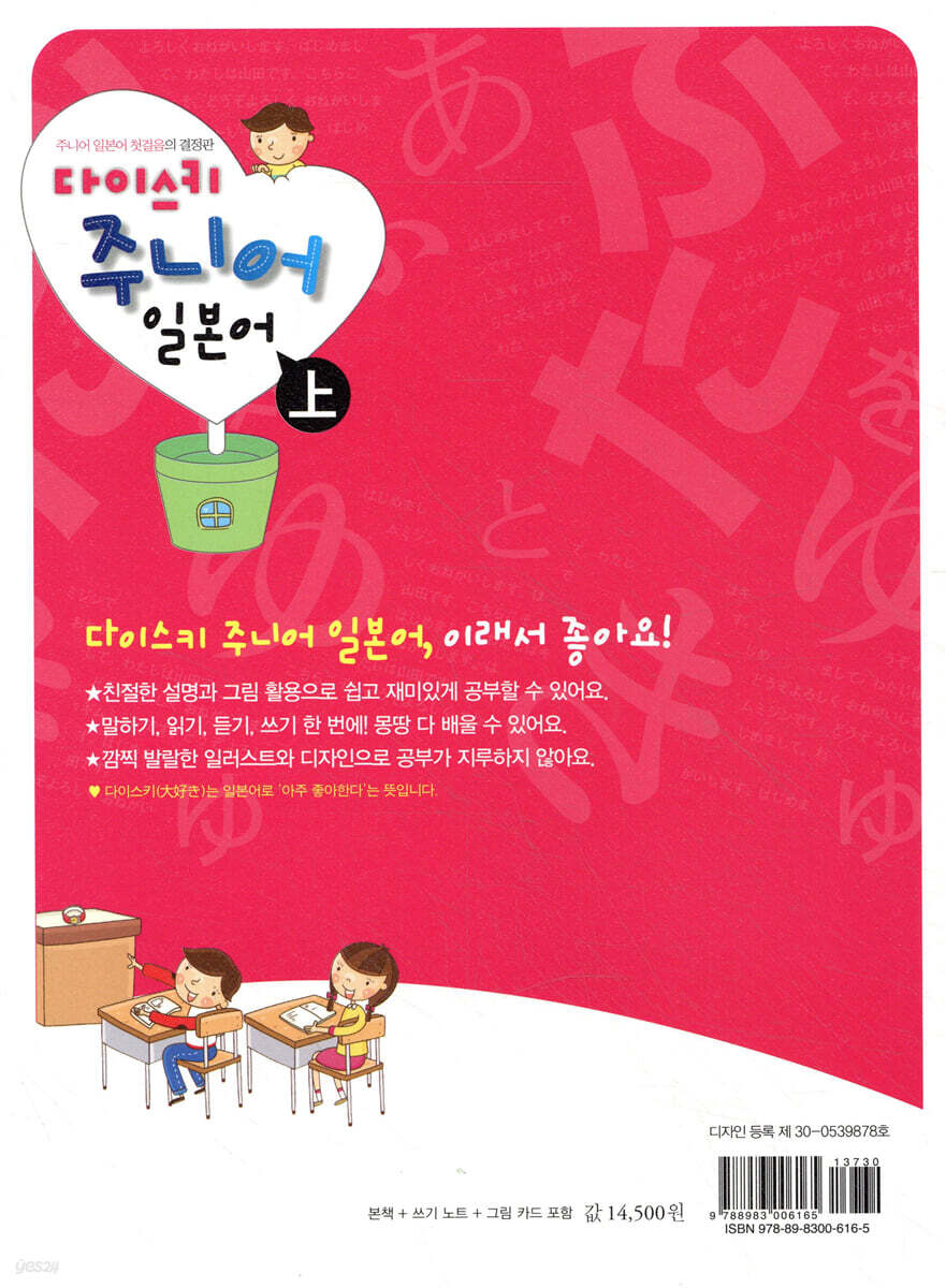 일본어를 처음 접하는 주니어들에게 일본어의 흥미를 일깨우고, 공부의 재미를 느끼게 해주는 완전 소중한 일본어 첫걸음 책, 전체 11과 구성, 다이스키 주니어 일본어가 좋은 이유 세 가지!! 첫째, 친절한 설명과 그림 활용으로 쉽고 재미있게 공부할 수 있어요. 둘째, 말하기, 읽기, 듣기, 쓰기 한 번에!! 몽땅 다 배울 수 있어요. 셋째, 깜찍 발랄한 일러스트와 디자인으로 공부가 지루하지 않아요. ♥http://www.dongyangtv.com에서 무료 인터넷 동영상 강좌도 서비스 중입니다.♥ 다이스키 주니어 일본어를 손에 잡은 이상, 일본어 공부에 있어서 중도포기란 있을 수 없다!!! 전체 11과 구성, 주니어뿐만이 아니라 일본어 왕초보를 위해, 눈높이를 맞춘 친절한 설명과 연상 작용을 이용한 그림 활용을 통해 기초 문법과 회화를 쉽고 재미있게 공부할 수 있도록 만들었습니다. 말하기, 읽기, 듣기, 쓰기를 한 번에 몽땅 다 익힐 수 있도록 알차게 구성하였습니다. 눈이 즐거운 깜찍 발랄한 일러스트와 디자인으로 공부의 지루함을 덜었습니다. 남기는 거 없이 맘껏 양껏 퍼다 드리는 대박 부록으로 일거양득하세요!!! -외워보자! : 주요 낱말들을 그림으로 쉽고 재미있게 외울 수 있습니다. -읽어보자! : 여러 주제의 회화들을 쉽고 짧게 구성하였습니다. -정리해보자! : 문형과 문법들을 알기 쉽게 설명하였습니다. -말해보자! : 문형과 문법을 말하기를 통해 응용하고 익힐 수 있습니다. -들어보자! : 듣고 푸는 문제를 통해 듣기 실력을 높일 수 있습니다. -확인하자! : 쓰기 문제를 풀어 보며 한 과를 정리, 복습할 수 있습니다. -잘했나요? : 학습에 대해 자기 스스로 평가해 보는 코너입니다. -알아보자!/놀아보자!/노래하자! : 게임과 노래 등을 통해 재미있게 공부할 수 있습니다. |