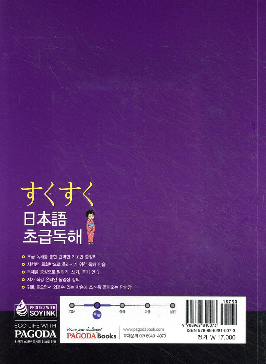 포인트 (ポイント) 각 과에서 학습해야 하는 문법의 목표를 한눈에 쏙 들어오게 정리하였습니다. 학습 후에는 제시된 학습 포인트를 스스로 확인하면서 복습 할 수 있습니다. 독해 지문 각 과에서 확인해야 할 학습 포인트를 이용한 실용적인 독해 지문을 통해 일본어의 기초를 탄탄히 할 수 있습니다. 대답해봅시다 (答えましょう) 방금 읽은 독해 지문을 잘 이해하였는지 간단한 내용 이해 OX 퀴즈입니다. 외워봅시다 (えましょう) 일본어 기초 단계에서 중급으로 도약하기 위해 꼭 필요한 중요한 문형과 문법사항을 예문과 더불어 쉽고 간결하게 정리하였습니다. * 예문에 대한 해석과 해설은 www.pagodabook.com에서 다운로드 받으세요. 연습해 봅시다 (練習して見ましょう) 각 과에서 배운 중요한 문형과 문법을 확실히 다지기 위한 다양한 연습문제를 풀도록 하였습니다. 연습문제를 통해 배운 문법과 문형에 대한 확실한 이해를 돕도록 하였습니다. 들어 봅시다 (聞いてみましょう) 각 과에서 배운 본문 내용을 MP3파일로 들으면서 그 과에서 가장 중요한 부분을 듣고 받아 적음으로써 듣기와 문법을 모두 학습할 수 있도록 하였습니다. 작문 (作文) 그 과에서 배운 문법과 문형을 통해 작문 연습을 할 수 있도록 하였습니다. 한자와 가타카나 (漢字 / カタカナ) 일본어 학습자들이 가장 어려워하는 부분 중 하나인 한자와 가타카나를 체계적으로 학습할 수 있도록 하였습니다. - 책의 구성 본서 / 단어장 / MP3파일 - 대상 독자 기초 일본어 코스를 끝내고 일본어 회화나 시험반 학습을 시작하려는 학습자 |
