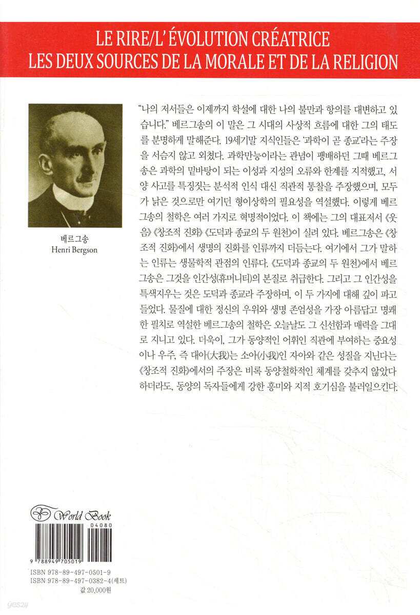 “‘생명의 약동’! 정말 매력적인 말이야. 베르그송은 어떤 뜻으로 이 말을 사용한 것일까. 인간은 어디서 왔는가? 인류의 뿌리는 무엇인가? 인류의 진화에 대해 사람들은 물음을 갖는다. ‘생명의 약동’은 베르그송이 생각한 진화론, 창조적 진화론을 말하는 거야.” 현대 프랑스철학의 상징 베르그송. 그는 세계철학사에 큰 발자국을 남긴 위대한 철학자이며, 제1차 세계대전 전후에 걸쳐 세계평화를 위해 외교관으로서 발 벗고 뛰어다닌 평화의 전도자였다. “나의 저서들은 이제까지 학설에 대한 나의 불만과 항의를 대변하고 있습니다.” 베르그송의 이 말은 그 시대의 사상적 조류에 대한 그의 태도를 분명하게 말해준다. 19세기말 석학들은 ‘과학이 곧 종교’라는 주장을 서슴지 않고 외쳤다. 과학만능이라는 관념이 팽배하던 그때 베르그송은 과학의 밑바탕이 되는 이성과 지성의 오류와 한계를 지적하였고, 서양 사고를 특징짓는 분석적 인식 대신에 직관적 통찰을 주장하였으며, 모두가 경시하던 형이상학의 필요성을 역설하였다. 이렇게 베르그송의 철학은 여러 가지로 혁명적이었다. 베르그송은 실재인식 그 자체가 가치론적 행위를 직접적으로 성립시킨다고 보았다. 존재?인식?행동의 이러한 삼위일체화는 베르그송철학의 완성인 동시에 고대존재론과 근대인식론을 극복하기 위한 시도였다. 그의 철학이 드러내는 세계상의 생생함과 다채로움은 오늘날에도 철학자들에게 깊은 공감을 얻고 있다. 이 책에는 베르그송 철학의 정수가 담긴 대표저서 『웃음』,『창조적 진화』,『도덕과 종교의 두 원천』이 실려 있다. 『웃음』 “웃음의 정체를 밝히려면 에누리 없이 150쪽의 논문이 필요하며, 더구나 그 논문은 아카데미의 문체가 아니라 화학의 문체로 쓰여야 한다.” 스탕달의 『라신과 셰익스피어』에서 ‘웃음’의 장에 적힌 말이다. 그로부터 약 70년 뒤인 1900년, 마치 그의 요청을 받아들이기라도 한 듯이 베르그송의 『웃음―우스움의 의미에 관한 시론』이 세상에 나타났다. 200쪽 정도 되는 소책자였다. 베르그송은 모든 희극적인 것을 파헤쳐, ‘생명적인 것에 덧붙여진 기계적인 것’이라는 중심사상을 찾아낸다. 그것이 희극적인 것이 되는 전제조건, 즉 그것을 바라보지만 감동을 느끼지 않는 사람의 마음을 주목하고, 거기서 나오는 웃음의 성격을 집단적?사회적 의미로 파악한다. 그리하여 웃음 또한 ‘사회생활을 방해하는 어떤 결점에 대한 징샙’의 기능을 가진다고 본다. 『웃음』은 금세 세상에 커다란 반향을 불러일으켜, ‘웃음’의 본격 연구의 출발점이 되었다. 기존의 웃음에 관한 이론을 절충하여 보완한 베르그송의 시각은, 인간 감정의 충실한 발현 중 하나인 웃음을 이해하는 데 큰 길잡이가 된다. 『창조적 진화』 베르그송은 『창조적 진화』에서, 인식론과 생명론이 하나가 된 진정한 진화론, 진정한 생명철학을 확립하려 하였다. 『창조적 진화』는 머리말과 4장으로 되어 있다. 제1장에서는 지금까지 과학자에 의하여 설명된 진화설을 비판한다. 과학적 진화는 크게 기계론과 목적론으로 나눌 수 있는데, 그 하나하나의 학설에 대하여 상세히 검토 비판하여 의론을 전개한다. 제2장에서는 적극적 자기논술에서 유명한 ‘생명의 약동(?lan vital)’의 생각이 발표되고 있다. 여기에서 아리스토텔레스 이래의 목적론적 생명관은 부정되고, 베르그송의 독창적 사상인 의식의 분열적 진화 이론이 설명된다. 제3장에서는 문제를 보다 철학적으로 심화하고, 특히 물질성이란 어떻게 하여 성립하는가벧 풀이한다. 이것(어떻게 정신 또는 의식이 감각적으로 물질화되는가?)은 베르그송 철학에서 최대 난문의 하나인데, 그는 그 문제를 스스로 취급하여 적어도 그의 입장에서는 어떻게 이해되는가벧 명쾌하게 논하고 있다. 이와 관련하여 또 하나, 이른바 질서란 무엇을 의미하는지를 논한 2장의 ‘무질서론’은 베르그송 철학의 근본을 건드리는 중요한 문장이다. 제4장은 문제를 더욱 일반 철학으로 넓혀, 과거 철학의 오류를 지적하고 진정한 진화론이 어떤 것인가벧 결론짓는다. 베르그송은 지적 사유 메커니즘의 정체를 폭로하여 그 지적 메커니즘만으로 실재를 파악할 수 없음을 이론적으로 논함과 동시에, 철학사적으로도 지금까지의 철학을 실재파악에 오류를 범하고 있음을 역사적으로 말하고 있다. 이리하여 제4장은 베르그송 철학의 이론적 및 철학사적 의의를 전체적으로 아는 데 매우 중요한 문헌이다. 『도덕과 종교의 두 원천』 『도덕과 종교의 두 원천』은 『창조적 진화』보다 25년 뒤에 간행되었으며 그 테마의 연장, 또 그때 제기했던 문제에 대한 해답으로서 쓰였다. 이 책은 4장으로 이루어졌다. 제1장 도덕적 의무, 제2장 정적(靜的) 종교, 제3장 동적(動的) 종교, 제4장 기계학과 신비학이다. 베르그송은『창조적 진화』에서 생명의 진화를 인류까지 더듬었다. 그러나 그 인류는 말하자면 생물학적 인류다. 『도덕과 종교의 두 원천』에서 베르그송은 인류를 인간성(휴머니티)으로서 다루었다. 그리고 그 인간성을 특색지우는 것은 도덕과 종교라 하고, 이 두 가지에 대
