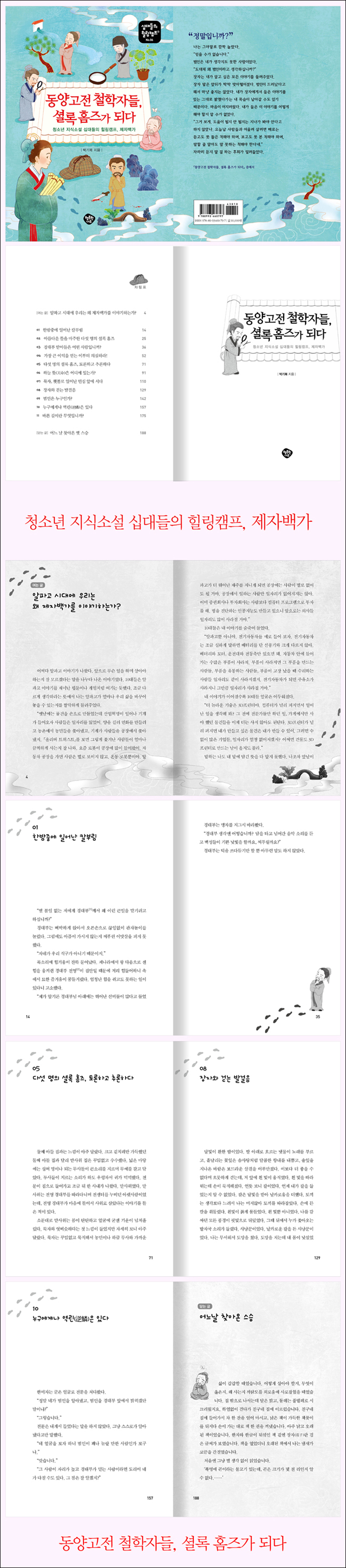 01. 한밤중에 일어난 칼부림 02. 아름다운 뜰을 마주한 다섯 명의 셜록 홈즈 03. 경대부 맏아들은 어떤 사람입니까? 04. 가장 큰 이익을 얻는 이부터 의심하라! 05. 다섯 명의 셜록 홈즈, 토론하고 추론하다 06. 하늘 뜻(天命)은 어디에 있는가? 07. 묵자, 횃불로 일어난 민심 앞에 서다 08. 장자와 걷는 발걸음 09. 범인은 누구인가? 10. 누구에게나 역린(逆鱗)은 있다 11. 바른 길이란 무엇입니까? [닫는 글] 어느 날 찾아온 옛 스승 |