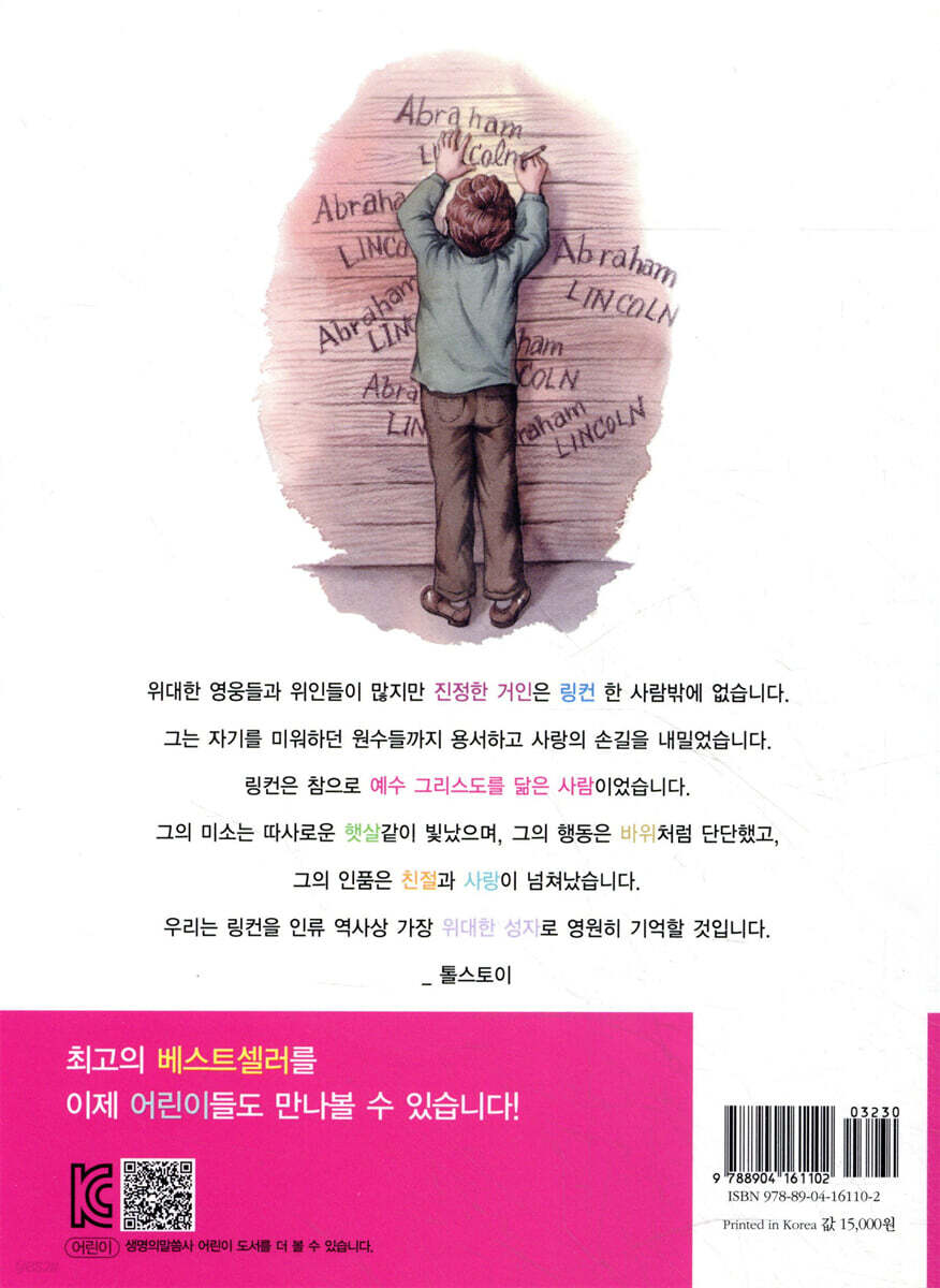 기독교 어린이 부문 수퍼 베스트셀러, ‘어린이 백악관을 기도실로 만든 대통령’이 멋진 새 옷으로 갈아입었습니다. 페이지마다 일러스트로 꾸며 보는 재미까지 더했습니다. 동화처럼 재미있는 이야기 속에 담긴 링컨의 모습을 통해, 성경을 사랑하고 하나님을 사랑했던 대통령, 링컨을 만나보세요. 그리고 링컨처럼 하나님이 기뻐하시는 꿈을 키워보세요. "통나무집에서 태어난 아이, 9개월밖에 학교에 다니지 못한 아이, 7살 때부터 힘든 집안일을 도와야 했던 아이가 있었습니다. 아이는 돌아가신 엄마가 물려주신 성경책을 사랑했습니다. 바쁘게 일하면서도 손에서 책을 놓지 않았습니다. 모든 사람에게 친절하고 정직했습니다. 그리고 미국의 16대 대통령이 되었습니다.“ 아이들의 훌륭한 롤모델(role-model) 링컨의 삶과 신앙! 이 책은 미국뿐만 아니라 세계적으로 사랑받는 대통령, 링컨 대통령 이야기입니다. 2003년 1월 출간 이후 폭발적인 인기와 관심을 끌었던 『백악관을 기도실로 만든 대통령 링컨』을 초등학생 아이들이 재미있고 쉽게 읽을 수 있도록 구성한 책으로 줄곧 어린이 부문 1위를 차지해왔습니다. 본서는 기존의 링컨에 대한 도서와는 달리 그의 신앙에 초점을 맞춘 책이기도 합니다. 성경말씀대로 살아가려 노력했으며, 어떤 상황에서건 하나님 앞에 모든 것을 내려놓고 기도했던 그의 굳건한 믿음뿐만 아니라 어릴 때부터 다져진 독서습관, 다른 사람을 존중하고 사랑하는 자세, 온유한 성품 등을 배울 수 있어 아이들이 전인격적으로 성장할 수 있도록 돕습니다. 또한 링컨이 사랑했던 성경구절, 링컨에 관한 재미있는 일화, 링컨의 편지글, 컬러화보, 생생한 일러스트로 읽는 재미를 더했습니다. 아이들이 링컨이라는 인물을 더 자세히, 그리고 흥미진진하게 접할 수 있는 새로운 기회가 될 것입니다. |