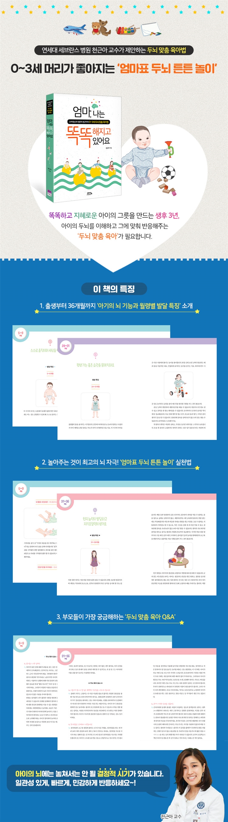 우리 아이는 도대체 왜 이럴까요? 아이의 기질, 뇌부터 이해해야 한다 아이는 기질과 양육의 총합이다 프로 엄마가 되기 위한 필수 덕목 좋은 부모가 되기 위한 밑바탕 아이는 부모 하기 나름일까요? 뇌 과학에서 말하는 참다운 부모 역할 아이의 평생 행복을 좌우하는 두뇌 육아 뇌, 작지만 강한 사령탑 똑똑한 두뇌의 기반을 다지는 생후 3년 지구상에서 가장 강력한 학습자 뇌도 훈련이 필요하다 머리가 좋다는 것 아이의 마음이 편해야 두뇌도 발달한다 환경은 타고난 유전자도 바꿀 수 있다 뇌는 ‘적기 교육’이 필요하다 내 아이를 결정하는 3년, 그 첫걸음 일관성 있게, 빠르게, 민감하게 반응하라! 뇌 기능을 발달시키는 시기 아기가 뭘 안다고? 어린 시절 경험이 아이의 능력을 결정한다 갓난아기를 위협하는 산후 우울증 놀고, 놀고, 또 놀아주세요 우리 아이를 인재로 만드는 놀이 엄마는 최고의 언어 선생님 Part 2. 지금도 아이는 자라고 있습니다 0~5개월 | 감각이 눈을 뜹니다 + 발달 특징 0~1개월 - 반사 행동을 보여요 1~2개월 - 외부 자극에 반응해요 2~3개월 소리에 반응하기 시작해요 3 ~4개월 - 서서히 밤낮을 구분해요 4 ~5개월 - 목을 완전히 가눠요 + 엄마표 두뇌 튼튼 놀이 언어가 쑥쑥 - 끊임없이 말 걸기 | 목에 힘이 생겨요 - 엎드려 얼굴 들기 | 내 몸을 알아요 - 잡았다 놓았다 쥐었다 폈다 | 정서와 사회성이 자라요 - 눈 맞추고 얼러주기 | 운동 신경과 시각을 자극해요 - 이쪽저쪽 뒤집기+ 두뇌 맞춤 육아 Q&A 자꾸 안아줘 버릇하면 손 탈까 걱정돼요 | 잠투정이 너무 심해요 | 산후 우울증 어쩌죠? 5~9개월 - 스스로 움직이며 탐험을 시작합니다 + 발달 특징 5~6개월 - 힘을 조금씩 쓸 수 있어요 6~7개월 - 신기한 것이 많아져요 7~8개월 - 낯가림이 심해져요 8~9개월 - 탐색 활동이 활발해요 + 엄마표 두뇌 튼튼 놀이 기억력을 높여요 - 엄마 없다 까꿍 놀이 | 내 몸을 내 맘대로 - 하나둘 하나둘 기저귀 체조 | 전정기관을 자극해요 - 신나는 이불 그네 | 스스로 조절해요 - 빨대로 홀짝 놀이 | 협응력을 높여요 - 하나 둘 셋 콩알 집기+ 두뇌 맞춤 육아 Q&A 낯가림이 너무 심해요 | 책은 언제부터 보여줄까요? | 7개월 된 아기가 소리에 너무 예민해요 9~12개월 - 재미있는 게 너무 많아요 + 발달 특징 9~10개월 - 분리 불안이 시작됩니다 10~12개월 - 여기저기 돌아다닐 수 있어요 + 엄마표 두뇌 튼튼 놀이 협응이 척척 - 영차 영차 기어요 | 전전두엽이 활성화됩니다 | 숟가락으로 먹어요 | 언어가 팍팍 늘어요 - 엄마 말로 바꿔주기 | 작업기억력이 쑥쑥 - 장난감 찾기 놀이 + 두뇌 맞춤 육아 Q&A 직장 때문에 아이를 세 살까지 도맡아 키울 수 없어요 | 클래식을 들려주면 아이의 머리가 좋아지나요? | 아이가 밤에 잠을 안 자려고 해요 12~18개월 - 새로운 세상을 발견합니다 + 발달 특징 12~15개월 - 단어를 말하기 시작해요 15~18개월 - 자유롭게 걸어요 + 엄마표 두뇌 튼튼 놀이 잘 걸을 수 있어요 - 선 따라 걷기 | 균형감이 자라요 - 그네 또는 미끄럼틀 타기 | 손에 힘이 생겨요 - 신나는 종이 찢기 | 사회성이 발달하고 있어요 - 상상 놀이 | 감각을 깨워요 - 물놀이 | 상호작용하며 배워요 - 너 한 번 나 한 번, 교대놀이 + 두뇌 맞춤 육아 Q&A 아이가 진득하게 놀지를 못해요 | 배변 훈련은 언제부터 시켜야 하나요? | 또래보다 말이 느린 것 같아요 | 아이에게 텔레비전을 보여줘도 되나요? | 공갈 젖꼭지는 언제까지 물려도 될까요? 월령별 체크리스트 우리 아이 잘 크고 있나요? 18~24개월 - 자율성이 커지고 말문이 트여요 + 발달 특징 다양한 정서와 자아 개념이 생겨요 | 미운 두 살 똥고집, 따뜻한 훈육으로 보듬어주세요 | 상황에 따라 훈육 방법은 조금씩 달라져야 합니다 | 기저귀 떼기, 서두르지 않아야 성공해요 | 안정된 애착을 형성한 아이가 말도 빨리 배워요 + 엄마표 두뇌 튼튼 놀이 나도 엄마처럼 할 수 있어요 - 인형 놀이 | 춤추며 신체 어휘를 배워요 - 머리 어깨 무릎 | 장난감계의 스테디셀러 - 블록 놀이 | 그림책보다 더 재밌어요 - 가족 앨범 구경 | 전신을 움직이며 수세기를 배워요 - 물병 볼링 | 안에 뭐가 들었을까 맞혀봐요 - 가방 뒤지기 | 주거니 받거니 놀아요 - 마주 앉아 공 굴리기 + 두뇌 맞춤 육아 Q&A 아들이 자꾸만 성기를 만지작거려요 | 담요에 심하게 집착해요 | 엄마를 자꾸 깨물어요 24~31개월 - 평생 가는 좋은 습관을 몸에 익혀요 + 발달 특징 운동 능력과 언어 능력이 쑥쑥 발달해요 | 아이의 평생 건강과 두뇌 발달, 좋은 식습관에 달려 있습니다 | 두뇌 보약은 책이 아니라 잠입니다 | 스마트폰은 아이 뇌를 망치는 주범입니다 + 엄마표 두뇌 튼튼 놀이 더 정교한 상상 놀이를 해요 - 소꿉놀이 | 손으로 조물조물, 창의력은 쑥쑥 - 점토 놀이 | 간단하면서도 재미있어요 - 집게로 물건 집기 | 쌩쌩 기운이 넘치는 아이에게 좋아요 - 앞구르기 | 지금 생각하는 게 뭐게? - 설명 듣고 알아맞히기 | 비교하고 분류하며 집중력까지 키워요 - 짝 찾기 놀이 + 두뇌 맞춤 육아 Q&A 또래와 놀 때 양보를 안 하려고 해요 | 똑같은 그림책을 반복해서 읽어달라고 해요 | ‘닌텐도 위’ 같은 게임은 운동 효과가 있어 아이에게 좋지 않나요? 31~36개월 - 자기