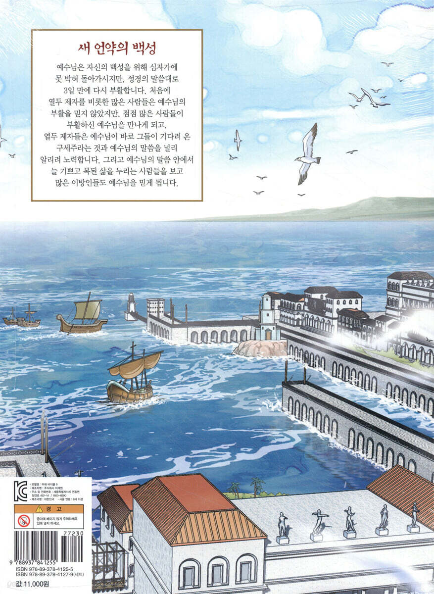 새로운 타입의 성경 만화 『파워 바이블』, 영원한 생명에 대한 예수님의 약속인 ‘신약’이 계속됩니다. 최고의 베스트셀러 성경을 어린이들이 읽고 보기 쉽게 만화로 구성! 기독교인이 아니어도 감동과 교훈을 느낄 수 있는 지혜의 보고! 성경은 한 종교의 성서이지만 그 속에 담긴 삶의 지혜들은 꼭 기독교인들에게 국한된 것이 아니라 현대를 살고 있는 누구에게나 필요한 지혜와 교양의 요람입니다. 인류 역사상 최고의 베스트셀러이자 지혜의 보고인 성경은 분명 이미 한 종교의 경전을 넘어서 선과 악, 삶의 진리, 인간관계, 경제, 경영 등 인간사의 모범적인 전형들이 총체적으로 담겨 있는 어린이들의 필독서이자 교양서입니다. 성경은 하나님의 계시를 통해 하나님의 말씀을 인간이 기록한 책으로 여겨지는데, 구약은 하나님과 인간의 옛 언약, 신약은 새로운 언약을 뜻하며 예수님의 탄생을 기점으로 나뉩니다. 그 중에서 신약은 예수님의 생애와 행적을 기록한 책에 그치지 않 고, 우리 생활에도 지대한 영향을 끼치고 있는 서구 사회의 근본 사상과 문화의 토대가 되는 책으로서 그 중요성이 부각되고 있습니다. 『파워 바이블』은 『코믹 메이플스토리』 작가인 만화가 김신중의 생동감 넘치는 그림체로 엄숙하게만 느껴졌던 성경을 쉽고 친근하게 느끼게 해줍니다. 성경의 내용은 충실히 담되, 그 접근 방법은 아이들의 눈높이에 맞게 구성한 새로운 타입의 아이세움 『파워 바이블』은 신화 못지않게 재미있고, 감동적으로 어린이들의 마음에 남을 것을 확신합니다. 특히 복장 하나하나를 꼼꼼하게 재현하며, 당시의 시대 배경을 그림으로 잘 표현하여 기독교 관계자들도 감탄을 금치 못하였습니다. 지혜와 진리의 보고서인 성경에서 삶의 지혜를! 『지혜를 주는 성경이야기, 파워 바이블』은... 성경 속의 많은 교훈과 진리들을 쉽고 재미있게 풀었습니다. 성경은 아이들에겐 너무나 방대하고 심오한 내용들을 담고 있습니다. 『파워 바이블』은 어린이들이 선뜻 다가서기 힘든 두꺼운 성경의 많은 내용들을 만화로 풀어내어 아이들이 친근함을 가지고 성경에 담긴 수많은 지혜들을 접할 수 있도록 노력한 책입니다. 성경의 내용을 온전히 담고 있지만 성서가 주는 엄숙함 대신 아이들이 좋아하는 귀여운 캐릭터로 인물들이 승화되고, 그들이 구현하는 지혜와 재치, 발랄함을 통해 재미와 감동을 이끌어내어 아이들은 성경 속의 많은 교훈과 진리들을 부담 없이 즐기면서 체험할 수 있습니다. 아이들의 인성발달에 긍정적으로 작용합니다. 최근, 부드럽고 예쁘거나 의로운 일을 많이 보고 자란 아이들이 그렇지 못한 아이들보다 더 온화하고 밝은 성품을 가질 가능성이 높다는 연구발표가 있었습니다. 세상의 모든 양서가 그렇듯이 성경 또한 권선징악의 내용을 담고 있습니다. 『파워 바이블』은 아벨을 죽인 가인이 하나님으로부터 벌을 받고, 의로운 노아는 방주를 만들어 살아남은 일과 같은 많은 권선징악의 내용을 강조하여 아이들에게 명확한 선과 악의 가치판단 기준을 제시합니다. 나무가 아닌 숲을 볼 수 있도록 도와줍니다. 성경은 너무나 많은 인물과 이야기를 담고 있기 때문에 아이들은 대부분 성경의 유명한 단편적인 부분만을 접하고 있습니다. 『파워 바이블』은 천지창조에서부터 요한계시록까지의 이야기를 순차적으로 다룰 예정입니다. 그 과정 속에서 아이들이 각각의 에피소드라는 나무를 보는 것이 아니라 성경이라는 거대한 숲 속에서 각 나무들이 전하는 지혜를 거시적인 관점으로 파악할 수 있도록 기획되었습니다. 서구사회의 문화를 이해하는 밑바탕이 됩니다. 서양의 역사는 기독교의 흥망과 함께 한다고 해도 과언이 아닙니다. 중세 1000년은 기독교 1000년으로 불릴 만큼 문학, 과학, 건축, 미술, 음악 등 많은 분야에서 기독교가 절대적인 영향력을 행사하였습니다. 때문에 현재 선진국으로 분류되는 많은 서구국가들의 밑바탕에는 성경을 기반으로 하는 기독교 문화가 깊숙이 자리 잡고 있습니다. 따라서 성경을 이해하는 것은 서구사회의 많은 문화에 관한 가장 기초적인 기본정신을 이해하는 것과 다를 바 없습니다. 『파워 바이블』은 이를 도울 탄탄한 초석이 될 것입니다. 베드로가 이르되 은과 금은 내게 없거니와 내게 있는 이것을 제게 주노니, 나사렛 예수의 이름으로 일어나 걸으라 (사도행전 3장 6절) 『지혜를 주는 성경 이야기, 파워 바이블 9-새 언약의 백성』은 성경의 말씀처럼 십자가에 못 박히신 예수님과 그의 부활, 그리고 예수님을 믿고 그리스도인이 되어 가는 이스라엘 민족뿐만 아니라 많은 이민족들의 이야기를 담고 있습니다. 예수님은 자신의 백성을 위해 십자가? 못 박혀 돌아가시지만, 성경의 말씀대로 3일 만에 다시 부활합니다. 처음에 열두 제자를 비롯한 많은 사람들은 예수님의 부활을 믿지 않았지만, 점점 많은 사람들이 부활하신 예수님을 만나게 되고, 열두 제자들은 예수님이 바로 그들이 기다려 온 구세주라는 것과 예수님의 말씀을 널리 알리려 노력합니다. 그리고 예수님의 말씀 안에서 늘 기쁘고 복된 삶을 누리는 사람들을 보고, 유대