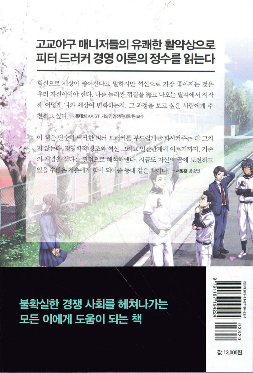 고등학교에 다니는 유메는 친구인 마미의 권유로 야구부 매니저가 되기로 결심한다. 유메와 마미는 피터 드러커의 경영서 『이노베이션과 기업가정신』을 읽으면서, 경쟁하지 않고도 이길 수 있는 ‘완전히 새로운’ 야구부를 만들기로 한다. 야구부 매니저와 선수들은 드러커의 가르침을 바탕으로 힘을 합쳐 이노베이션을 일으켜나가는데……. 모시도라(もしドラ)∥만약’이란 뜻의 일본어 모시(もし)와 드러커의 일본식 발음 중 첫 두 글자 도라(ドラ)를 합쳐 만든 조어. 『만약 고교야구 여자 매니저가 피터 드러커를 읽는다면: 매니지먼트 편』을 가리킨다. 모시이노(もしイノ)∥‘만약’이란 뜻의 일본어 모시(もし)와 이노베이션의 첫 두 글자 이노(イノ)를 합쳐 만든 조어. 『만약 고교야구 여자 매니저가 피터 드러커를 읽는다면: 이노베이션과 기업가정신 편』을 가리킨다. 변화는 새로운 것을 만들어낼 수 있는 기회이다 피터 드러커의 ‘매니지먼트’ 이론을 다룬 1편에 이어 6년 만에 나온 속편인 이 책은 ‘이노베이션’과 ‘기업가정신’이라는 더욱 시의적절한 주제를 다룬다. 아사가와 고교 야구부 매니저들은 피터 드러커의 『이노베이션과 기업가정신』을 참고해, 오랫동안 휴부 상태였던 야구부를 재건하고 꿈의 무대인 고시엔 대회에 진출한다는 원대한 목표를 세운다. 물론 상황은 녹록지 않다. 25년간이나 활동하지 않았던 야구부라서 그라운드는 잡초가 무성한 채로 방치되어 있다. 부원으로 소속된 야구 선수는 아직 한 명도 없고, 반면에 매니저만 다섯 명이나 모였다. 게다가 다섯 명의 매니저 가운데 야구에 관해 제대로 아는 사람은 한 명도 없다. 문화와 전통, 실력조차 없는 야구부가 고시엔 대회에 진출할 확률은 제로에 가까웠다. 그런데 불가능해 보일 정도로 엉뚱한 그들의 목표는 아이러니하게도 이노베이션의 기회와 연결된다. 아사가와 고교 야구부 매니저들은 “기업가는 이미 하고 있는 일을 더 훌륭히 하기보다는, 완전히 새로운 일을 하는 데서 가치를 찾아낸다”라는 피터 드러커의 정의에 착안한다. 전통이 없는 야구부란 어떻게 보면 남들이 생각지 못한 방식으로 신사업에 뛰어드는 벤처기업과도 같았다. 드러커의 이론에서 힌트를 얻은 매니저들은 고교 야구계 최초로 선수가 아니라 매니저가 주역이 된 야구부, 야구를 하기 위한 조직이 아니라 매니지먼트를 배우기 위한 조직을 만들기로 결심한다. 피터 드러커는 ‘기업가란 질서를 파괴하고 해체하는 사람’이라고 했다. 또한 경제학자 슘페터에 따르면 기업가의 책무는 ‘창조적 파괴’다. 그 말 그대로, 아사가와 고교 야구부 매니저들의 당돌한 반란은 고교야구 100년의 역사와 전통을 ‘창조적’으로 ‘파괴’하는 데서 시작된 셈이다. 드러커의 기업가정신으로 무장한 아사가와 고교 야구부 매니저들은 이후 새로운 이노베이션에 끊임없이 도전해나간다. 불확실한 경쟁 사회를 헤쳐나가는 현대인의 필독서 이 책은 피터 드러커의 저작인 『이노베이션과 기업가정신』의 내용을 좀 더 쉽게 파악할 수 있도록 풀어 썼다. 아사가와 고등학교 야구부를 둘러싸고 펼쳐지는 이야기의 흐름에 따라 『이노베이션과 기업가정신』의 문구를 적소에 인용하며, 어려운 부분은 등장인물이 직접 나서서 설명해주기 때문에 드러커 해설서 겸 입문서로도 손색이 없다. 사실 드러커의 아이디어는 현실 사회 곳곳에 적용 가능하다. 심지어 기업이나 경영과 무관해 보이는 곳에도 수많은 이노베이션의 기회가 널려 있다. 극심한 경쟁 사회인 현대를 살아가는 사람이라면 누구나 한 번쯤은 반드시 이노베이션이라는 문제와 마주해야 한다. 단지 그 기회를 인지하는 사람과 그렇지 못한 사람이 있을 뿐이다. 그런 의미에서 『만약 고교야구 여자 매니저가 피터 드러커를 읽는다면: 이노베이션과 기업가정신 편』은 일선 경영자와 기업가는 물론, 지금도 자신의 꿈을 이루기 위해 한 걸음씩 나아가는 모든 이에게 반드시 필요한 책이다. |