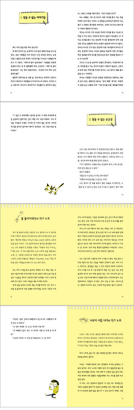 책을 읽다가 마음에 드는 구절을 수첩에 옮겨 적어 본 적이 있는가? 감동적으로 본 영화의 티켓을 여전히 간직하고 있는가? 순간적으로 좋은 아이디어가 떠올라 메모한 적이 있는가? 새해 계획을 세워 놓고 책상 앞에 붙여 놓은 적이 있는가? 그렇다면 작가 노트를 만들고 쓰기 시작하는 게 낯설지 않을 것이다. 내 마음에 드는 노트를 골라 취향대로 꾸미고, 그 안에 이 모든 것들을 기록하기 시작하면 된다. 글이나 그림으로 기록할 수도 있고, 추억이 담긴 사진이나 티켓, 편지를 붙여 두는 스크랩북으로 써도 좋다. 그리고 글을 쓸 때마다 작가 노트를 다시 들춰 보면서, 필요한 글감이나 영감을 얻는 것이다. 작가 노트는 우리를 스쳐 가는 수많은 감정과 이미지들이 바쁜 일상에 매몰되는 것을 막아 주고, 생각의 씨앗이 싹을 틔울 때까지 안전하게 보관해 주는 부화기 노릇을 한다. 물론 아무 글이나 다 모아 놓아서는 안 된다. 나를 감동시킨 것, 호기심을 유발시키는 것, 계속해서 머릿속을 떠나지 않는 생각, 귀를 솔깃하게 만드는 기발한 대화나 이야기, 나 자신을 잘 드러내는 이야기 등을 ‘좋다’, ‘훌륭하다’라는 일반적인 말로 쓰지 않고 구체적이고, 솔직하게 쓰는 것이다. 다른 작가들이 작가 노트를 어떻게 쓰는지, 작품에 어떻게 사용하는지를 읽다 보면, 작가처럼 글을 쓰는 것의 시작이 사실은 글을 통해 자기 자신을 먼저 찾아가는 일임을 깨닫게 된다. 독자들은 이 책을 통해 나만의 작가 노트를 쓰기 시작함으로써 작가가 되는 길, 자기 자신을 찾는 길로 나아가는 첫발을 내딛게 될 것이다. ▶ 주요 내용 - ‘작가 노트’를 쓰면 나도 작가! 작가가 되는 정해진 방법은 없지만, 진짜 작가들이 적극 추천하는 방법이 있다. 바로 ‘작가 노트’를 쓰는 것이다. 일상에서 발견하는 기쁨, 깨달음, 아이디어, 마음 속의 이미지 등을 언제가 필요할 때까지 잘 보관해 둘 수 있는 장소가 바로 작가 노트이며, 언제, 어디서든 작가가 될 수 있도록 해 주는 것도 바로 작가 노트이다. 작가가 되려면 우선 자신이 어떤 이야기를 좋아하고, 어떤 이야기에 감동을 받고, 어떤 이야기에 흥미를 느끼는지 알아야 한다. 그리고 자신이 붙잡은 그 이야기들을 작가 노트에 적으면 된다. 다른 사람들의 이야기를 귀 기울여 잘 들으면, 나중에 작품에 활용할 수 있는 대화들을 건질 수 있다. 또 작가 노트에는 목록을 만들어 적을 수도 있고, 여러 가지 스크랩북으로 활용할 수도 있고, 추억을 적어 놓을 수도 있다. 작가 노트는 나만의 것이기 때문에 용기를 갖고 솔직하게 쓰는 게 좋다. 또 글쓰기를 연습한 다른 작가들의 좋은 글들로 자신의 글을 에워쌀 수 있도록, 다른 작품에서 본 좋은 글들을 적어 두고 음미할 수도 있다. 그리고 필요할 때 그 동안 써 놓은 작가 노트를 다시 읽으며, 현재 쓰는 글에 도움이 될 만한 메모가 없는지 찾아본다. ▶ 책 속으로 이 책에서는 작가인 내가 글을 쓸 때 활용하는 가장 중요한 방법인 작가 노트에 대해 알려 주고자 한다. 작가 노트는 글을 쓰는 데 있어서 최선의 방법 중 하나이다. 도대체 작가 노트란 무엇인가? 먼저 작가 노트가 아닌 것부터 생각해 보자. 작가 노트는 일기가 아니다. ‘오늘은 비가 왔다. 팜파넬라라는 이름의 보조 선생님이 왔다. 아주 좋은 분 같았다. 우리는 점심 시간 바로 전에 체육 수업을 했다.’ 또 작가 노트는 책의 내용을 요약하거나 등장인물에게 편지를 쓰는 독서 기록장도 아니다. 아마 작가 노트는 여러분이 지금까지 해 본 어떤 기록과도 다를 것이다. 작가는 평범한 사람이다. 즐겨 부르는 노래도 있고, 좋아하는 영화나 텔레비전 프로그램도 있다. 작가들에게도 악마 같은 누나가 있다(때로는 착한 누나도 있지만). 성적이 좋을 때도 있고, 그저 그럴 때도 있다. 집에 페인트칠도 하고, 휴가 때는 쉬기도 한다. 딱 한 가지 중요한 차이점만 뺀다면 작가는 다른 사람들과 같다. 작가가 아닌 보통 사람들도 일상적인 감정을 느낀다. 하늘을 올려다보기도 하고 주변의 냄새도 맡는다. 하지만 그 이상은 아니다. 모든 생각과 감정, 느낌, 의견은 그들이 들이마시고 내뱉는 공기처럼 그냥 스쳐 지나갈 뿐이다. 그러나 작가는 그렇지 않다. 작가는 반응을 한다. 그래서 그 반응을 기록해 두는 곳이 필요하다. 그런 것을 적어 두는 곳이 바로 작가 노트다. 작가 노트는 여러분이 왜 화가 났는지, 슬픈지 또는 기쁜지, 혹은 왜 놀랐는지를 적는 곳이다. 새로이 알게 된 것과 잊고 싶지 않은 것을 적는 곳이다. 할머니가 세상을 떠나는 마지막 순간에 작별 인사로 귀에 속삭였던 말을 또박또박 적어 두는 곳이다. 작가 노트는 여러분이 작가처럼 살 수 있는 장소를 선물한다. 학교에서 작문하는 시간뿐만 아니라 언제, 어디서든 작가가 될 수 있게 해 준다. ▶ 옮긴이의 말 이 책은 어떻게 하면 작가처럼 글을 쓸 수 있는지, 그 중요한 첫 단계를 알려 준다. 마당에 생긴 웅덩이에 모여든 예기치 않은 생물들처럼, 작가 노트에 담기는 생활의 편린(片鱗)들이 글을 쓰는 데 상상하지 못했던 기쁨과 유익을 준다는 것을 말해 주고 있다. 그리고 작가는 타고나는 것이 아니라, 좋은 글을 