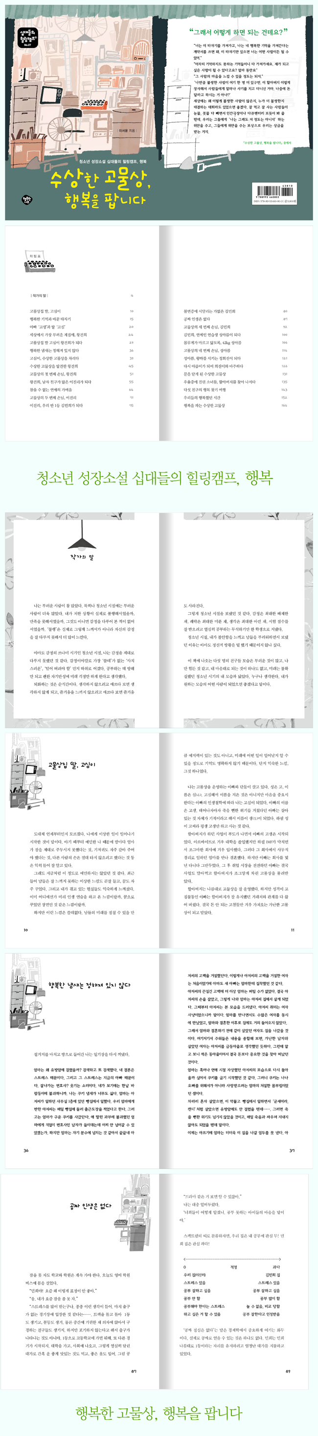 1. 고물상집 딸, 고심이 2. 행복한 기억과 바꾼 타자기 3. 아빠 ‘고생’과 딸 ‘고심’ 4. 세상에서 가장 부러운 계집애, 왕건희 5. 고물상집 딸 고심이 왕건희가 되다 6. 행복한 냄새는 정해져 있지 않다 7. 고심이, 수상한 고물상을 차리다 8. 수상한 고물상을 발견한 왕건희 9. 고물상의 첫 번째 손님, 왕건희 10. 왕건희, 남자 친구가 많은 이진리가 되다 11. 참을 수 없는 연애의 가벼움 12. 고물상의 두 번째 손님, 이진리 13. 이진리, 우리 반 1등 김민희가 되다 14. 불면증에 시달리는 가엾은 김민희 15. 공짜 인생은 없다 16. 고물상의 세 번째 손님, 김민희 17. 김민희, 연예인 연습생 성아름이 되다 18. 몸무게가 마르고 닳도록, 42kg 성아름 19. 고물상의 네 번째 손님, 성아름 20. 성아름, 왕따를 시키는 정희진이 되다 21. 다시 아름이가 되어 희진이와 마주하다 22. 문을 닫게 된 수상한 고물상 23. 우울증에 걸린 소녀들, 할아버지를 찾아 나서다 24. 다섯 친구의 행복 찾기 여행 25. 우리들의 행복했던 시간 26. 행복을 파는 수상한 고물상 |