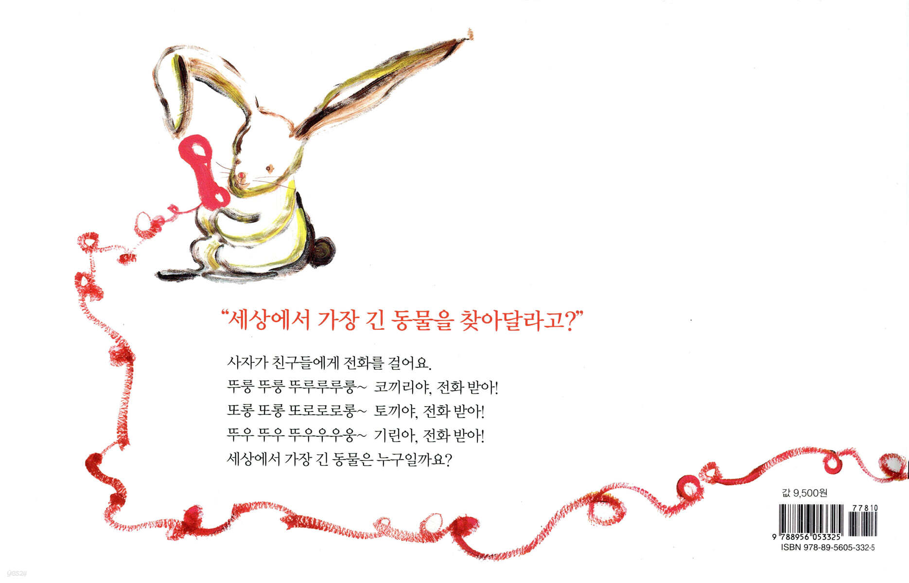 “따르르르릉!” 표지를 넘기자마자 전화벨이 울린다. 누구에게 온 전화일까? 궁금해질 무렵 다음 페이지를 넘기면 “사자야, 전화 왔어!”라는 제목과 함께 속표지에 주인공 사자가 등장한다. 본문이 시작되기 전부터 유기적으로 연결되어 있는 형식과 내용이 극적인 효과를 만들어 내면서 아이들의 호기심을 자극한다. 도대체 사자에게 어떤 전화가 걸려온 것일까? “세상에서 가장 긴 동물을 찾아달라고?” 사자는 몸이 긴 동물들에게 차례차례 전화를 걸기 시작한다. 세상에서 가장 긴 동물은 누구일까? 동물들은 어떻게 전화를 받을까? 코끼리 전화벨은 ‘뚜룽 뚜룽 뚜루루루룽’ 토끼 전화벨은 ‘또롱 또롱 또로로로롱’ 원숭이 전화벨은 ‘까릉 까릉 까르르르릉’ 기린 전화벨은 ‘뚜웅 뚜웅 뚜우우우웅’ 동물들의 이미지를 잘 살린 전화벨 소리가 재미있다. 각 동물들의 특징이 ‘동물들은 무얼 하며 놀까?’ 하는 창의적인 상상력과 어우러져 잘 나타난다. 코가 긴 코끼리들은 코로 물총 놀이를 하고, 귀가 긴 토끼들은 동그랗게 만든 귀 사이로 당근을 던지며 논다. 팔이 긴 원숭이들은 긴 팔로 줄넘기를 하고, 목이 긴 기린들은 목으로 꽈배기를 만들며 논다. 아이들이 자연스럽게 동물들의 특징을 배울 수 있다. 과연 이 동물들 가운데 세상에서 가장 긴 동물이 있을까? ‘꽃그림 작가’로 잘 알려진 아티스트 백은하가 단순하면서도 힘 있는 붓터치로 동물들의 모습을 생생하게 그려내었다. |