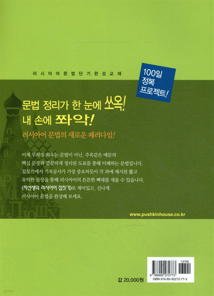 기초 문법에서 고급 문법까지 단 한 권으로 단기간에 문법을 정복할 수 있는 교재이다. 무작정 외우는 문법이 아닌, 주옥 같은 핵심 문장과 깔끔하게 정리된 도표를 통해 이해하는 문법을 제시한다. 집짓기에서 기초공사가 가장 중요하듯이 각 과에 제시된 짧고 유익한 문장을 통해 러시아어의 튼튼한 뼈대를 세울 수 있다. *무료 MP3 파일은 출판사 홈페이지(http://pushkinhouse.co.kr)를 통해 제공된다. |