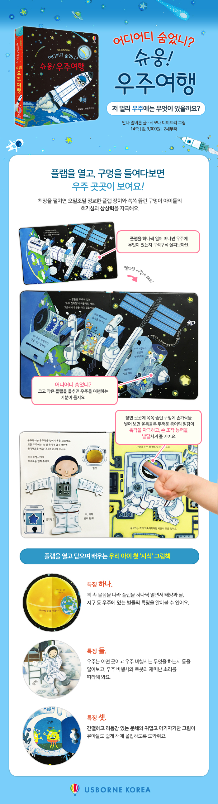 밤하늘에는 무엇이 있나요? 저 멀리 우주에는 무엇이 있을까요? 달에는 무엇이 있을까요? 우주 정거장에서는 무엇을 하고 있을까요? 왜 우주에서는 우주복을 입어야 해요? 로봇은 우주에서 무슨 일을 하나요? 우주에도 누군가 살고 있을까요? 단순한 물음에서 시작해 점차 깊이를 더해 가는 책 속 질문을 따라 플랩을 하나씩 열어 보세요. 우주의 신비로운 광경과 우주를 탐사하는 방법을 하나씩 차근차근 알아갈 수 있어요. 간결하고 리듬감 있는 문체와 귀엽고 아기자기한 그림이 유아들도 쉽게 책에 몰입하도록 도와주지요. 플랩을 열고 닫으며 지식을 쏙쏙 얻을 수 있답니다. |