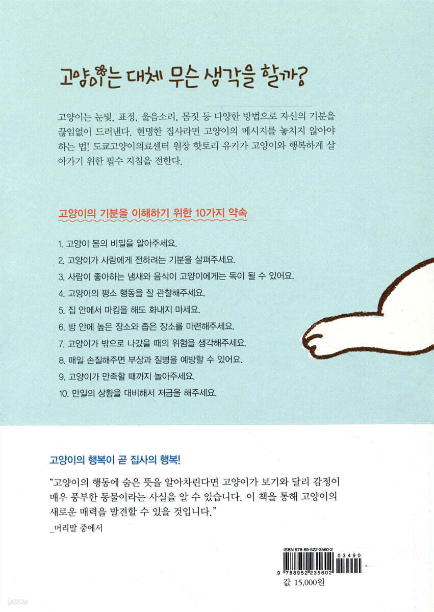 많은 개들이 주인에게서 맛있는 음식과 따뜻한 잠자리를 제공받고, 매우 깊은 사랑까지 받고 있습니다. 그래서 개는 주인을 ‘신’처럼 생각한다고 합니다. 그러면 고양이는 어떨까요? 고양이도 개와 마찬가지로 주인에게서 맛있는 음식과 따뜻한 잠자리와 매우 깊은 사랑을 받습니다. 그래서 고양이는 자기 자신을 ‘신’처럼 생각한다고 합니다. 이 이야기는 어디까지나 우스갯소리이지만 고양이의 기분을 잘 나타내는 재미있는 이야기라 생각합니다. 고양이는 주인을 어쩌면 순종적인 하인으로 생각하고 있는지도 모릅니다. 그런 고양이와 함께 생활하면서 ‘고양이의 기분을 어떻게 이해할까?’, ‘고양이가 자주 하는 행동의 진의는 무엇일까?’, ‘사랑하는 고양이가 건강하게 살려면 어떻게 해야 좋을까?’, ‘고양이에게 더 사랑받으려면 어떻게 해야 할까?’ 등을 고민해본다면 서로가 건강하고 화목한 생활을 할 수 있을 것입니다. 고양이는 ‘무슨 생각을 하는지 알 수 없다.’, ‘기분파라 종잡을 수가 없다.’라고 여겨졌습니다. 그러나 고양이와 함께 생활하는 사람이라면 이는 잘못된 인식이라는 사실을 잘 알고 있을 것입니다. 개에 비해 고양이는 분명 조용한 편이지만 자신의 기분을 여러 가지 수단으로 드러내고 있습니다. 그런 고양이의 메시지를 놓치지 않기 위해서는 약간의 지식과 비결이 필요할 뿐입니다. 『고양이의 기분을 이해하는 법』이 고양이의 기분을 잘 이해하고 고양이에게 사랑받으며 살아갈 수 있도록 도움을 준다면 저자로서 더 바랄 나위가 없습니다. ---「맺음말」중에서 |