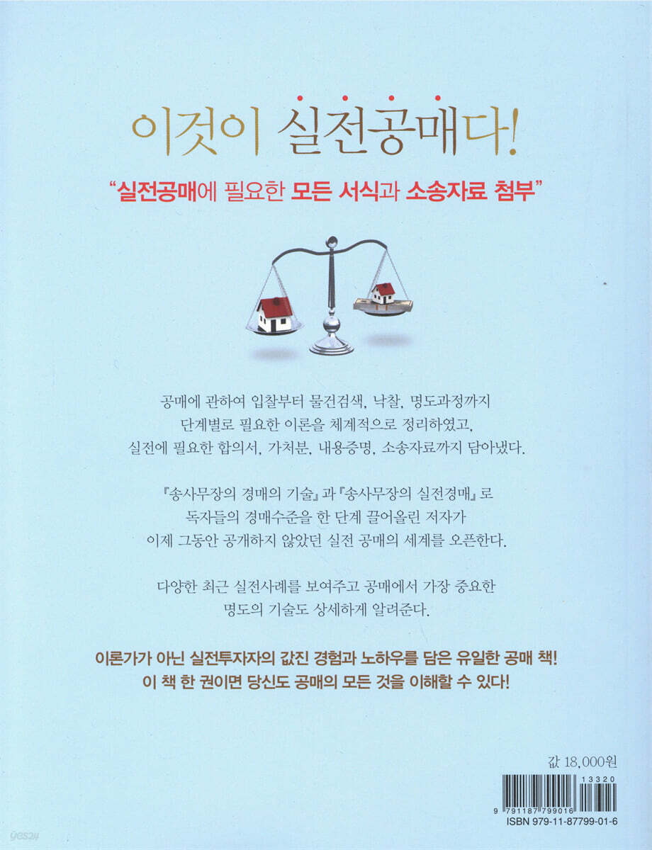 실전 01 · 단돈 700원으로 1,000만 원 벌기 【PART 1】 공매 입문과 매각절차 실전 02 · 공매의 난해한 부분은 경매정보를 활용하라 칼럼 대법원 판례를 실전에 적용하기 【PART 2】 공매부동산의 검색 요령 실전 03 · 투자를 잘하려면 유찰의 원인부터 파악하라 칼럼 낙찰을 잘 받는 방법 【PART 3】 공매부동산의 권리분석 요령 실전 04 · 낙찰을 잘못 받았다면 취소시켜라 【PART 4】 공매부동산의 현장조사 및 입찰 요령 실전 05 · 공매로 상가 매입하기 칼럼 대출을 잘 받는 방법 【PART 5】 공매부동산의 매각결정 실전 06 · 아무도 거들떠보지 않을 때가 진정한 기회다 칼럼 최적의 매도시점은 대체 언제인가? 【PART 6】 공매부동산의 대금납부 및 매각결정 취소 실전 07 · 공매 감정가를 무조건 신뢰하지마라 【PART 7】 공매부동산의 매각대금 배분 실전 08 · 낙찰 받고도 매각결정이 취소되는 경우(지분, 선순위가등기) 【PART 8】 매각부동산의 배분방법 실전 09 · 공매 낙찰 후 다시 소유자에게 취하해주기 【PART 9】 공매부동산의 눈에 보이지 않는 3가지 함정 실전 10 · 신탁공매라는 새로운 분야에 도전하라 【PART 10】 공매부동산의 명도의 기술 실전 11 · 수탁재산 공매로 아파트 50채 주인되기 칼럼 투자가 힘들고 어렵다고 느껴질 때 【PART 11】 공매부동산의 낙찰 후 법적절차 에필로그 글을 마치며 【 자료 】 송사무장이 쓰는 실전서식 서식 1 - 명도확인서(임차인) 서식 2 - 강제집행예정 통보 서식 3 - 배분요구서(임차인) 서식 4 - 매각결정취소 신청서 서식 5 - 합의서(임차인) 서식 6 - 명도합의서(소유자) 서식 7 - 매각결정취소 동의서 서식 8 - 사실확인서 서식 9 - 내용증명(점유자의 명도거부상황) 서식 10 - 내용증명(배분 받는 임차인) 서식 11 - 내용증명(명도소송 예정통보) 서식 12 - 점유이전금지가처분 신청서 서식 13 - 소장(건물명도등 청구의 소) 서식 14 - 최고서(유체동산처분) |