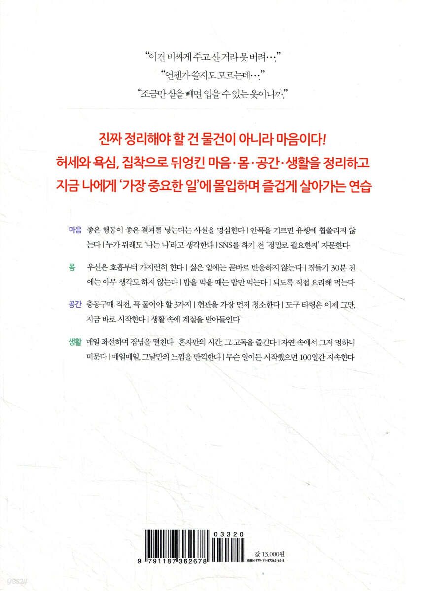 Chapter 1 원래 상태로 되돌아가지 않는 마음 정리 01 나만의 안목을 기른다 01 좋은 행동이 좋은 결과를 낳는다 02 만족을 모르는 ‘마음 대사증후군’에 주의한다 03 인간은 누구나 맑고 깨끗한 존재 04 안목을 기르면 유행에 휩쓸리지 않는다 05 누가 뭐래도 ‘나는 나’라고 생각한다 06 나만의 정신을 담아 인생 작품을 만든다 07 스스로 해야 할 일을 묻고 하루하루를 담담히 보낸다 08 몸을 움직이고 땀을 흘리면 얻을 수 있는 것 09 ‘해야 한다’고 생각하면 즉시 행한다 10 과정을 중시하면 다음으로 이어진다 11 SNS를 하기 전, ‘정말로 필요한지’ 자문한다 Chapter 2 원래 상태로 되돌아가지 않는 마음 정리 02 마음을 ‘지금 여기’로 돌려놓는다 12 지금 이 순간을 있는 힘껏 살아간다 13 현관의 신발부터 가지런히 14 눈물이 나올 만큼 진심을 다한다 15 순수한 마음으로 지금 하는 일에 몰두한다 16 ‘다음에 해야지’는 하지 않겠다는 것과 마찬가지 17 작은 목표부터 세우고 날마다 노력한다 18 광고 말고 나에게 필요한 정보에 집중한다 19 불필요한 것은 아예 쳐다보지 않는다 20 비교는 자기 자신만 괴롭히는 일 21 자신의 단점보다는 장점에 집중한다 22 때로는 모호해도 괜찮다 23 일본 라면이 세계적으로 성공한 진짜 이유 Chapter 3 원래 상태로 되돌아가지 않는 몸 정리 늘 바른 자세로 느긋하게 행동한다 24 우선은 호흡부터 가지런히 25 하루에 단 5분이라도 마음을 텅 비운다 26 싫은 일에는 곧바로 반응하지 않는다 27 사경과 사불로 집중력을 기른다 28 잠들기 30분 전에는 아무 생각도 하지 않는다 29 매일 합장하며 자기 자신과 마주한다 30 폭음과 폭식을 막는 가장 좋은 방법, 감사 31 밥을 먹을 때는 밥만 먹는다 32 되도록 직접 요리해 먹는다 33 일주일에 한 번은 사찰음식을 만들어 먹는다 34 휴일에는 시계 없이 생활한다 35 가까운 곳에서 소소한 순례를 즐기다 36 가이드북 없이 여행지를 걸어 다닌다 Chapter 4 원래 상태로 되돌아가지 않는 공간 정리 매일 청소하며 자기 자신을 닦는다 37 충동구매 직전, 스스로에게 꼭 물어야 할 것 38 사람은 빈손으로 태어나 빈손으로 떠난다 39 매일매일 청소를 통해 음덕을 쌓는다 40 해야 할 일에 얽매이지 말고 눈앞의 일에 집중한다 41 생활 속에 계절을 받아들인다 42 도구 타령은 그만, 지금 바로 시작한다 43 청소를 하며 마음도 닦는다 44 기분 좋은 시작을 위해 작업 공간은 매일 정리한다 45 현관을 가장 먼저 청소해야 하는 이유 46 아침 5분 청소로 하루를 쾌적하게 47 당신의 방이 곧 당신의 마음이다 48 3년간 쓰지 않은 물건은 버리거나 리폼한다 Chapter 5 원래 상태로 되돌아가지 않는 생활 정리 불필요한 것을 꾸준히 줄여 나간다 49 좌선으로 잡념을 떨쳐 버린다 50 혼자만의 시간, 그 고독을 즐긴다 51 자연 속에서 그저 멍하니 머문다 52 끊임없이 한 가지 일에 정진해 본다 53 예술 작품, 만든 이의 마음으로 감상한다 54 공덕을 바라지 않고 오로지 행실을 갈고닦는다 55 무슨 일이든 시작했으면 100일간 지속한다 56 배우자는 조건보다 가치관이 같은 사람으로 57 일본의 다도 스승 센노리큐의 7가지 손님맞이법 58 일일시호일, 날마다 즐겁고 기쁜 날 |