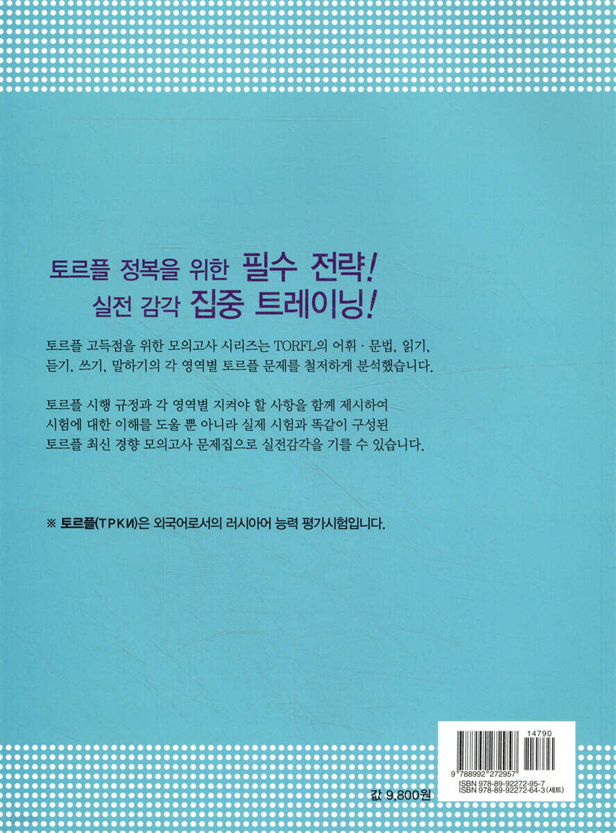 -러시아 현지에서 사용하고 있는 토르플 교재를 토대로 만들어졌으며 수록된 답안지 역시 실제 시험 방식 그대로 제작되어 학습자 스스로 토르플 시험을 치러 볼 수 있도록 하였다. 2. 듣기 영역 MP3파일 무료 다운로드 및 QR코드 바로 듣기 가능 -뿌쉬낀하우스 홈페이지를 통해 듣기 영역 MP3파일을 무료로 다운로드받을 수 있으며, 표지에 있는 QR코드를 스마트폰으로 스캔하면 듣기 및 말하기 영역 오디오 파일을 바로 들을 수 있다. 3. 쓰기, 말하기 영역 예시 답안 제시 -객관식 문제와는 달리 하나의 답이 정해져 있지 않은 쓰기, 말하기 영역은 문제별 2가지 예시 답안을 통해 출제 의도에 알맞은 방향을 제시하였다. ** 토르플 고득점을 위한 모의고사 시리즈 100% 활용 TIP!! -각 영역별로 정해져 있는 시험 시간, 사전 활용 여부 등 영역별 시험 규정을 지키세요. -교재 뒷부분에 수록되어 있는 토르플 답안지에 답을 작성하세요. 실제로 시험을 치를 때 답안지 작성에 소요되는 시간을 함께 확인해 볼 수 있습니다. -정확한 실력 테스트를 위해 듣기 영역을 진행할 때에는 오디오 파일을 멈추거나 반복 청취하지 마세요. |