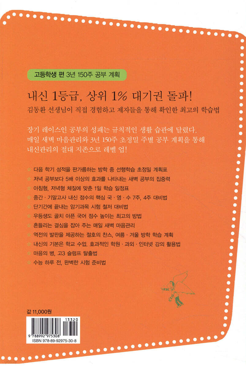 프롤로그 1학년 3월 1주_ 이제는 고등학생, 뚜렷한 목표 세우기 3월 2주_ 본격적인 수업 시작, 예습은 필수 3월 3주_ 중간고사 준비 시작, 마음관리로 능률 올리기 3월 4주_ 중간고사 범위까지 국·영·수 끝내기 4월 1주∼4월 2주_ 암기 과목 멋지게 정리하기 4월 3주_ 중간고사 일주일 전, 마무리 공부 하기 4월 4주_ 중간고사 기간 5월 1주_ 희망의 시기, 공부 시간과 노는 시간의 배분 5월 2주_ 영어와 수학 공부 가속도 내기 5월 3주_ 내면의 나와 대화하는 시간, 올바른 이성관 정립하기 5월 4주_ 공부 리듬을 깨지 않으며 여가 즐기기 6월 1주_ 슬럼프 극복하기 6월 2주_ 기말고사 준비에 들어가기 6월 3주∼7월 1주_ 기말고사 준비 시기, 30일 특별 계획 7월 2주_ 기말고사 기간, 마음관리에 힘쓰기 7월 3주_ 여름방학 계획 세우기 7월 4주∼8월 3주_ 여름방학 기간 8월 4주∼9월 2주_ 국·영·수 복습 위주의 기간 9월 3주∼10월 2주_ 2학기 중간고사 준비 기간 10월 3주_ 2학기 중간고사 기간 10월 4주∼11월 1주_ 재충전과 보완의 시기 11월 2주∼12월 1주_ 기말고사 준비 기간 12월 2주_ 기말고사 기간 12월 3주∼12월 4주_ 겨울방학의 시작 12월 4주∼2월 4주_ 겨울방학 기간 2학년 3월 1주∼3월 2주_ 새로운 반 분위기에 적응하는 시기 3월 3주∼4월 2주_ 중간고사 준비 기간 4월 3주_ 중간고사 기간 4월 4주∼6월 1주_ 도약할 수 있는 절호의 기회 6월 2주∼7월 1주_ 기말고사 시스템 가동 시작 7월 2주_ 자기 절제와 인내를 배우는 특별 기간 7월 3주_ 기말고사가 끝난 뒤의 기간 7월 4주∼8월 3주_ 여름방학 기간 8월 4주_ 여름방학 마무리 9월 1주∼9월 2주_ 2학기, 가뿐하게 시작하기 9월 3주∼10월 2주_ 암기 과목 완전 정복 10월 3주_ 마음관리에 힘쓰며 최선을 다한다! 10월 4주∼11월 1주_ 인내, 인생의 귀한 보물 11월 2주∼12월 1주_ 최선을 다해 기말고사 준비 12월 2주_ 기말고사 기간 12월 3주_ 휴식 시간 12월 4주∼2월 4주_ 겨울방학 기간 3학년 3월 1주∼3월 2주_ 본격적인 수험생 마음관리 시간 갖기 3월 3주∼4월 2주_ 중간고사 준비 기간, 실력별 특별 시험 준비 전략 4월 3주_ 중간고사 기간 4월 4주∼6월 1주_ 마음과 건강을 다잡는 시기, 고3 첫 번째 승부처 6월 2주∼7월 1주_ 기말고사 준비하기 7월 2주_ 기말고사 기간 7월 3주_ 숨을 고르며 여름방학 공부 준비하기 7월 4주∼8월 3주_ 본격적인 보완 작업 시작 8월 4주∼9월 4주_ 마무리의 시작 10월 1주_ 중간고사 기간, 생활 리듬을 유지하며 최선을 다하기 10월 2주∼11월 1주_ 대학입시 한 달 전 시험 전날 시험 당일 시험 이후 글을 마치며 부록_ 다니엘 아침형 Study Map |