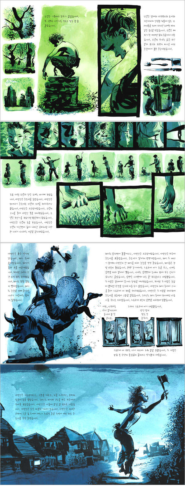‘책 속의 책’이라는 독특한 설정으로 풀어낸 뛰어난 작품! 카네기 상, 휘트브레드 상, 스마티즈 상, 마이클 프린츠 상 등 영국과 미국의 주요 아동청소년 문학상을 받은 작가 데이비드 알몬드, 『금붕어 두 마리와 아빠를 바꾼 날』, 『코랄린』, 『벽 속에 늑대가 있어』 등을 그린 천재화가 데이브 맥킨, 두 거장이 만났다! * 글쓰기를 통해 마음속 슬픔과 상처를 극복해 가는 한 소년의 성장기! 이제 블루에게 유일한 희망은 글쓰기뿐이다! 『손도끼를 든 아이』는 참으로 독특한 작품이다. 딱 꼬집어 이것이라고 장르를 논하기가 어렵다. 어떻게 보면 그림책으로도 볼 수 있고, 또 어떻게 보면 아동용 동화나 청소년을 위한 그래픽노블로도 볼 수 있다. 그렇지만 장르가 무엇이든 가장 중요한 점은 그 안에 담겨 있는 내용이다. 이 작품을 한 마디로 말하면, 글쓰기를 통해 마음속 슬픔과 상처를 극복해 가는 한 소년의 성장기라고 할 수 있다. 가족과 행복하게 살던 블루는 갑자기 아빠를 잃는다. 설상가상으로 동네 골목대장인 호퍼의 괴롭힘은 날이 갈수록 더욱 심해진다. 블루의 마음속엔 슬픔과 분노가 쌓여가지만 마땅히 해결할 방법이 없다. 블루는 태어나서 처음으로 함께 이야기할 사람이 아무도 없다는 지독한 외로움을 느낀다. 그러던 어느 날, 블루는 글을 쓰기 시작한다. 처음에는 상담 선생님의 권유로 이야기를 썼지만 이제는 오직 자신만을 위해서 이야기를 쓴다. 마법사와 요정이 나오고 해피엔딩으로 끝나는 이야기가 아니라 피와 내장과 모험이 등장하는 진짜 이야기 『손도끼를 든 아이』를 쓴다. 현실 세계는 동화하고 다르니까. 아빠가 죽고, 마을 골목대장인 호퍼가 괴롭히기 시작한 뒤로 블루에게 유일한 희망은 글쓰기뿐이다. 블루는 자신의 슬픔과 외로움과 분노와 증오심을 모두 담아 ‘야만인’이라는 주인공을 창조해낸다. 야만인은 블루가 현실 세계에서 할 수 없는 일들을 척척 해낸다. 이야기 안에서 야만인은 그 누구도 겁내지 않고 당당하게 살아간다. 그러다 어느 순간 상상의 세계와 현실의 세계가 혼재되기 시작하고, 상상이 현실이 되어 나타난다. 드디어 야만인과 만난 블루는 야만인의 그림을 통해, 야만인과의 한바탕 소동을 통해 현실 세계와 화해하고, 마음속 슬픔과 분노를 훌훌 털어버리게 된다. 비록 글쓰기는 끝나고 야만인은 사라졌지만 당당하게 현실 세계에 뿌리내린 블루는 더 이상 흔들리지 않을 것이다. 이 모두가 글쓰기의 힘이다. * 과연 이런 책을 우리 아이들에게 보여줘도 괜찮단 말인가? 어린이문학의 정형성을 과감히 벗어던진 작품! 『손도끼를 든 아이』를 만난 독자들은 가장 먼저 표지에서부터 엄청난 충격을 받게 될지도 모른다. 한 손에는 칼을 들고, 또 다른 한 손에는 손도끼를 들고 울부짖는 아이의 모습이라니. 더구나 아이의 몸은 시퍼런 색이다. 표지의 강렬함에 놀란 가슴을 진정시키기도 전에 자기를 본 사람을 쫓아가 해치우고 살을 발라 먹은 다음 뼈는 채굴장의 환기 구멍에 버리는 야만인의 사납고 난폭함에 다시 한 번 몸서리를 치게 될지도 모른다. 아니, 이런 잔인한 책이 어린이문학이란 말인가? 과연 이런 책을 우리 아이들에게 보여줘도 괜찮단 말인가? 하고 분노할지도 모른다. 하지만 흥분하기에 앞서 우선 이 책을 찬찬히 읽어보기를 권한다. 이 책을 처음부터 끝까지 정독한 독자라면 이내 블루의 슬픔에 공감하고, 야만인의 분노에 고개를 끄덕이게 될 것이다. 그러곤 블루와 야만인이 만나 블루가 모든 슬픔과 분노를 떨쳐내고 현실 세계와 화해하고 당당한 아이로 일어서는 모습에 아낌없는 박수를 보내게 될 것이다. ‘책 속의 책’ 이야기, 그러니까 블루가 쓴 이야기에만 등장하는 데이브 맥킨의 일러스트는 블루의 마음속 야만인의 모습을 너무나도 뛰어나게 표현하고 있다. 그리고 데이비드 알몬드는 상상과 현실을 오가며 블루의 상처가 치유되는 과정을 아름다우면서도 자연스럽게 그려내고 있다. 그러기에 블루의 마음속 슬픔과 분노를 나타내는 또 다른 자아인 야만인이 결코 잔인한 존재가 아니라 오히려 서글프고 안타깝게 느껴진다. 이렇듯 『손도끼를 든 아이』는 지금까지 어린이문학의 판에 박힌 틀을 과감히 벗어던진다. 아이들은 언제까지나 착하고 순수하기만 한 존재가 아니다. 그들도 슬픔과 분노와 증오심을 느낄 수 있고, 그것들을 터뜨릴 공간이 필요하다. 다행히 블루는 글쓰기를 통해 자신의 감정을 다스리고 상처를 치유해 당당한 아이로 성장하였다. 하지만 그런 공간을 찾지 못한 아이들은 어떻게 될까? 상상만으로도 끔찍하다. 아이들이 슬픔을 표현하고, 분노를 터뜨리고, 증오심을 해소할 수 있는 계기나 공간을 만들어 주는 것, 그것은 당연히 우리 어른들의 몫일 것이다. * 영국과 미국의 주요 아동청소년 문학상을 받은 데이비드 알몬드, 『금붕어 두 마리와 아빠를 바꾼 날』과 『코랄린』등을 그린 데이브 맥킨, 드디어 두 거장이 만났다! 책과콩나무에서 출간된 『손도끼를 든 아이』는 데이비드 알몬드와 데이브 맥킨이라는 두 거장이 만나 작업한 것만으로도 수많은 화제를 불러온 작품이다. 데