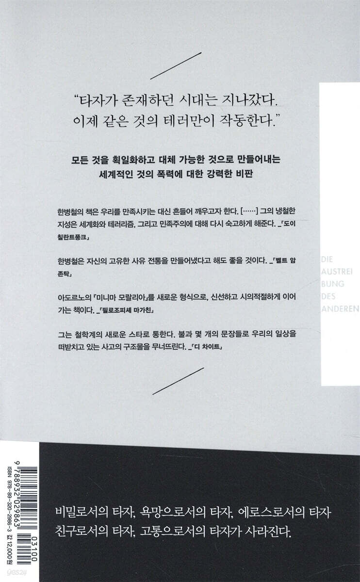 타자가 존재하던 시대는 지나갔다. 비밀로서의 타자, 유혹으로서의 타자, 에로스로서의 타자, 욕망으로서의 타자, 지옥으로서의 타자, 고통으로서의 타자가 사라진다. 오늘날 타자의 부정성은 같은 것의 긍정성에 밀려나고 있다. 같은 것의 창궐이 사회체社會體를 덮치는 병리학적 변화들을 낳는다. 박탈이나 금지가 아니라 과잉소통과 과잉소비가, 배제와 부정이 아니라 허용과 긍정이 사회체를 병들게 한다. 억압이 아니라 우울이 오늘날의 병적인 시대의 기호다.--- p.7